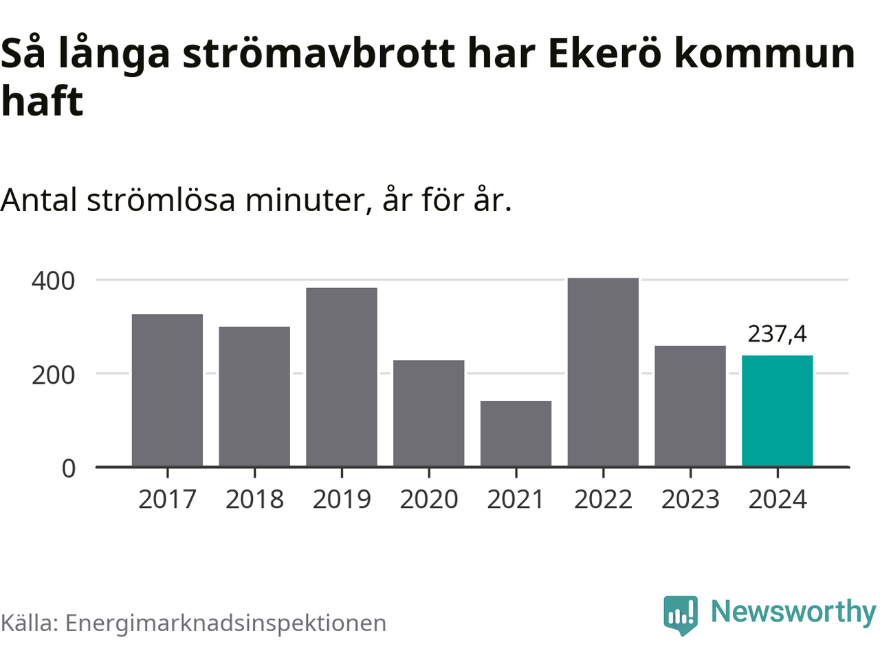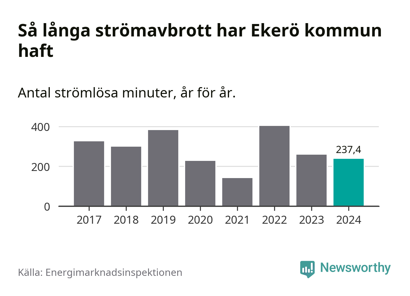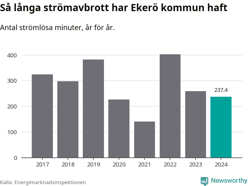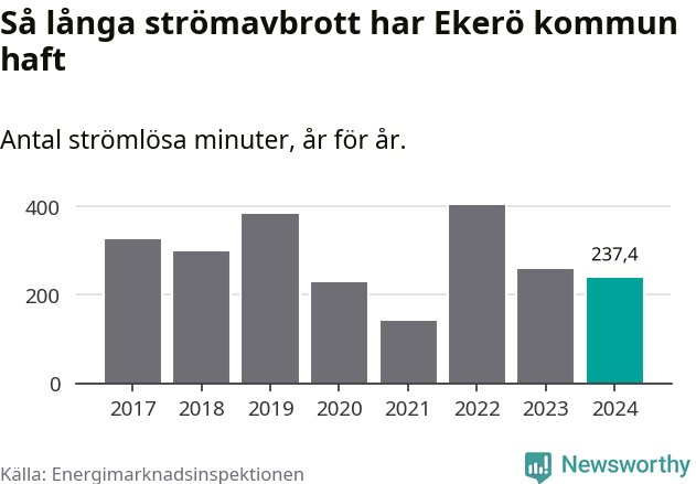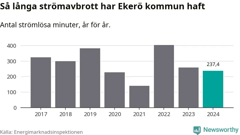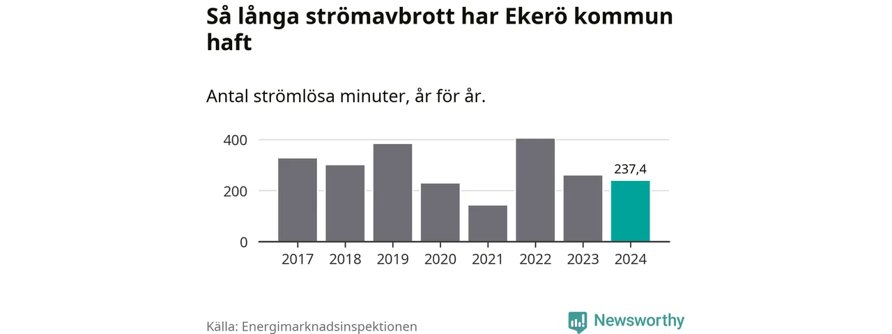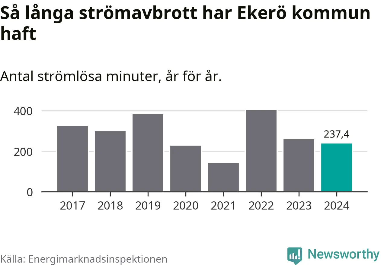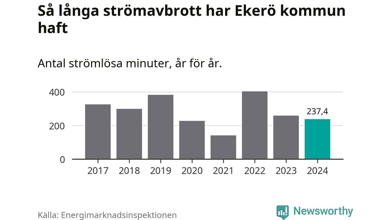 Antalet strömavbrott och total strömlös tid varierar något från år till år i Ekerö kommun. Mest tid utan ström (i alla fall under perioden 2017–2024) fick Ekeröborna genomleva under 2022 – sex timmar och 43 minuter. Det är två timmar och fyra minuter längre än under ett normalår.