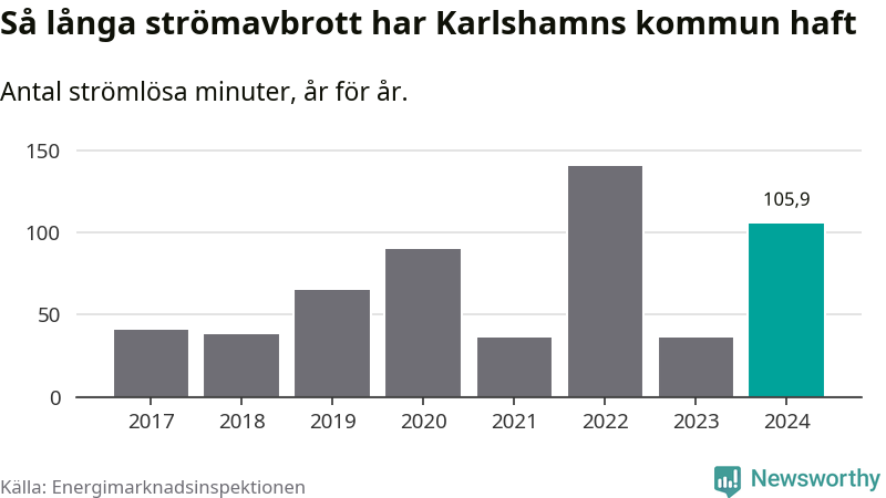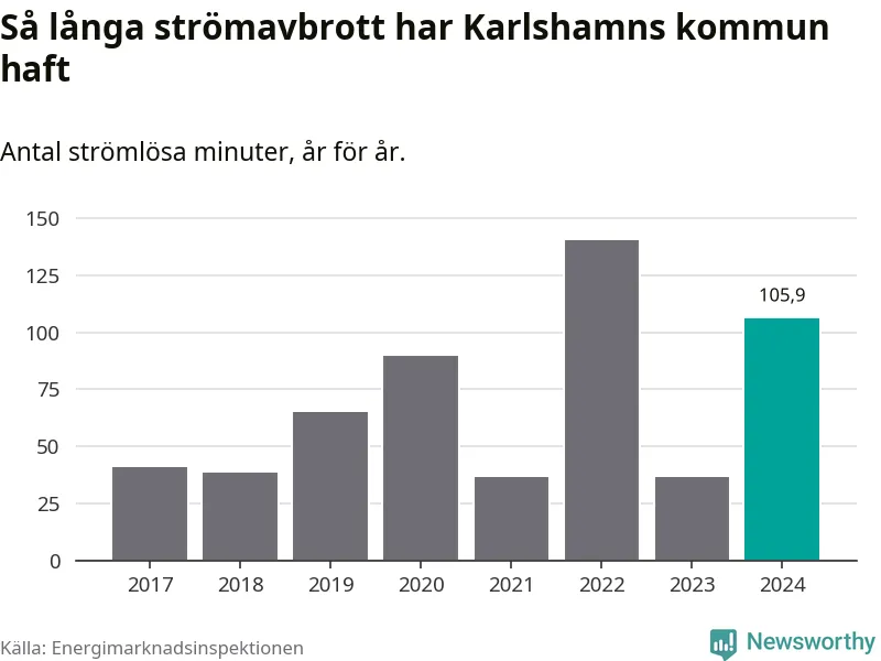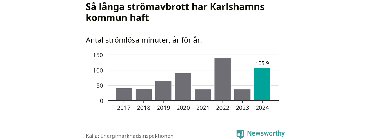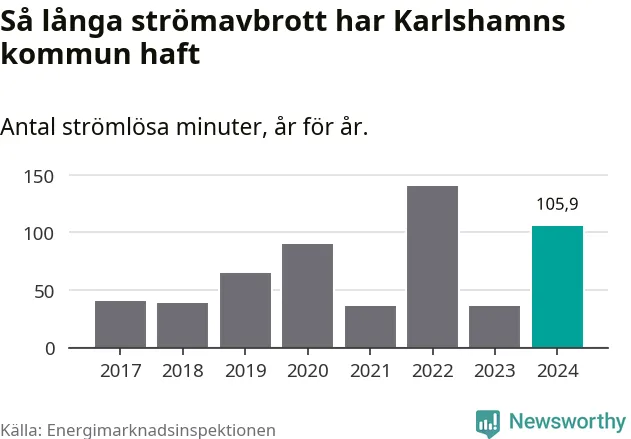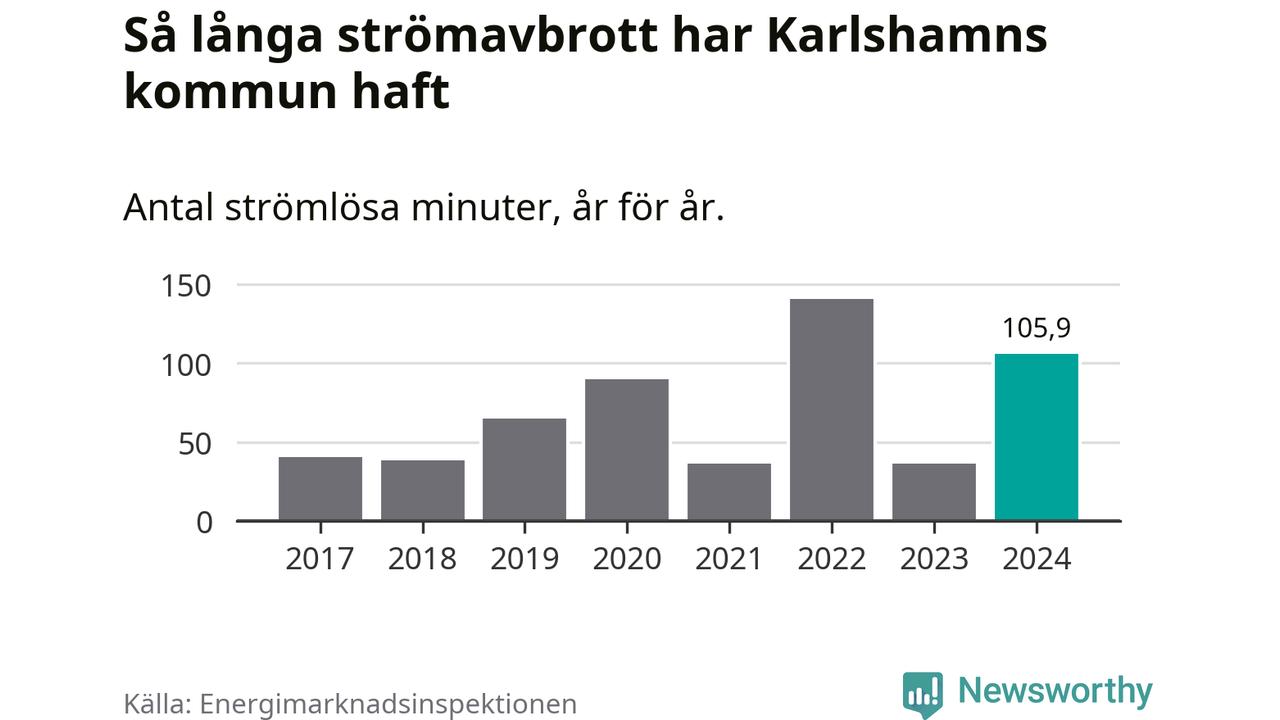 Antalet strömavbrott och total strömlös tid varierar från år till år i Karlshamns kommun. Mest tid utan ström (i alla fall under perioden 2017–2024) fick Karlshamnsborna genomleva under 2022 – två timmar och 21 minuter. Det är en timme och 28 minuter längre än under ett normalår.