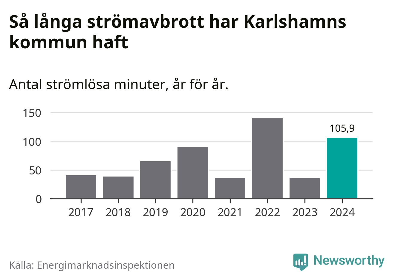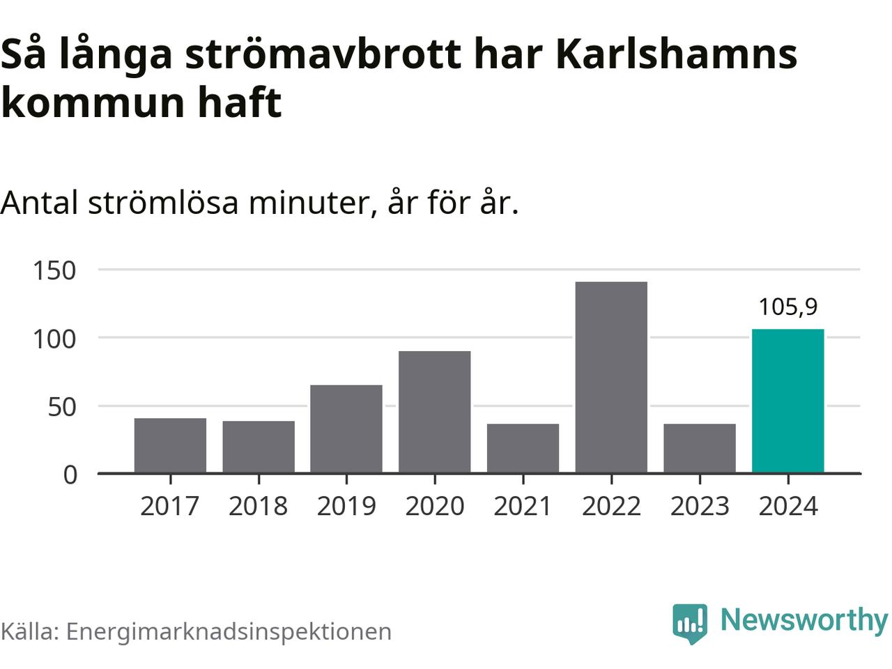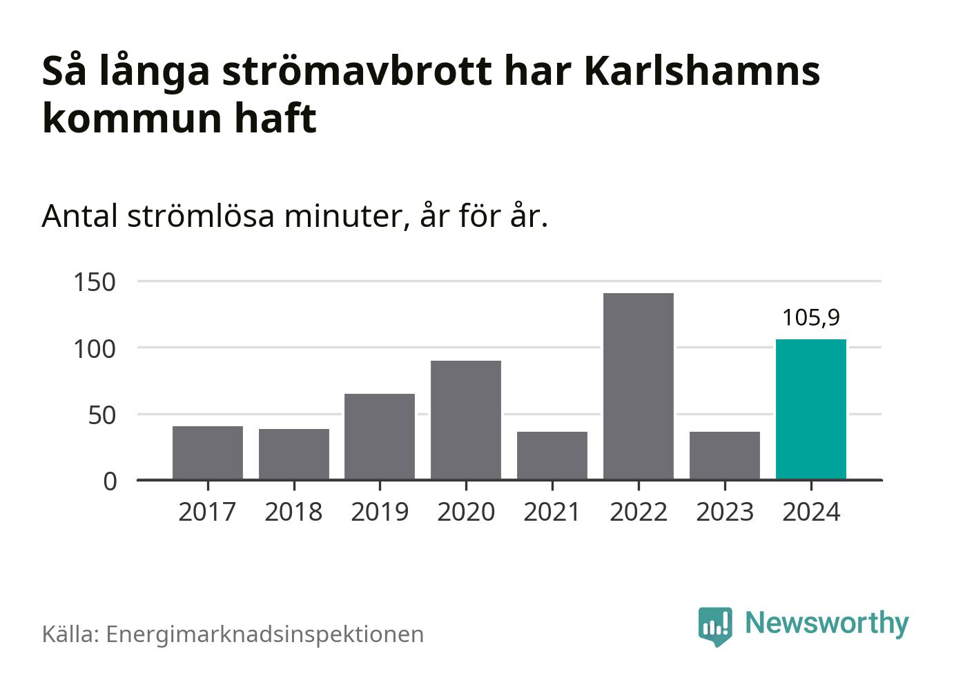 Antalet strömavbrott och total strömlös tid varierar från år till år i Karlshamns kommun. Mest tid utan ström (i alla fall under perioden 2017–2024) fick Karlshamnsborna genomleva under 2022 – två timmar och 21 minuter. Det är en timme och 28 minuter längre än under ett normalår.