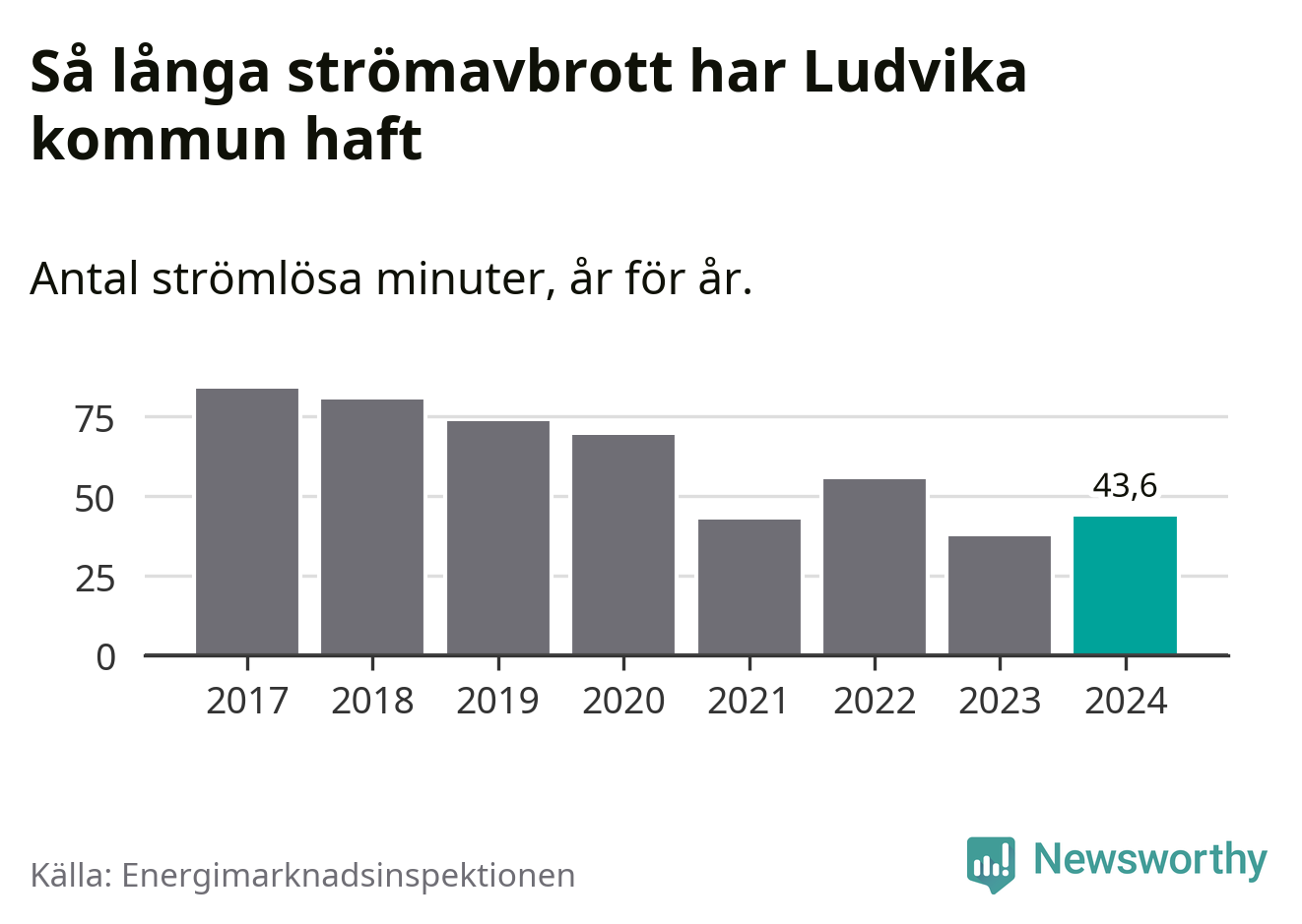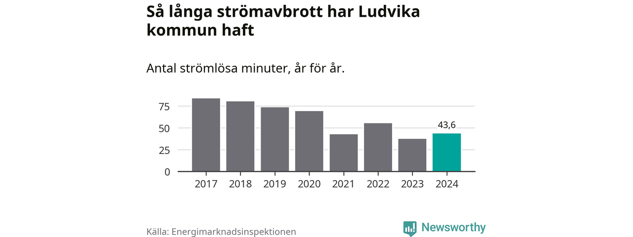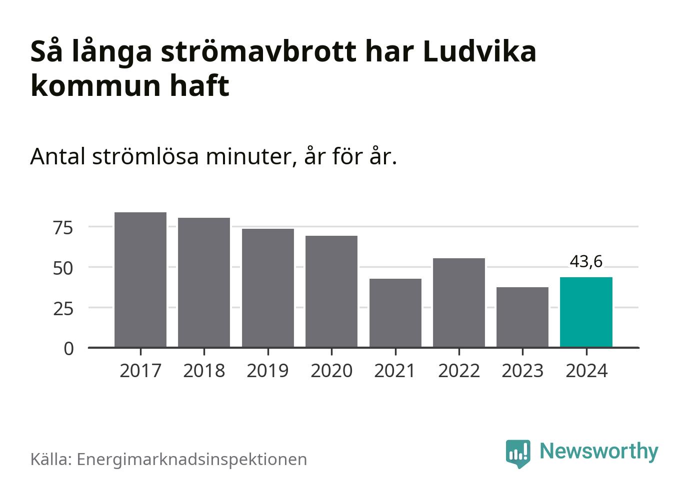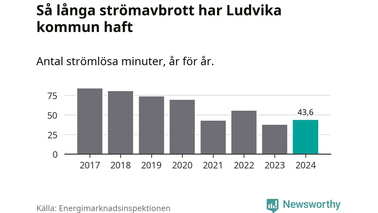 Antalet strömavbrott och total strömlös tid varierar något från år till år i Ludvika kommun. Mest tid utan ström (i alla fall under perioden 2017–2024) fick Ludvikaborna genomleva under 2017 – en timme och 24 minuter. Det är 21 minuter längre än under ett normalår.