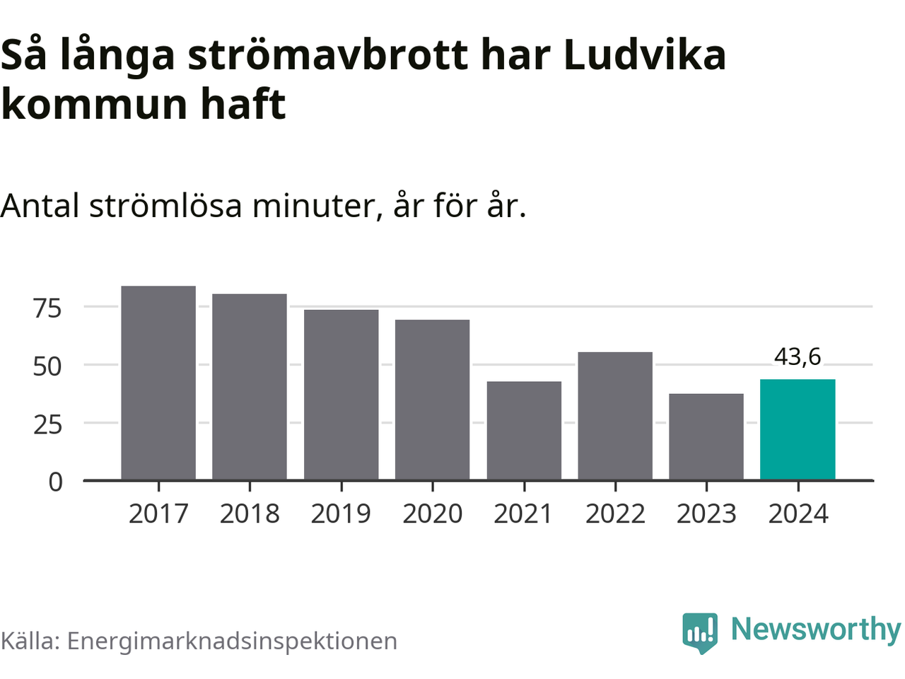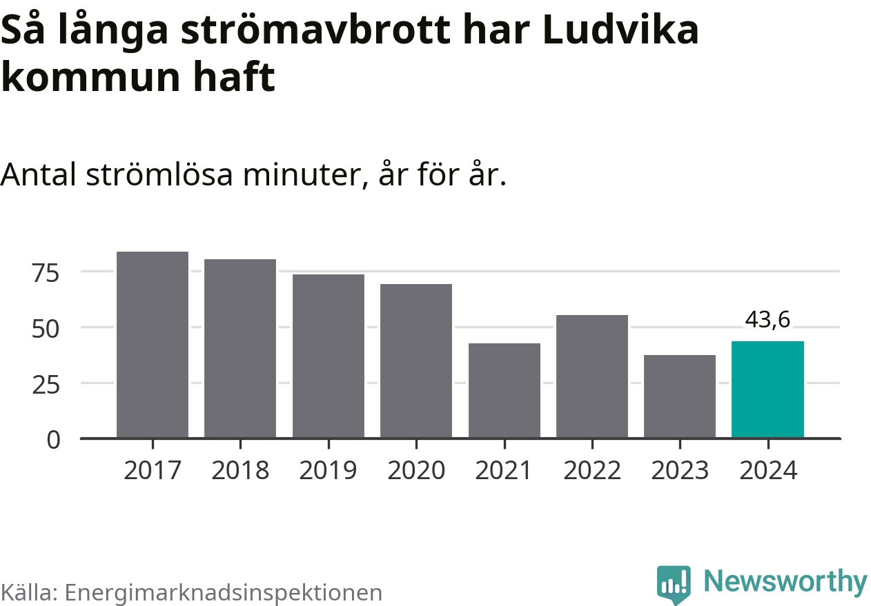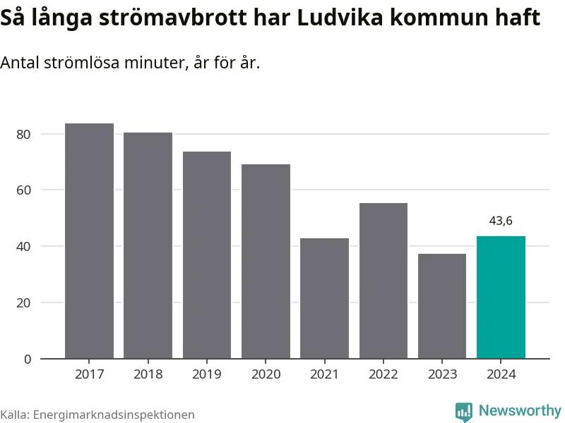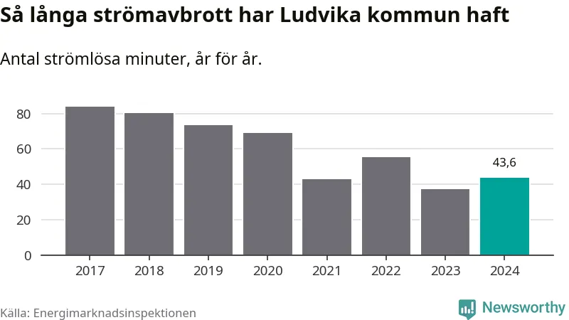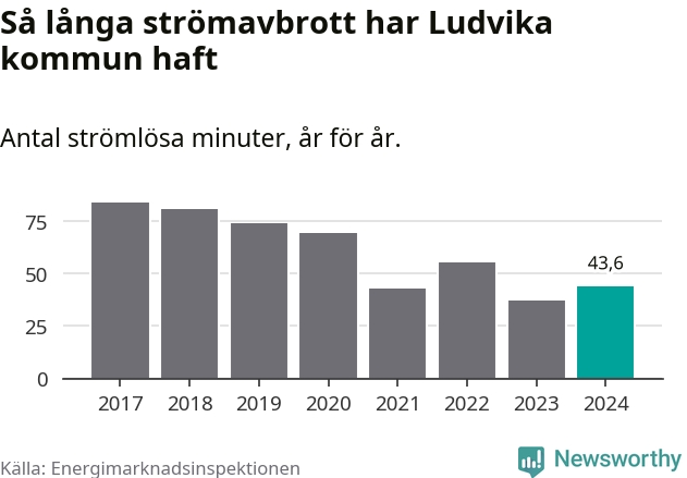Antalet strömavbrott och total strömlös tid varierar något från år till år i Ludvika kommun. Mest tid utan ström (i alla fall under perioden 2017–2024) fick Ludvikaborna genomleva under 2017 – en timme och 24 minuter. Det är 21 minuter längre än under ett normalår.