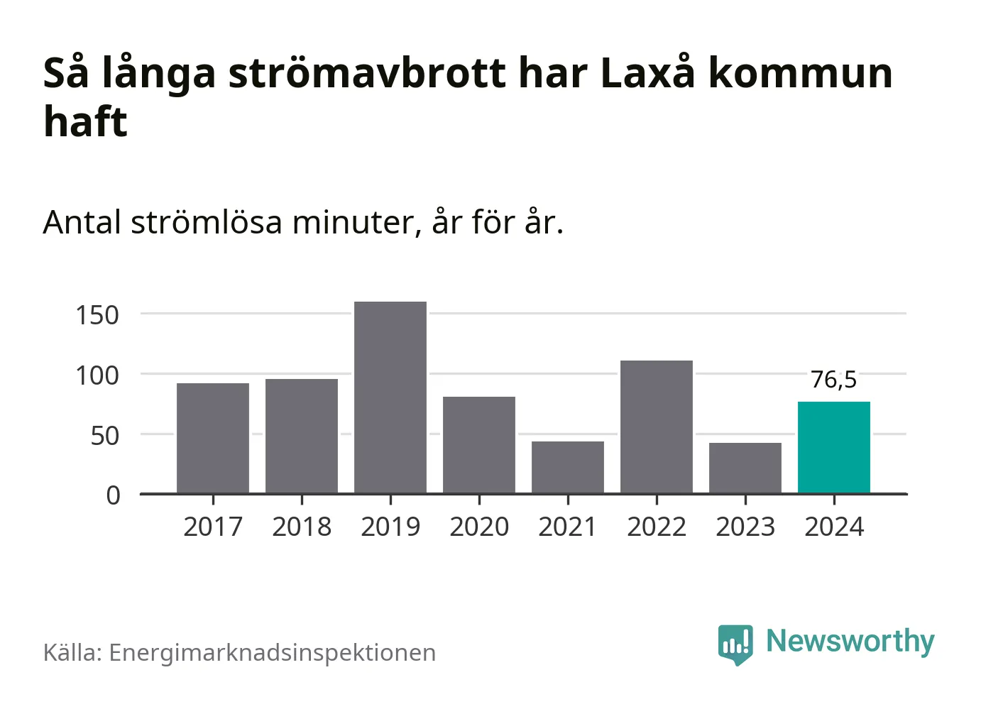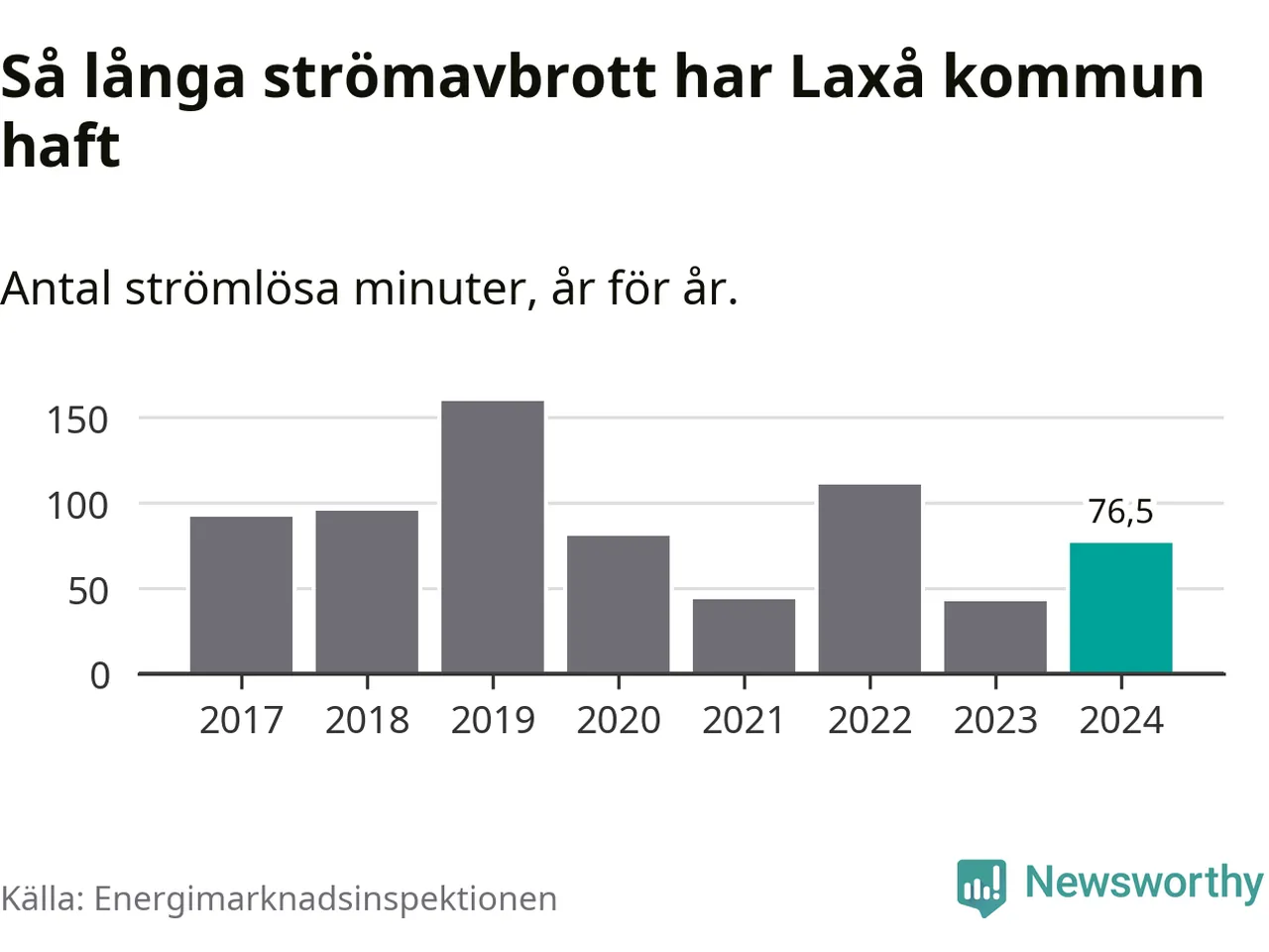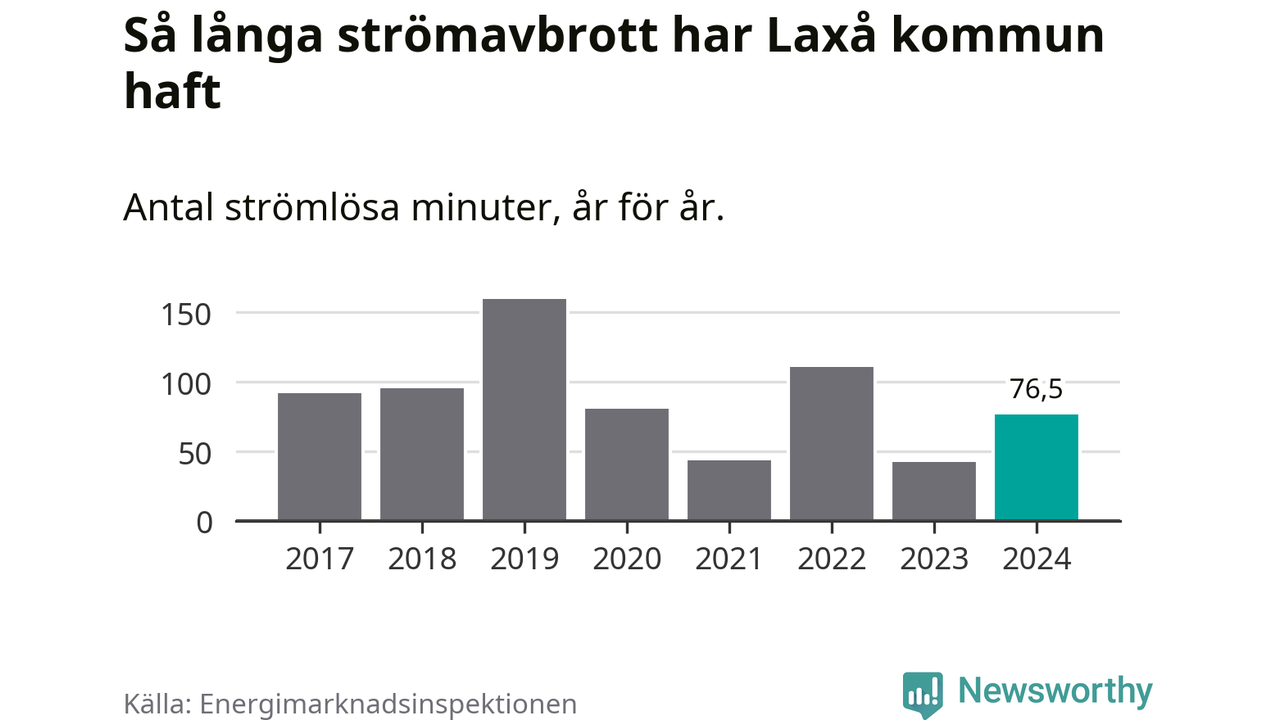 Antalet strömavbrott och total strömlös tid varierar något från år till år i Laxå kommun. Mest tid utan ström (i alla fall under perioden 2017–2024) fick Laxåborna genomleva under 2019 – två timmar och 40 minuter. Det är en timme och 13 minuter längre än under ett normalår.