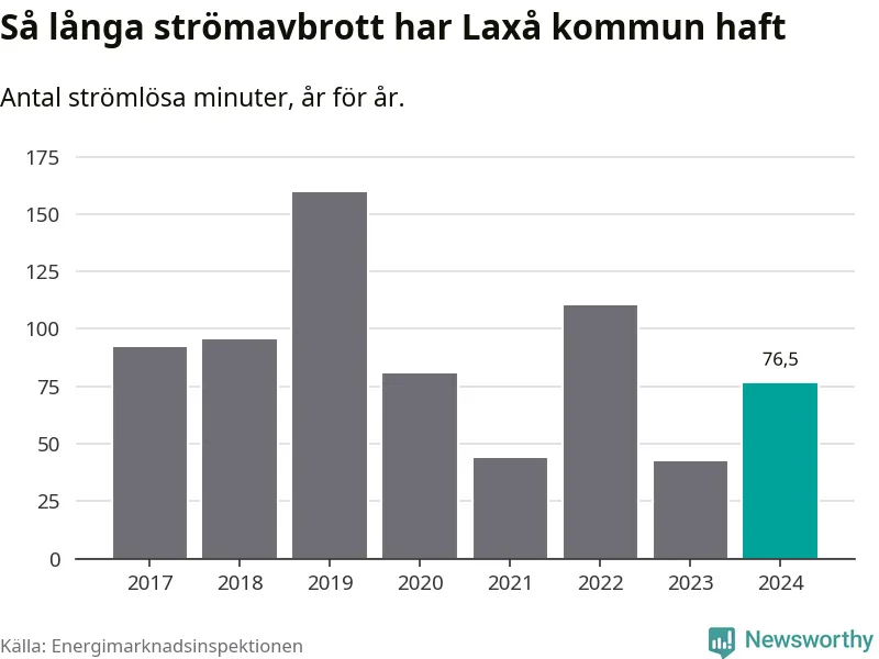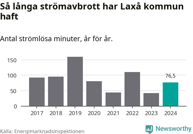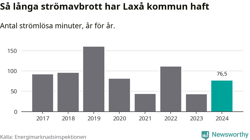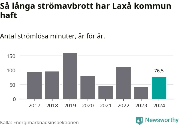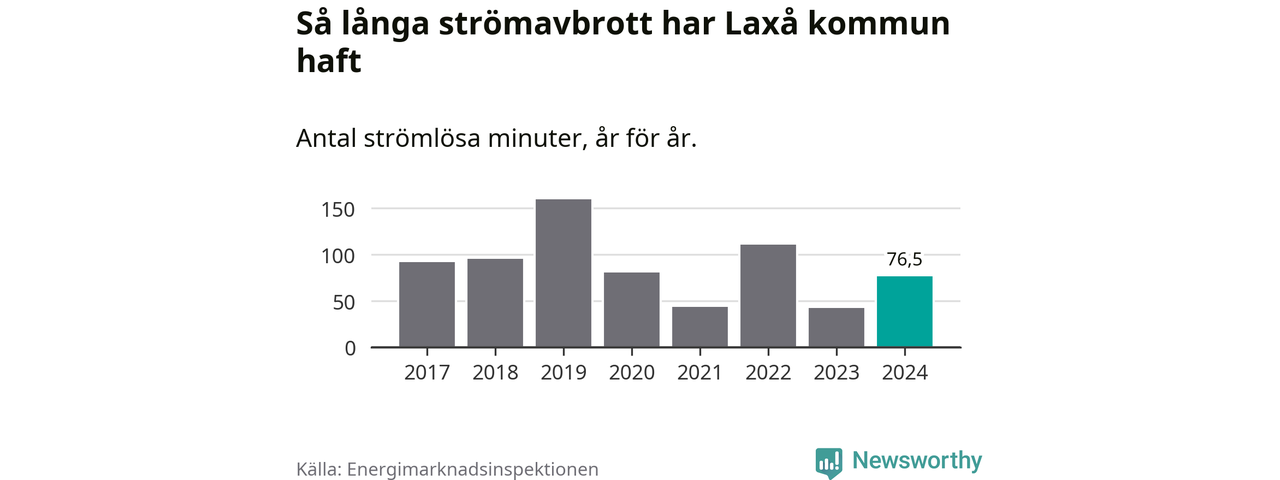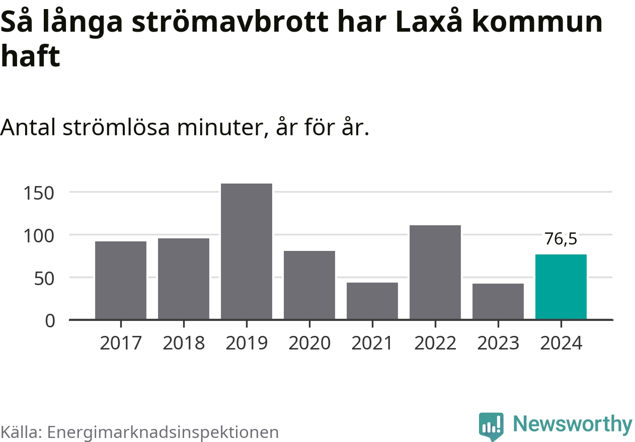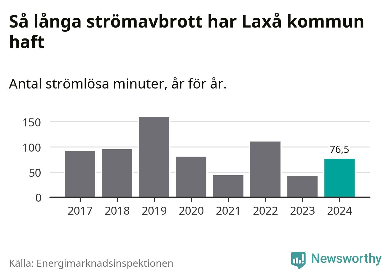 Antalet strömavbrott och total strömlös tid varierar något från år till år i Laxå kommun. Mest tid utan ström (i alla fall under perioden 2017–2024) fick Laxåborna genomleva under 2019 – två timmar och 40 minuter. Det är en timme och 13 minuter längre än under ett normalår.