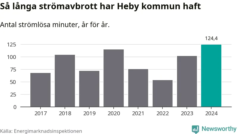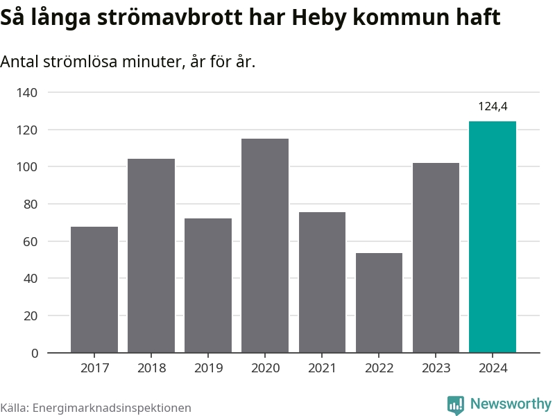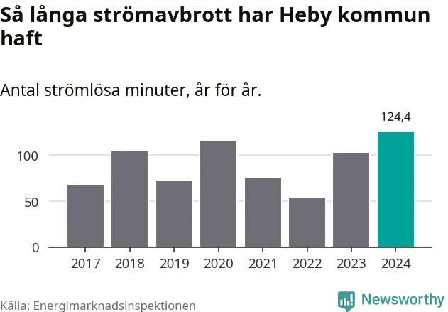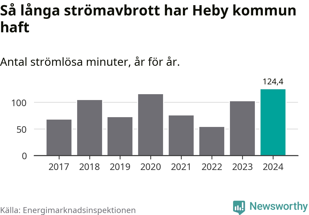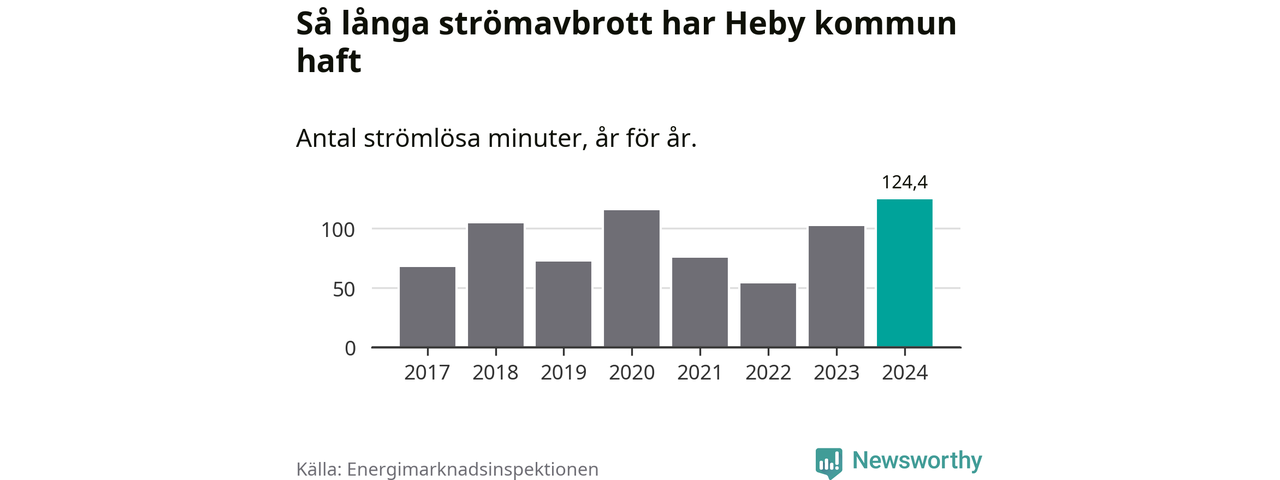 Antalet strömavbrott och total strömlös tid varierar något från år till år i Heby kommun. Mest tid utan ström (i alla fall under perioden 2017–2024) fick Hebyborna genomleva under 2024 – två timmar och fyra minuter. Det är 36 minuter längre än under ett normalår.