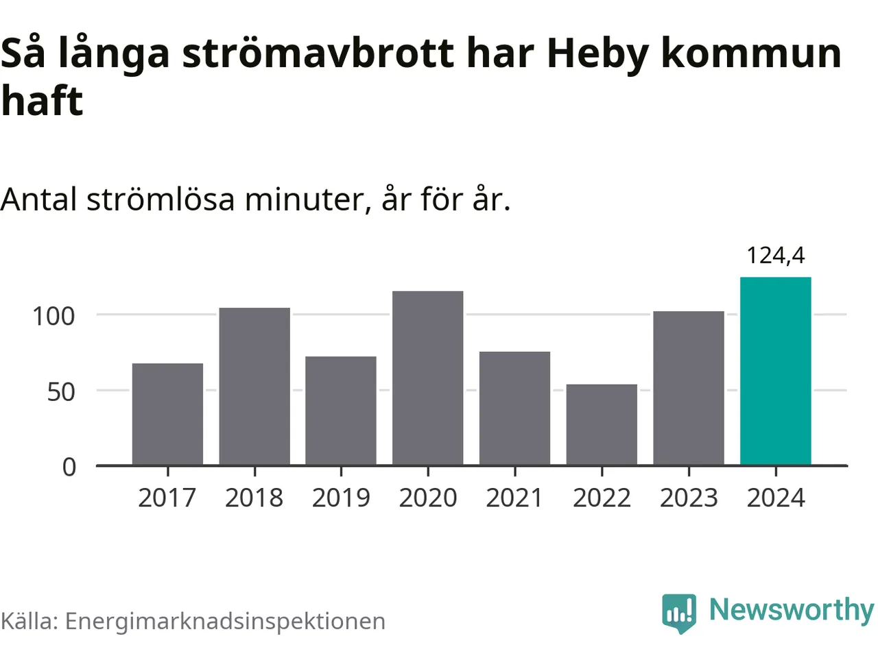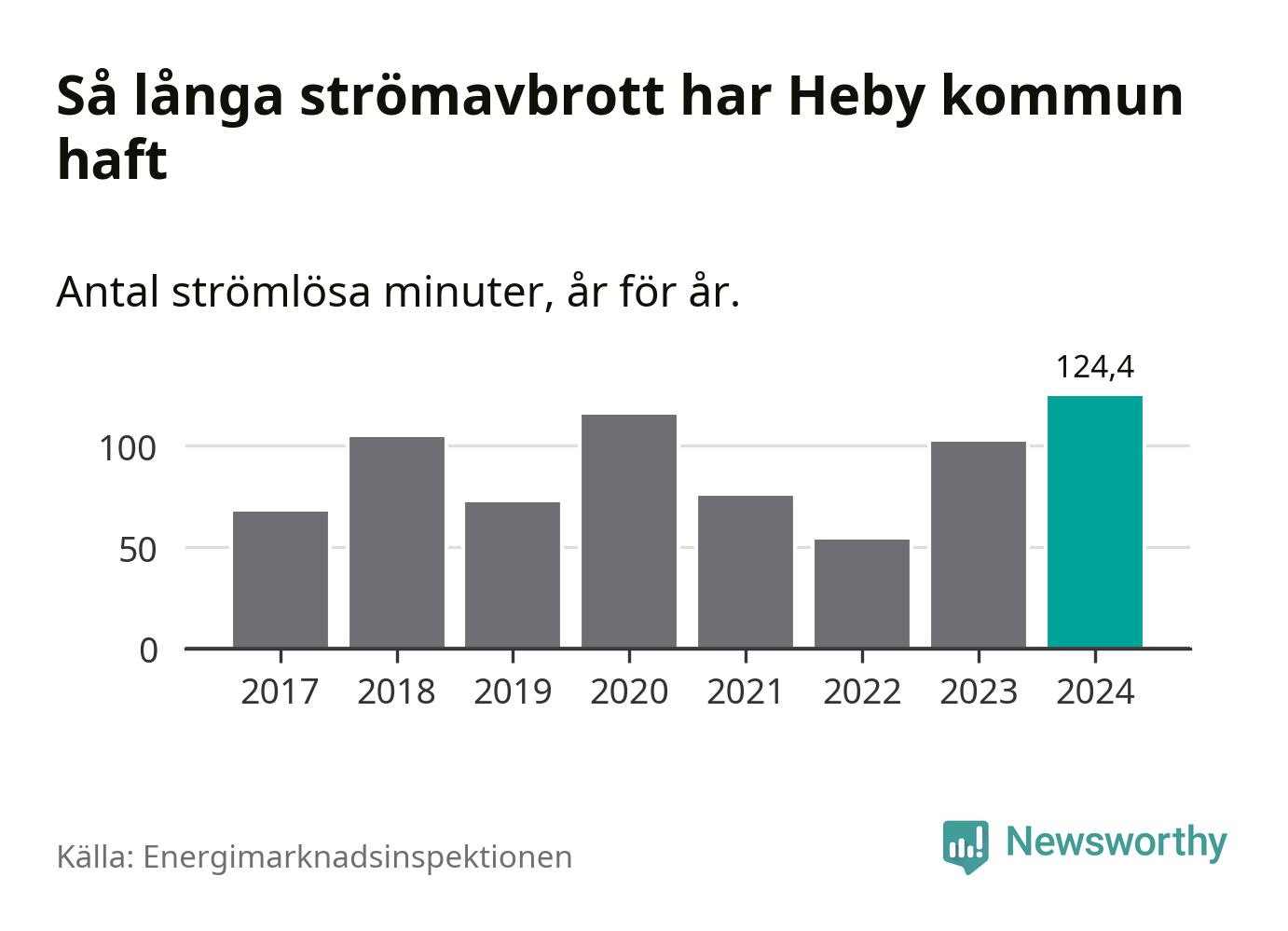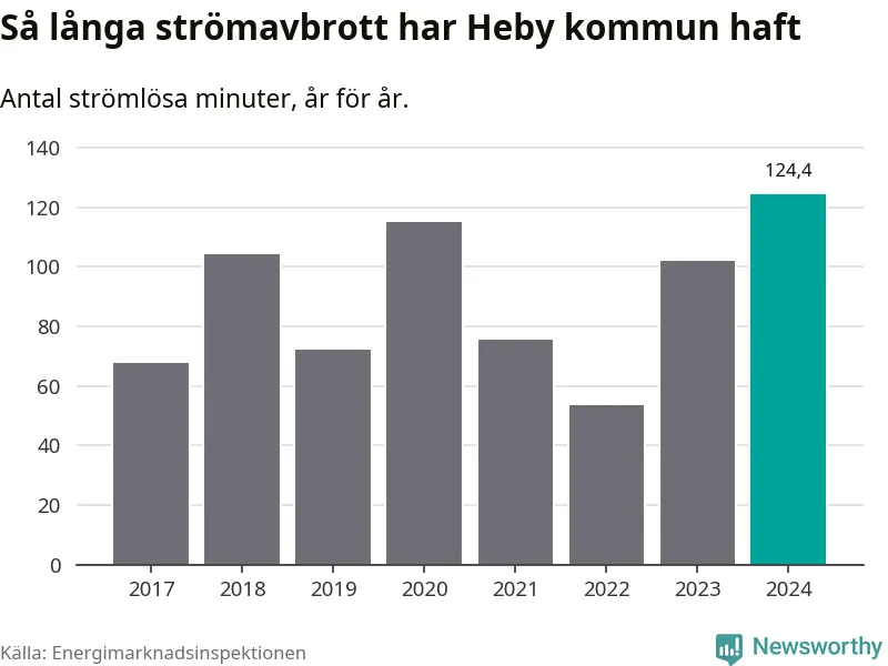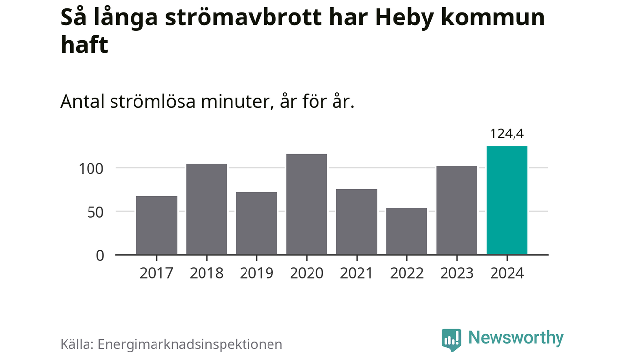 Antalet strömavbrott och total strömlös tid varierar något från år till år i Heby kommun. Mest tid utan ström (i alla fall under perioden 2017–2024) fick Hebyborna genomleva under 2024 – två timmar och fyra minuter. Det är 36 minuter längre än under ett normalår.