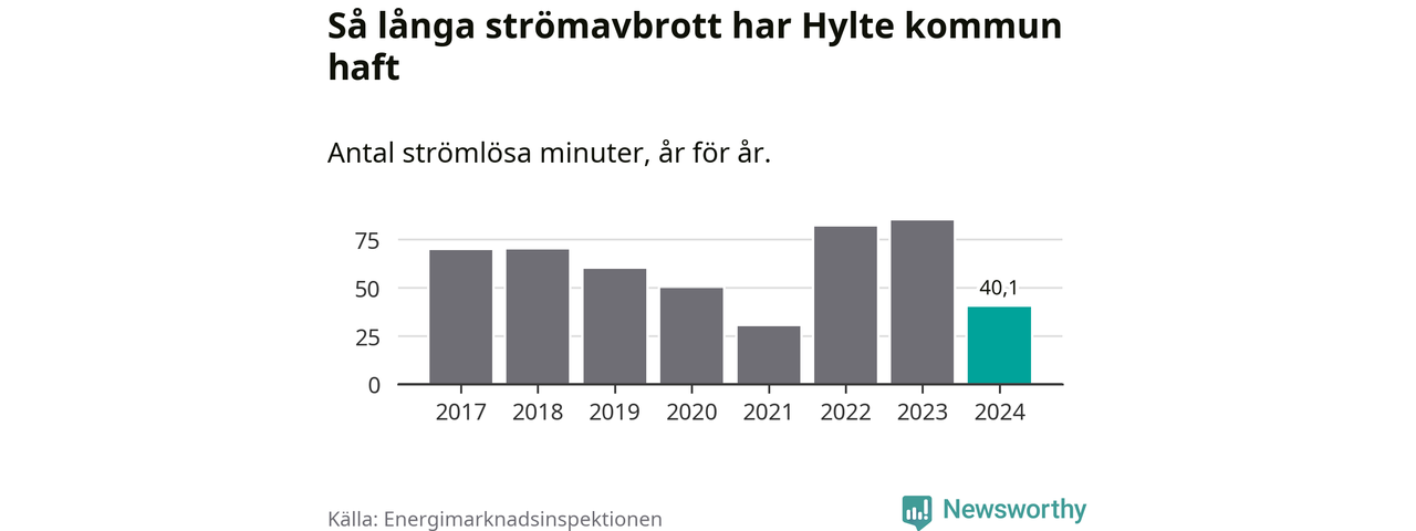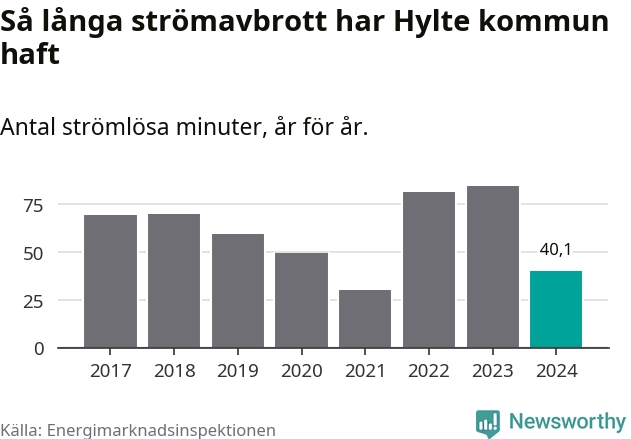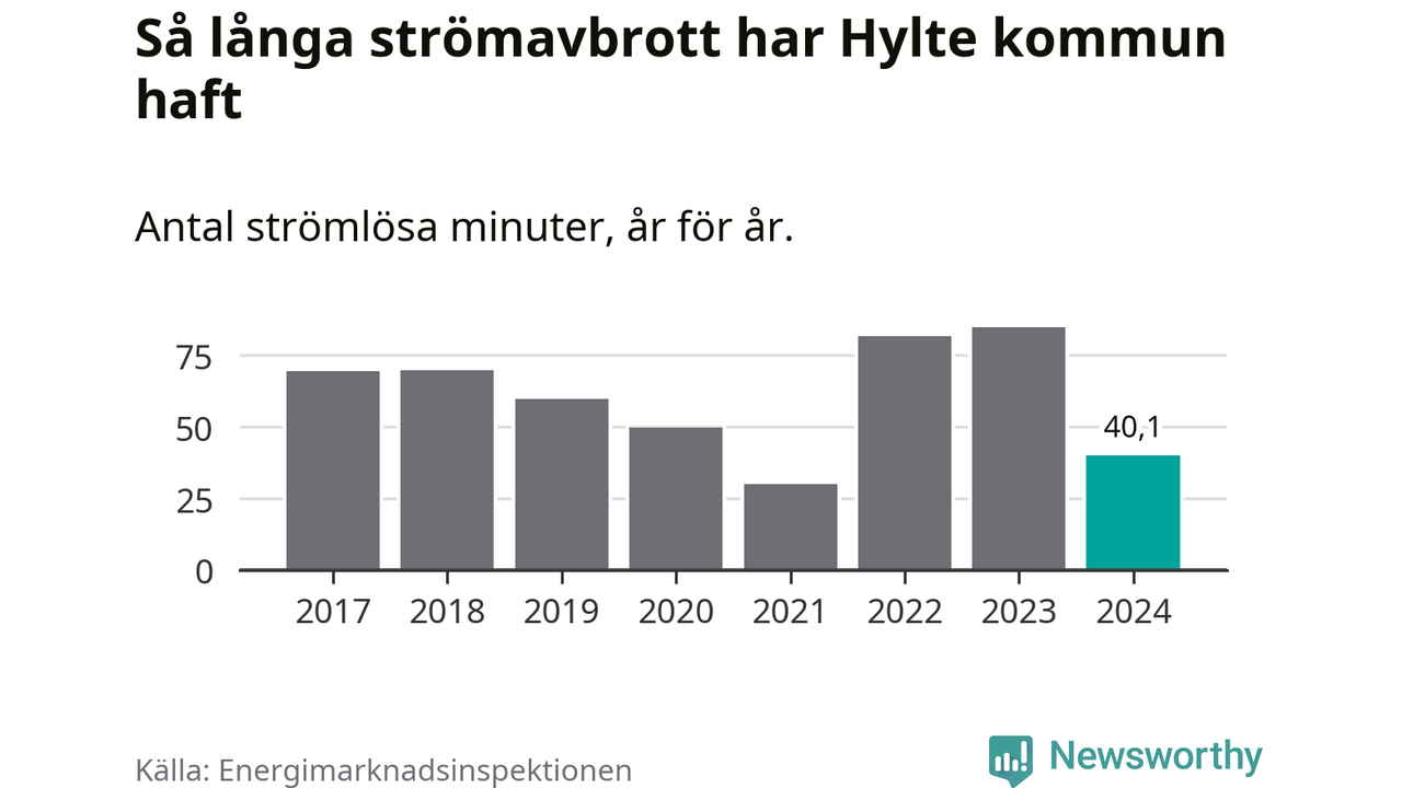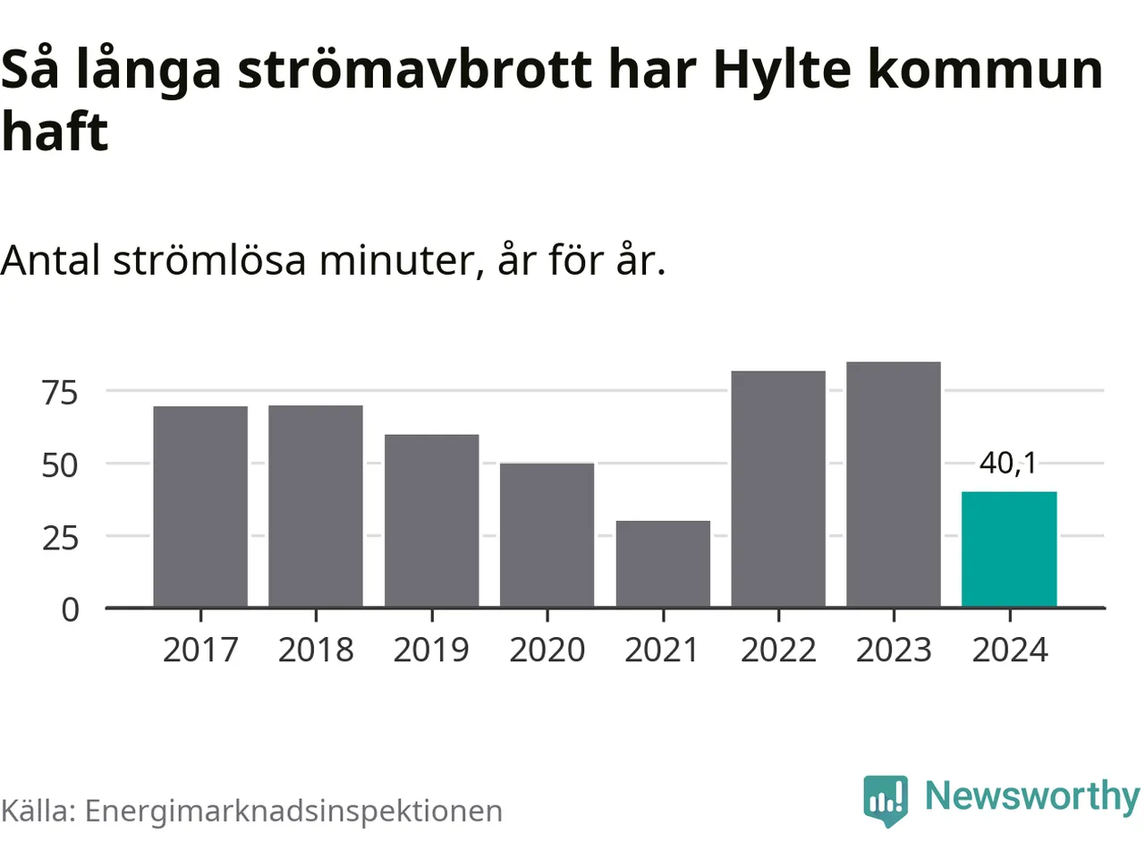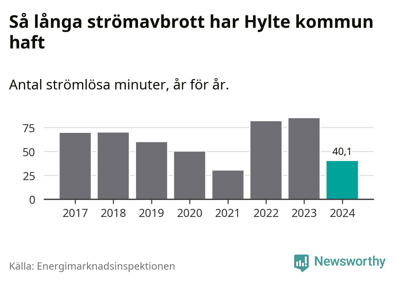 Antalet strömavbrott och total strömlös tid varierar något från år till år i Hylte kommun. Mest tid utan ström (i alla fall under perioden 2017–2024) fick Hylteborna genomleva under 2023 – en timme och 25 minuter. Det är 20 minuter längre än under ett normalår.