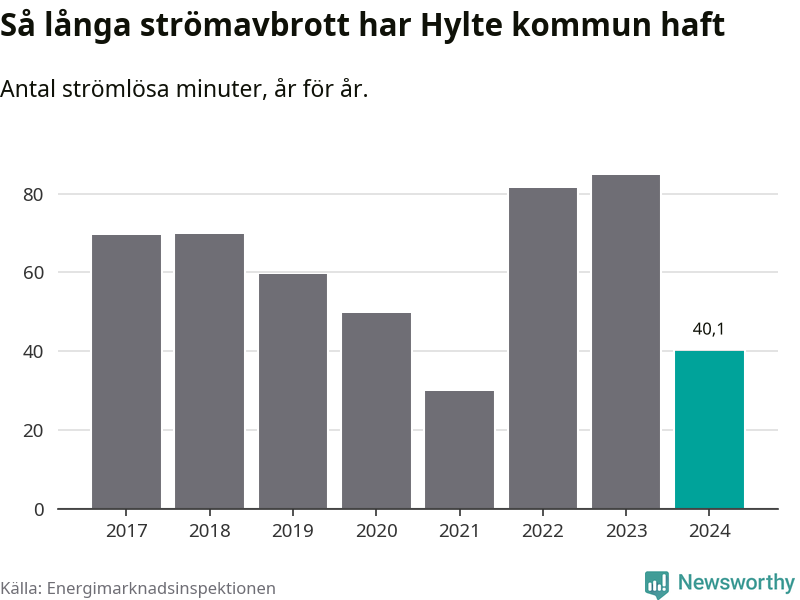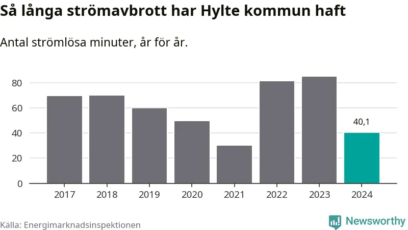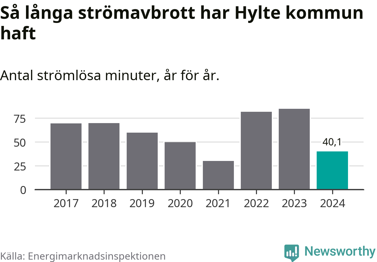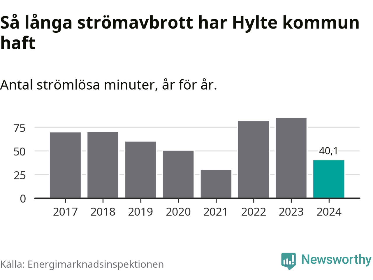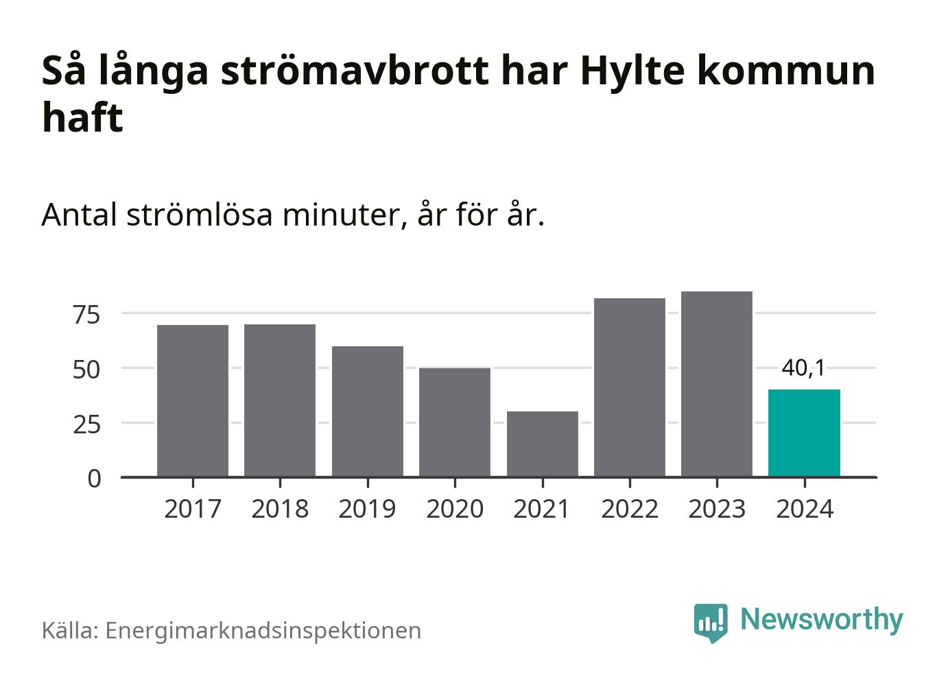 Antalet strömavbrott och total strömlös tid varierar något från år till år i Hylte kommun. Mest tid utan ström (i alla fall under perioden 2017–2024) fick Hylteborna genomleva under 2023 – en timme och 25 minuter. Det är 20 minuter längre än under ett normalår.