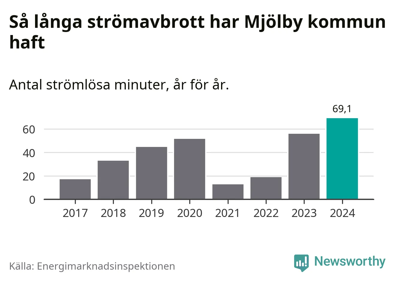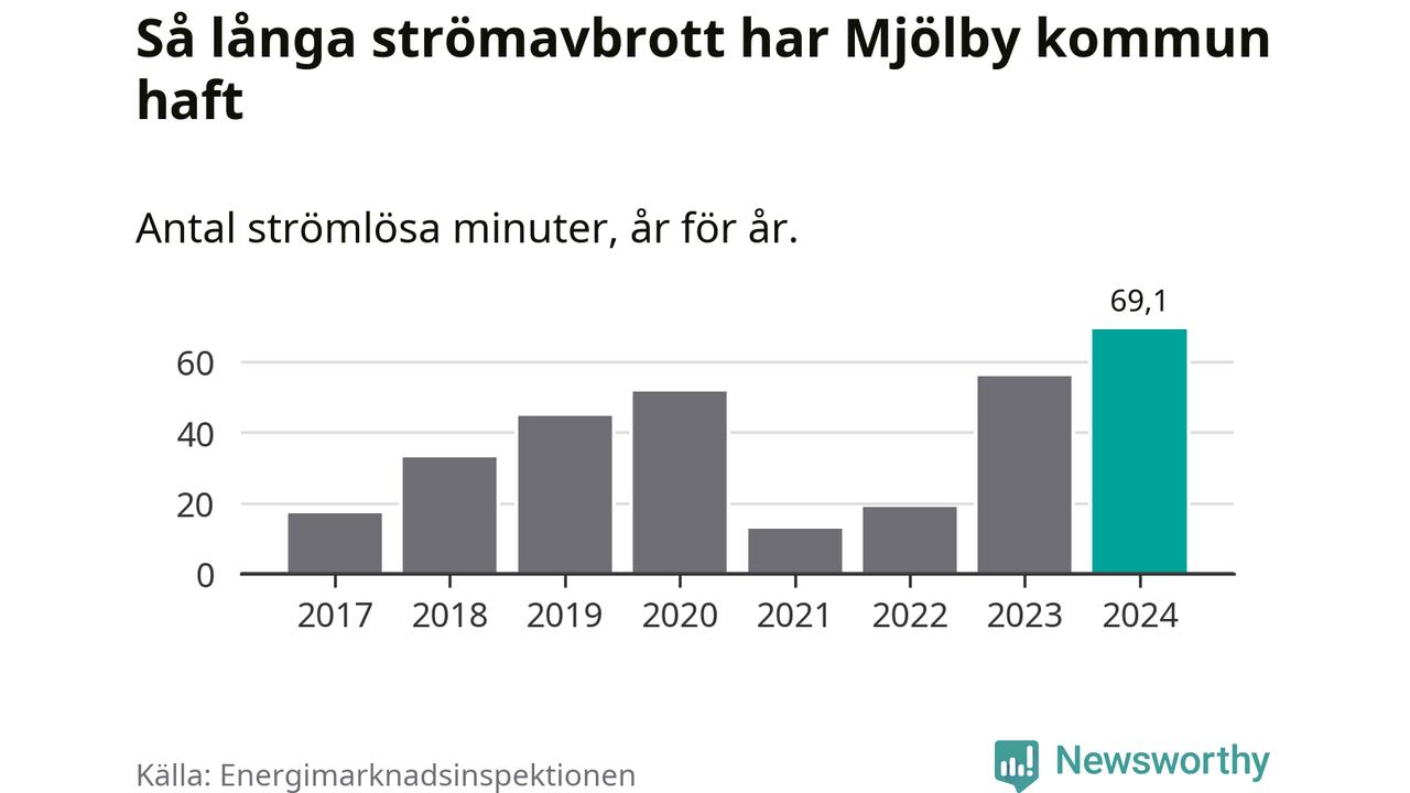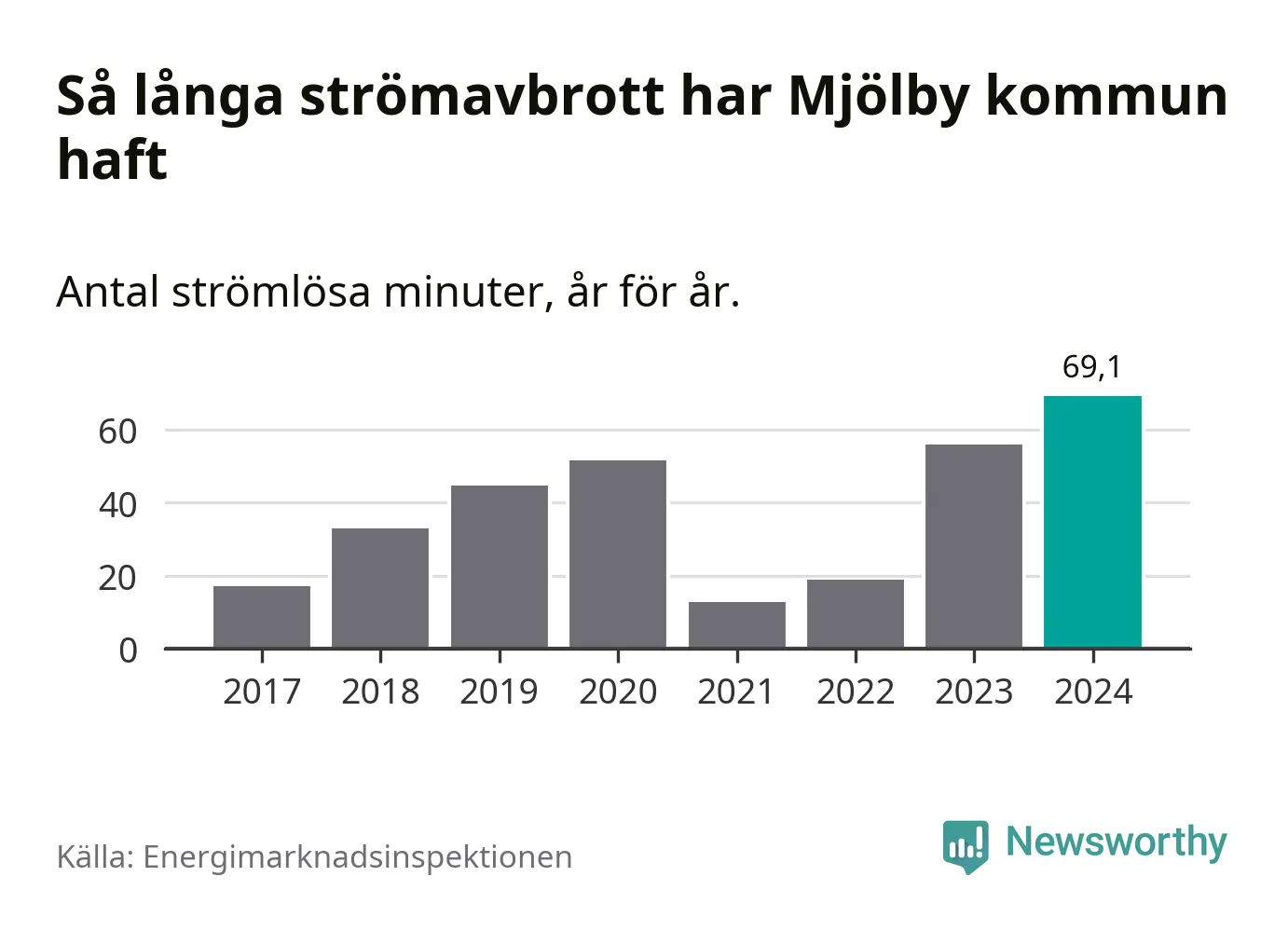 Antalet strömavbrott och total strömlös tid varierar något från år till år i Mjölby kommun. Mest tid utan ström (i alla fall under perioden 2017–2024) fick Mjölbyborna genomleva under 2024 – en timme och nio minuter. Det är 30 minuter längre än under ett normalår.