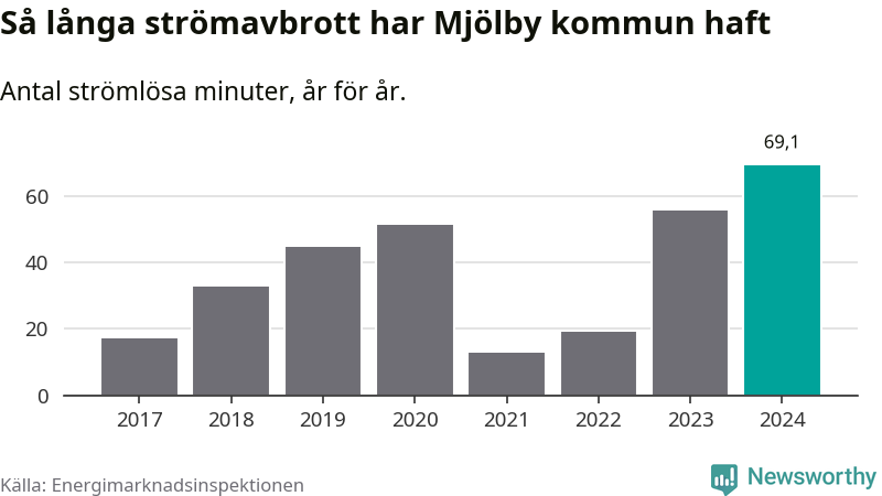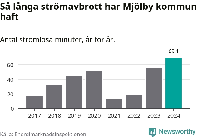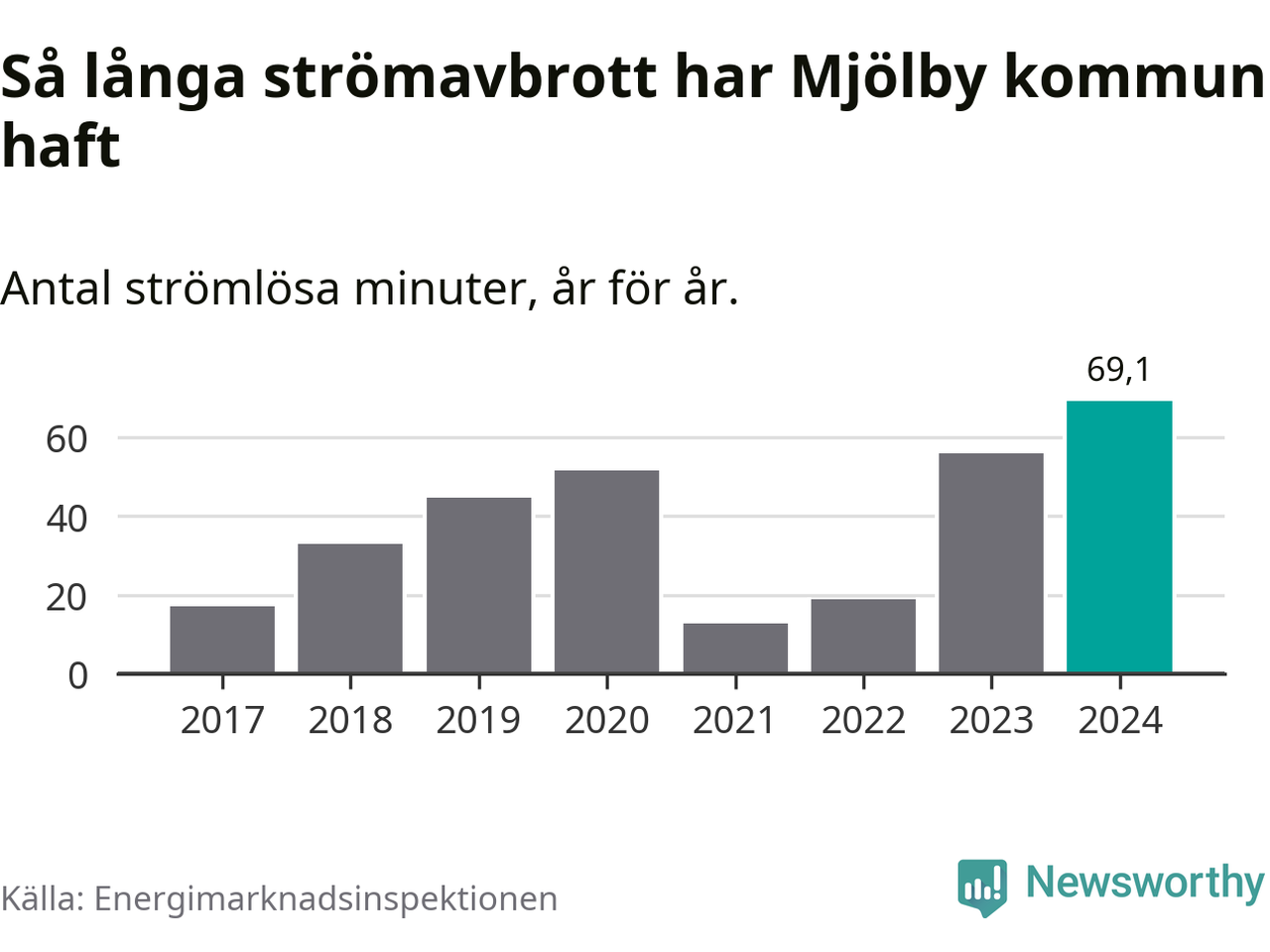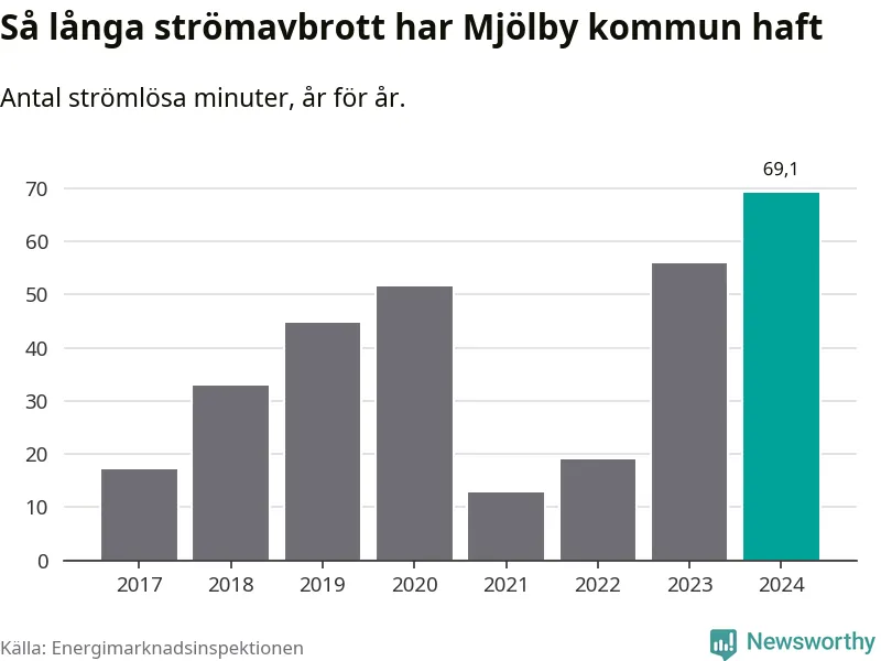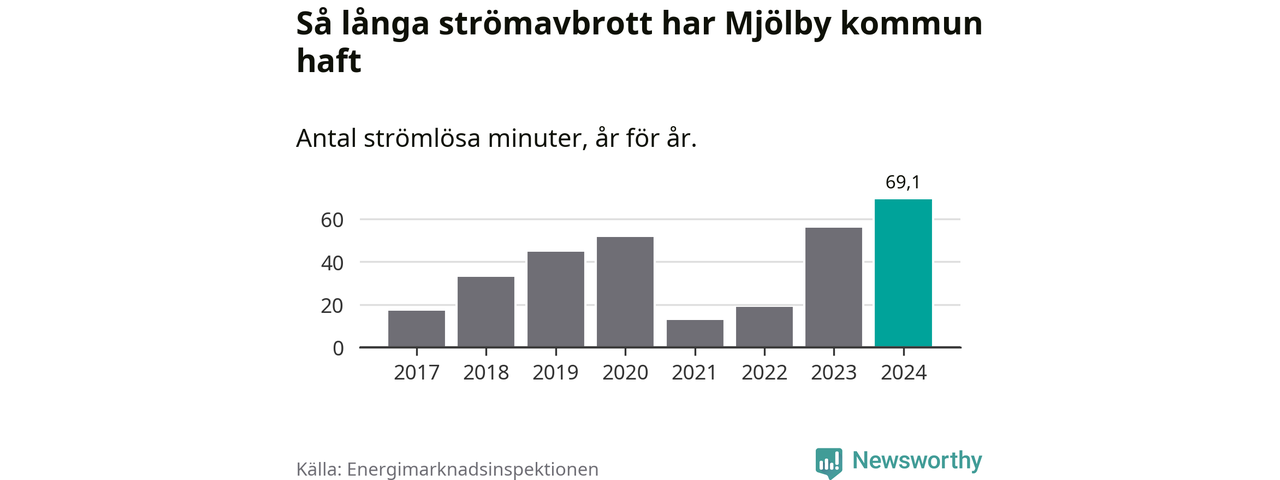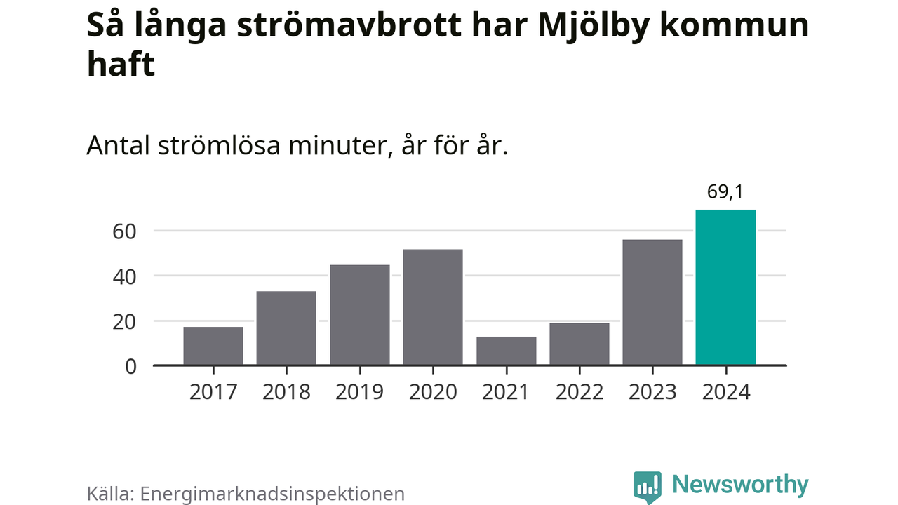 Antalet strömavbrott och total strömlös tid varierar något från år till år i Mjölby kommun. Mest tid utan ström (i alla fall under perioden 2017–2024) fick Mjölbyborna genomleva under 2024 – en timme och nio minuter. Det är 30 minuter längre än under ett normalår.