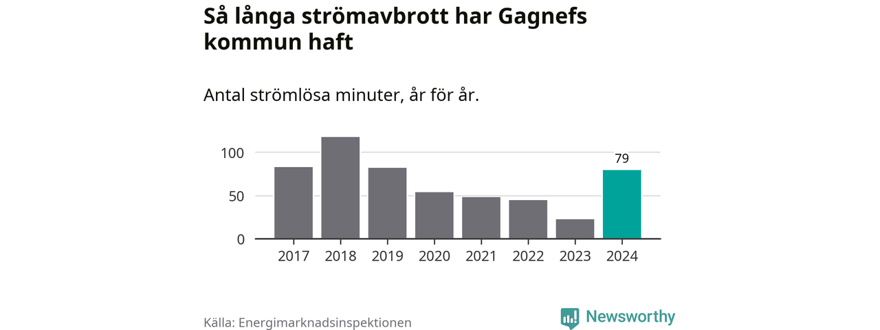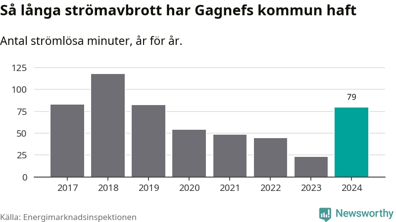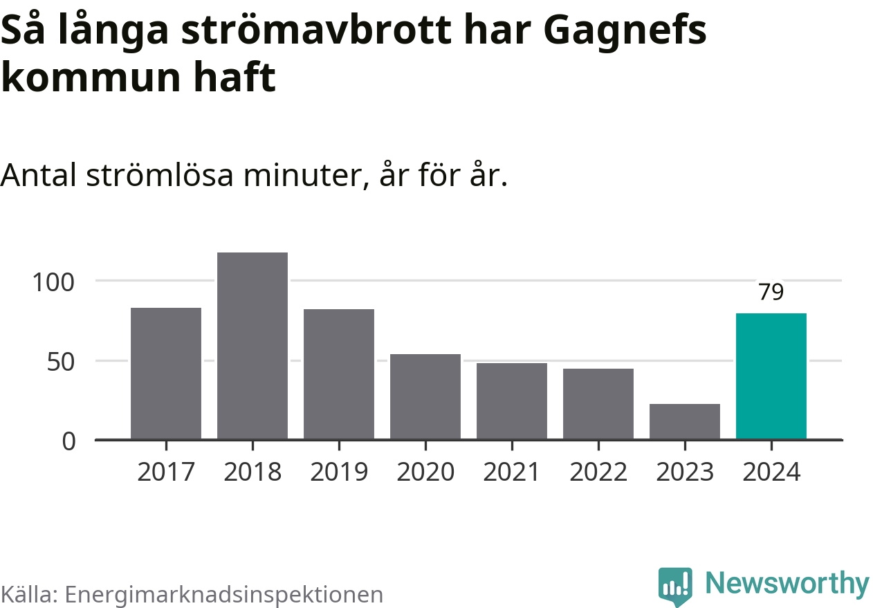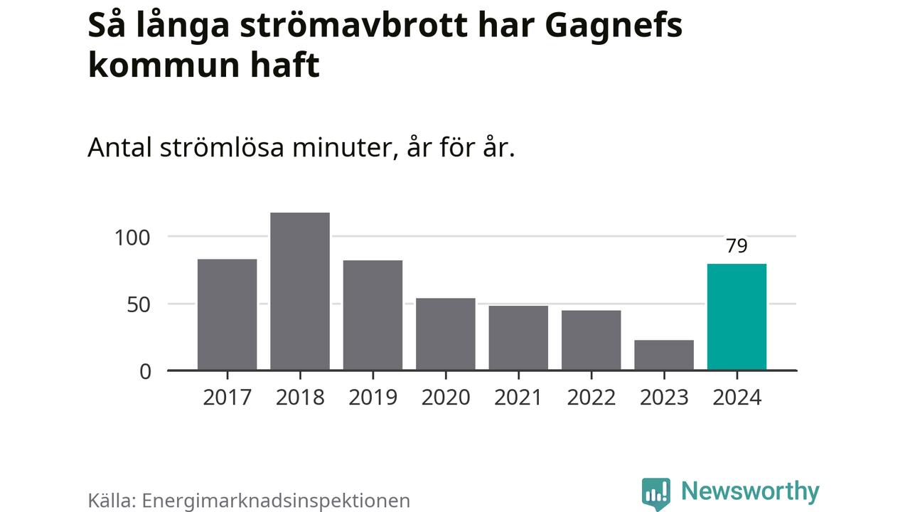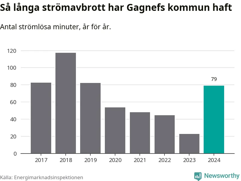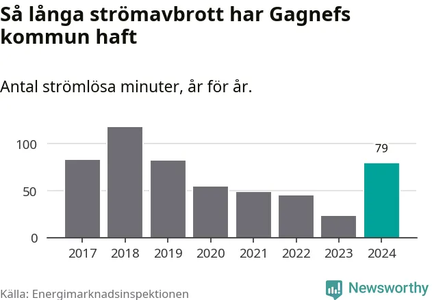 Antalet strömavbrott och total strömlös tid varierar något från år till år i Gagnefs kommun. Mest tid utan ström (i alla fall under perioden 2017–2024) fick Gagnefsborna genomleva under 2018 – en timme och 57 minuter. Det är 51 minuter längre än under ett normalår.