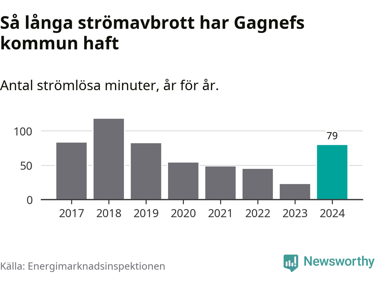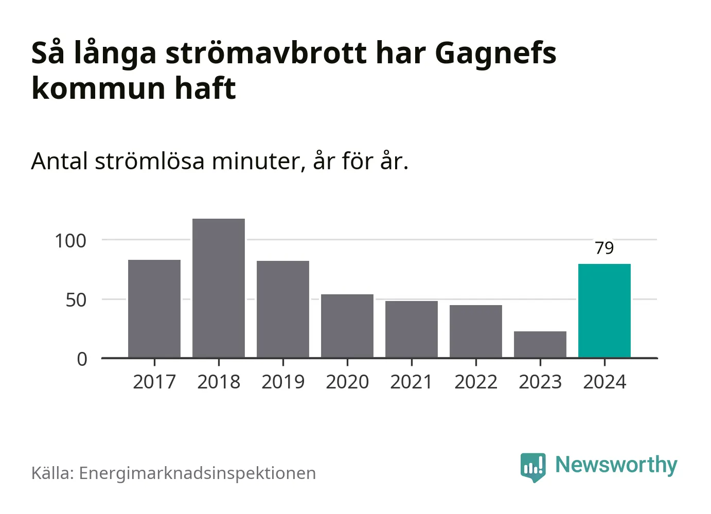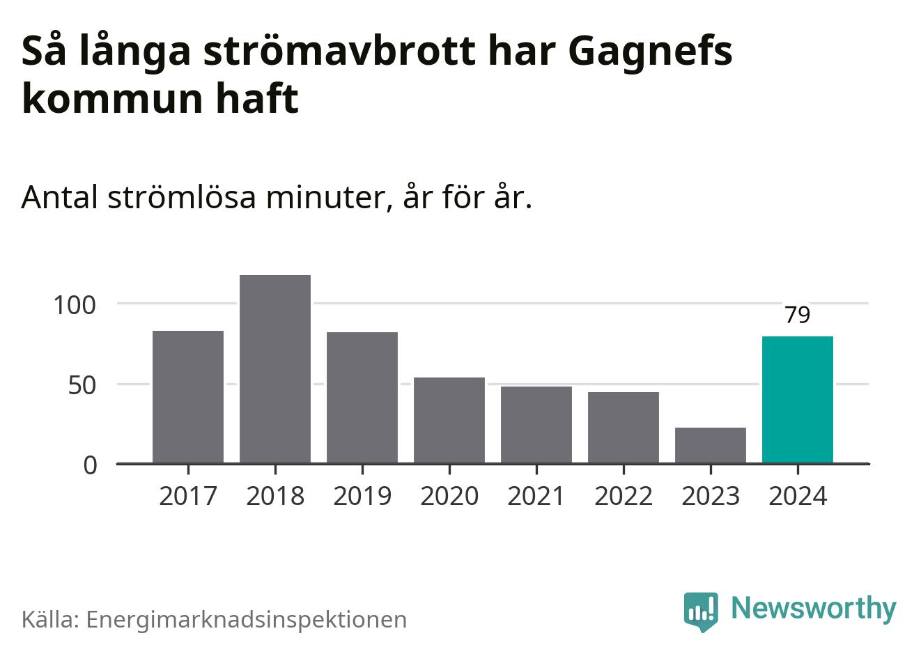 Antalet strömavbrott och total strömlös tid varierar något från år till år i Gagnefs kommun. Mest tid utan ström (i alla fall under perioden 2017–2024) fick Gagnefsborna genomleva under 2018 – en timme och 57 minuter. Det är 51 minuter längre än under ett normalår.