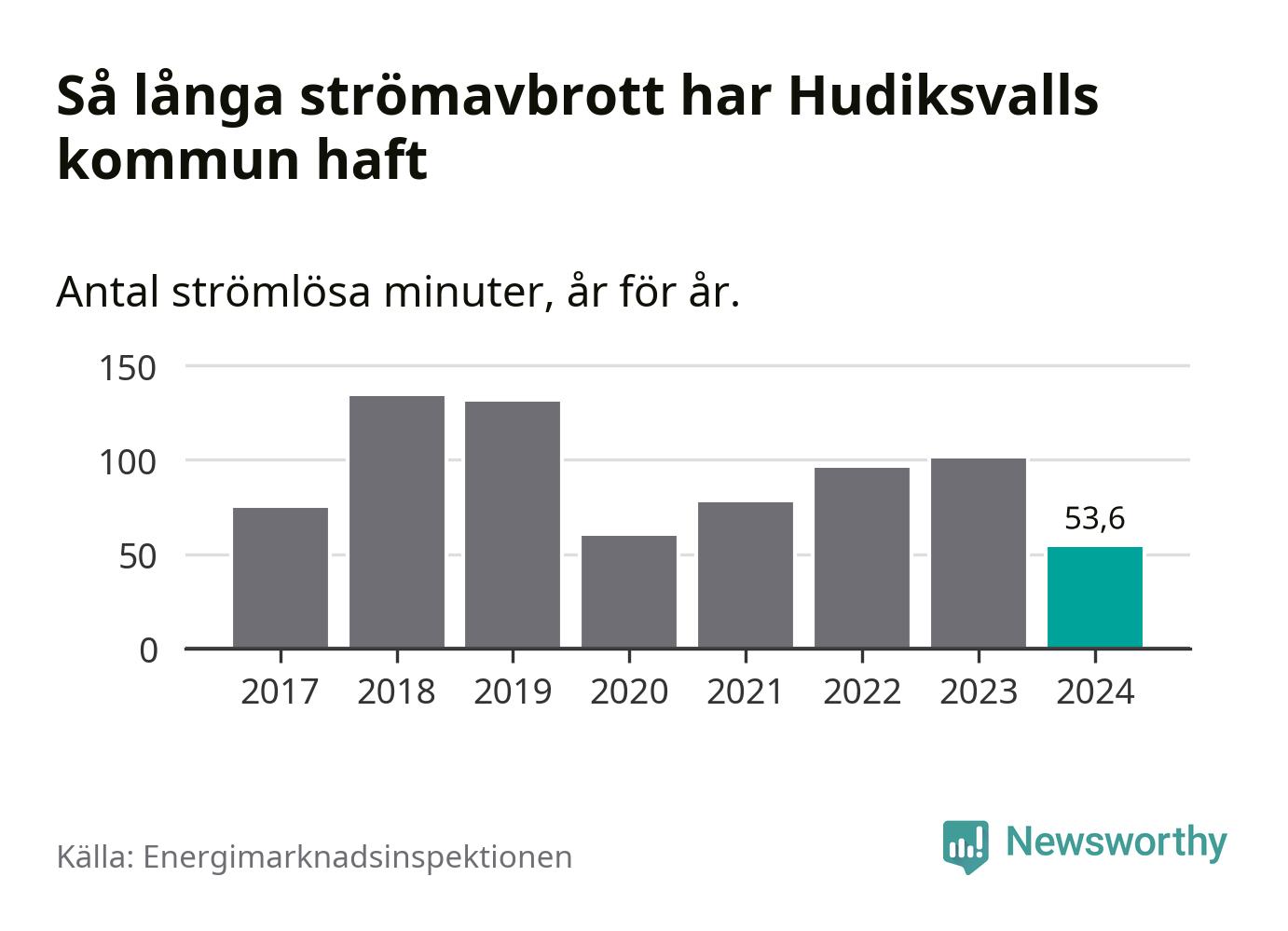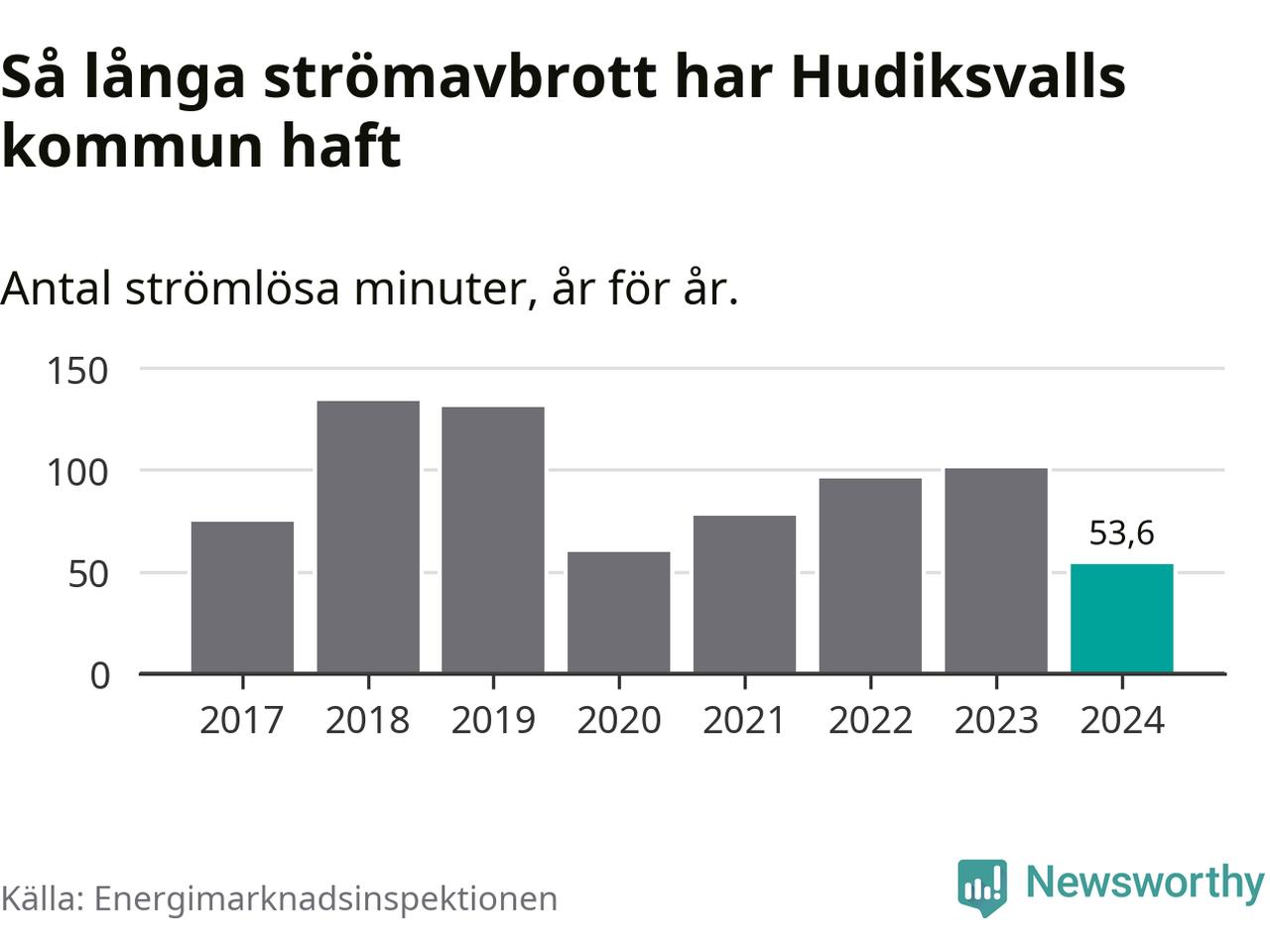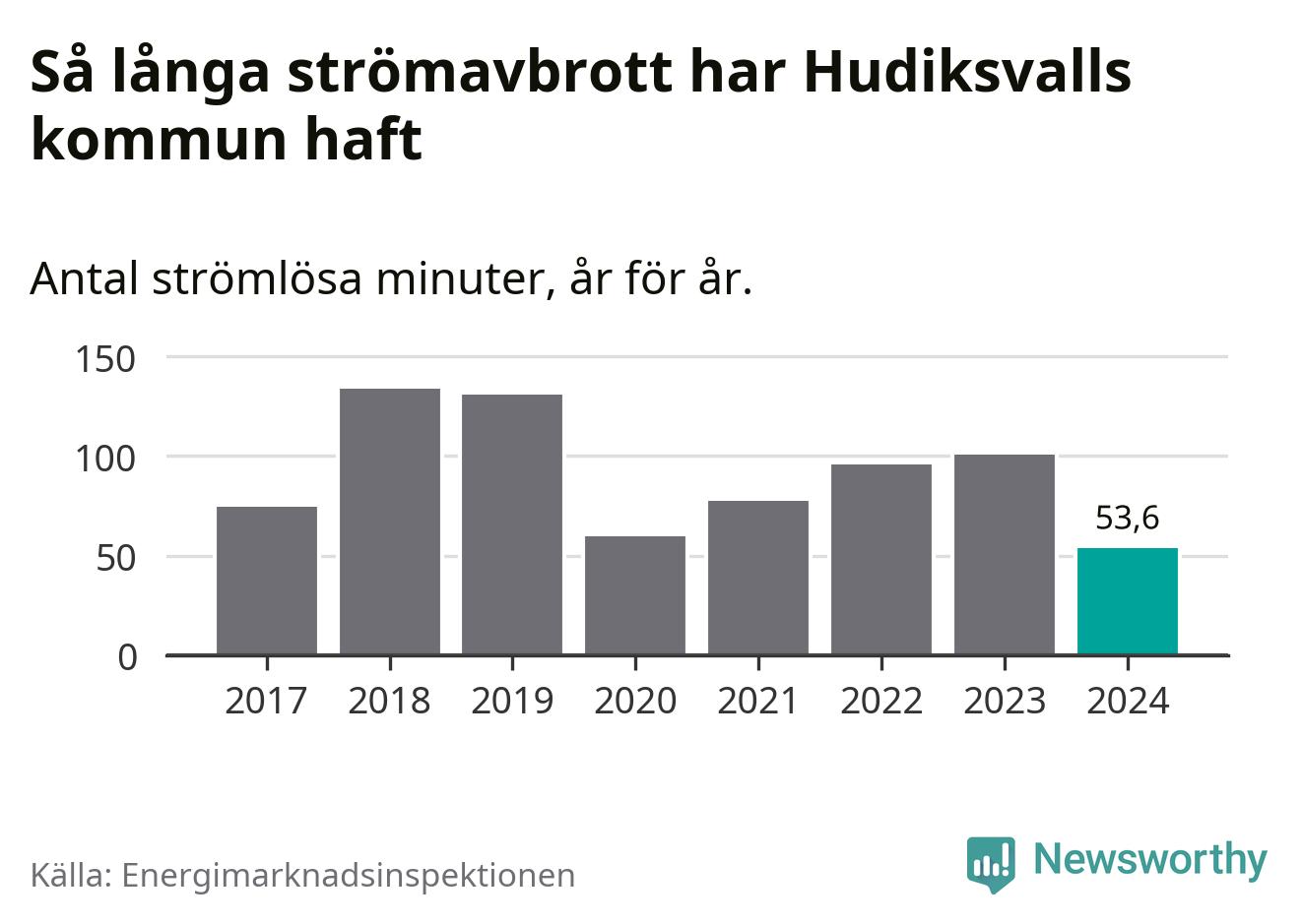 Antalet strömavbrott och total strömlös tid varierar något från år till år i Hudiksvalls kommun. Mest tid utan ström (i alla fall under perioden 2017–2024) fick Hudiksvalls­borna genomleva under 2018 – två timmar och 14 minuter. Det är 47 minuter längre än under ett normalår.