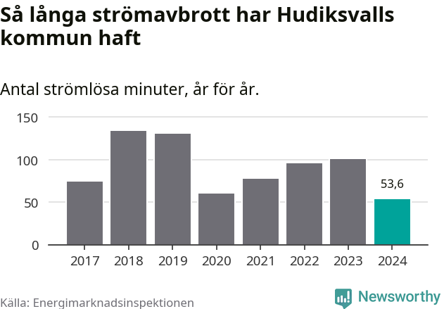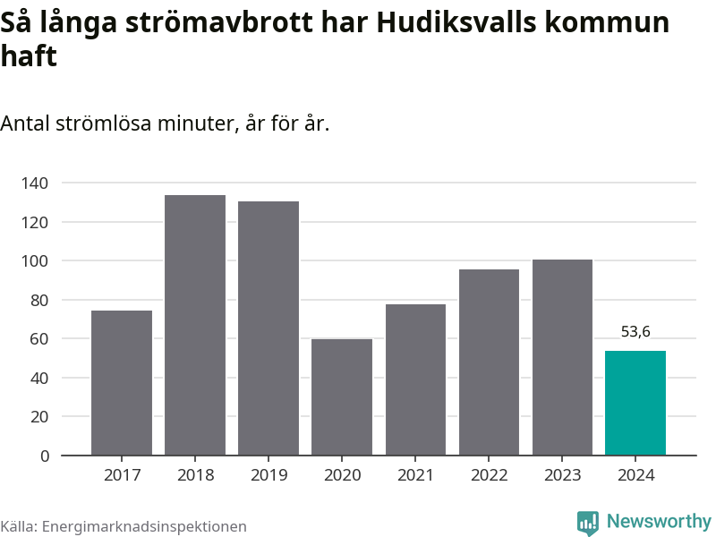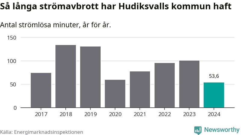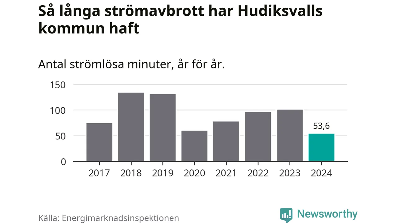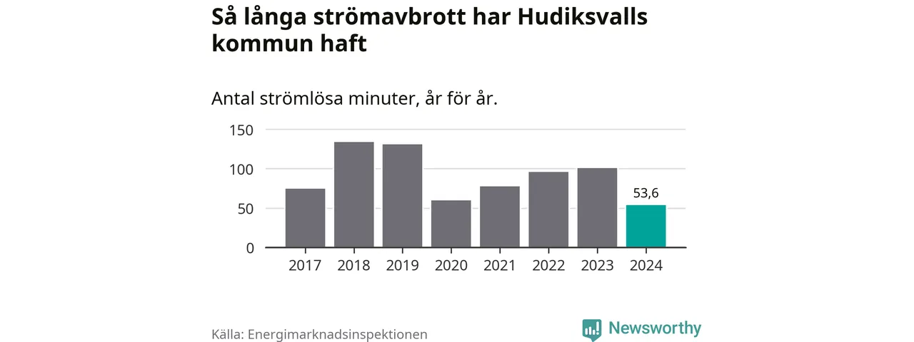 Antalet strömavbrott och total strömlös tid varierar något från år till år i Hudiksvalls kommun. Mest tid utan ström (i alla fall under perioden 2017–2024) fick Hudiksvalls­borna genomleva under 2018 – två timmar och 14 minuter. Det är 47 minuter längre än under ett normalår.