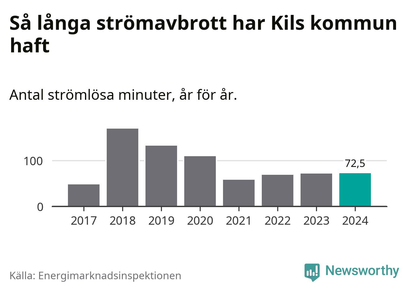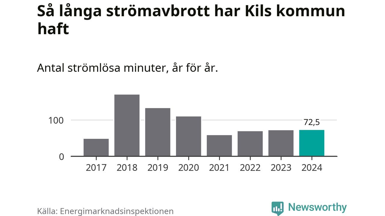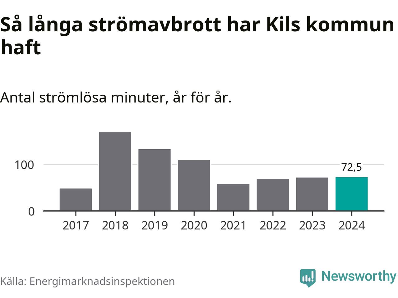 Antalet strömavbrott och total strömlös tid varierar från år till år i Kils kommun. Mest tid utan ström (i alla fall under perioden 2017–2024) fick Kils­borna genomleva under 2018 – två timmar och 49 minuter. Det är en timme och 37 minuter längre än under ett normalår.