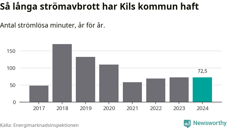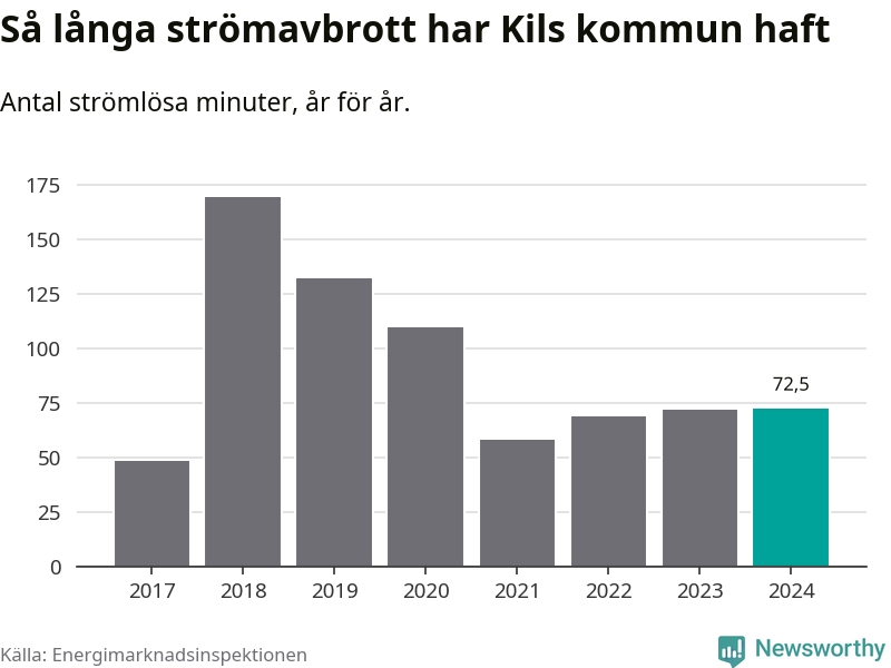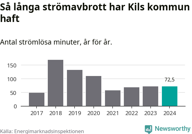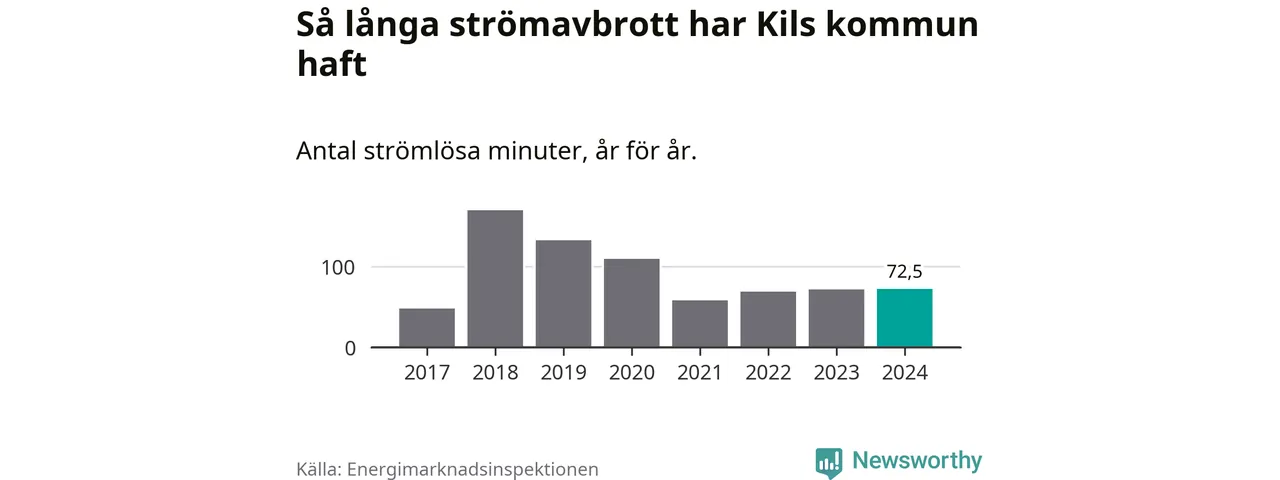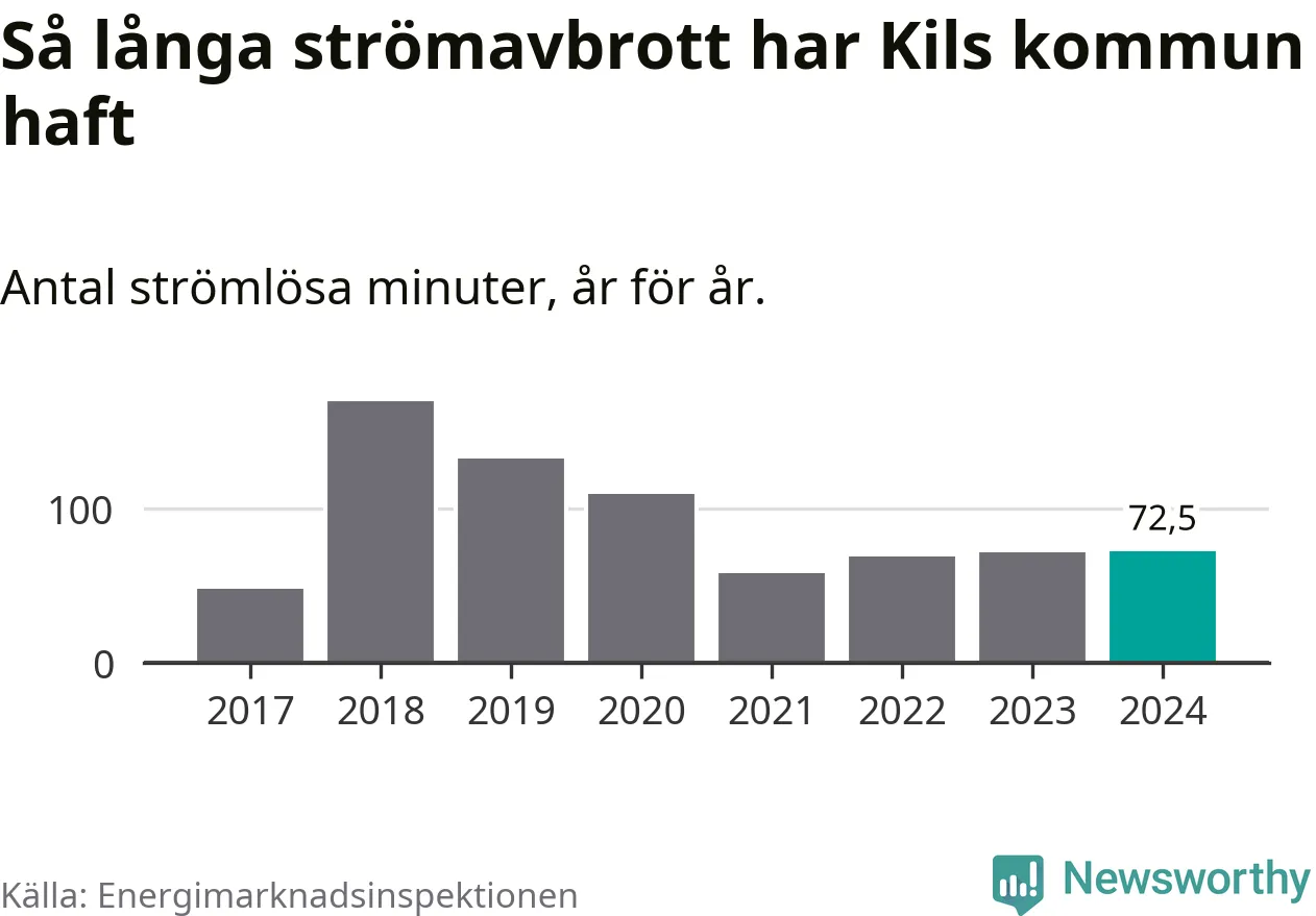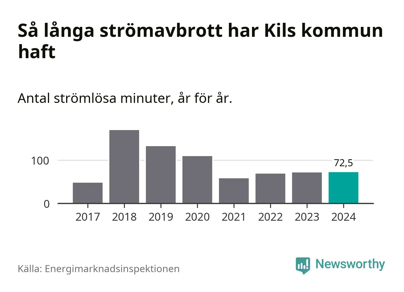Antalet strömavbrott och total strömlös tid varierar från år till år i Kils kommun. Mest tid utan ström (i alla fall under perioden 2017–2024) fick Kils­borna genomleva under 2018 – två timmar och 49 minuter. Det är en timme och 37 minuter längre än under ett normalår.