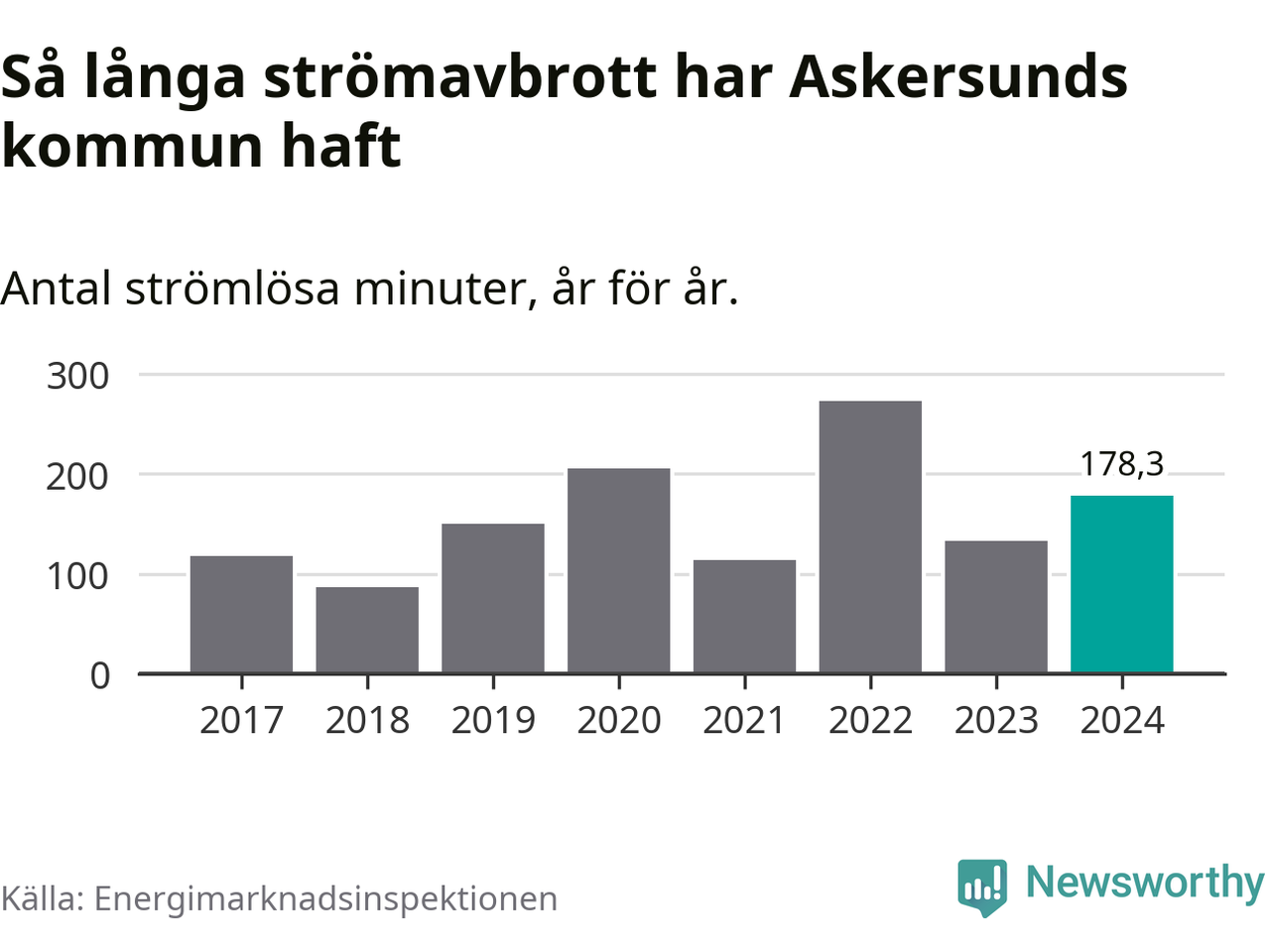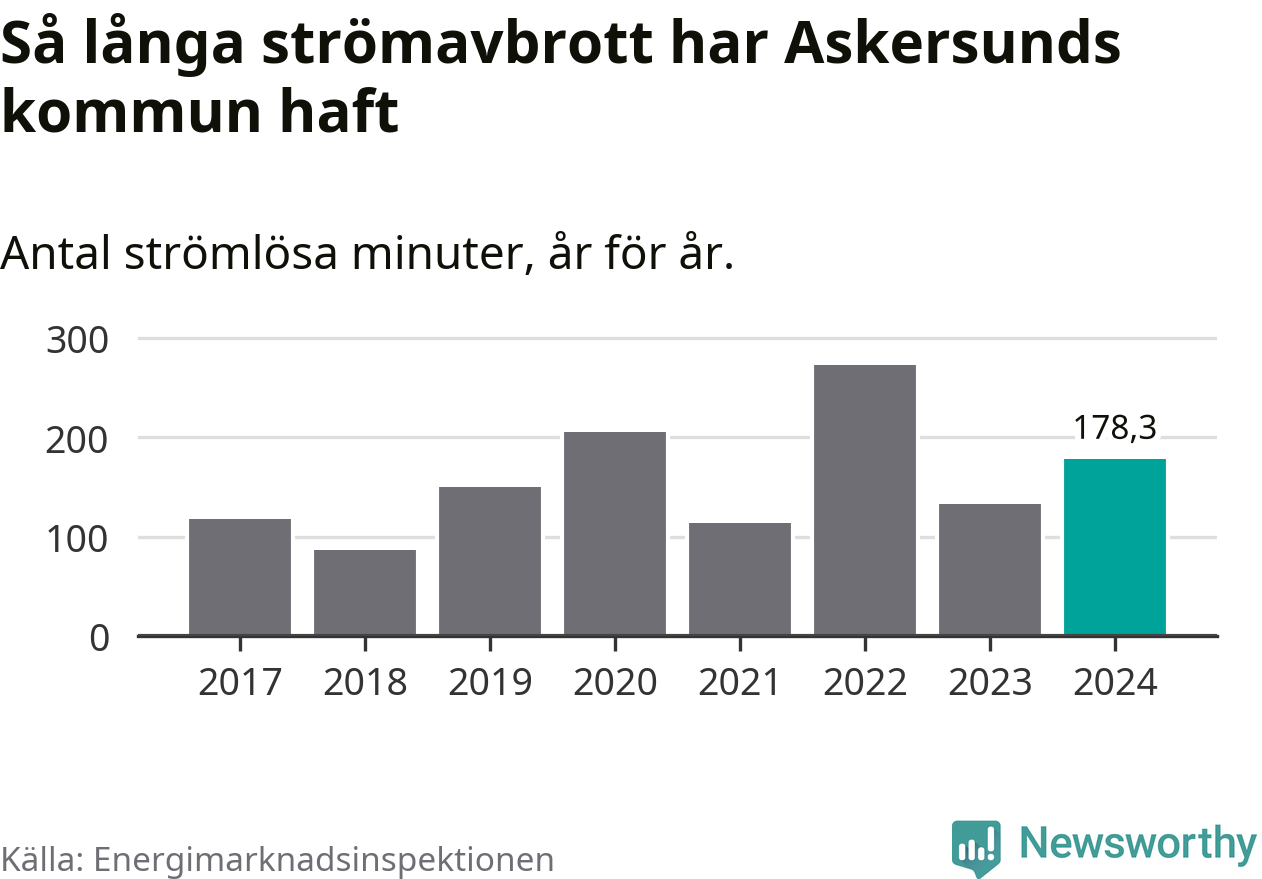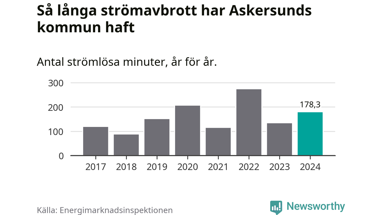 Antalet strömavbrott och total strömlös tid varierar något från år till år i Askersunds kommun. Mest tid utan ström (i alla fall under perioden 2017–2024) fick Askersundsborna genomleva under 2022 – fyra timmar och 33 minuter. Det är två timmar och elva minuter längre än under ett normalår.