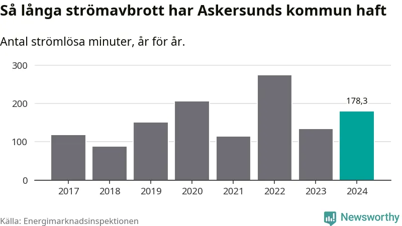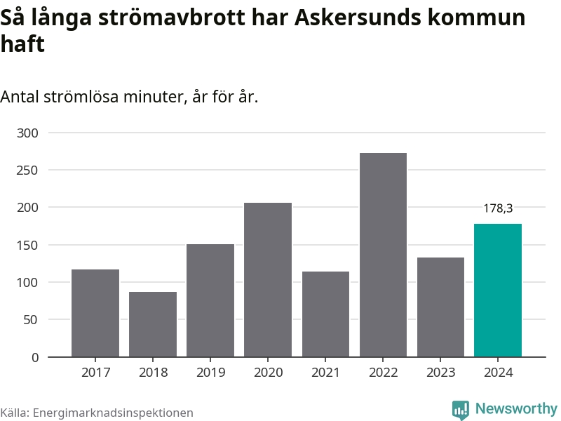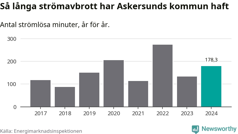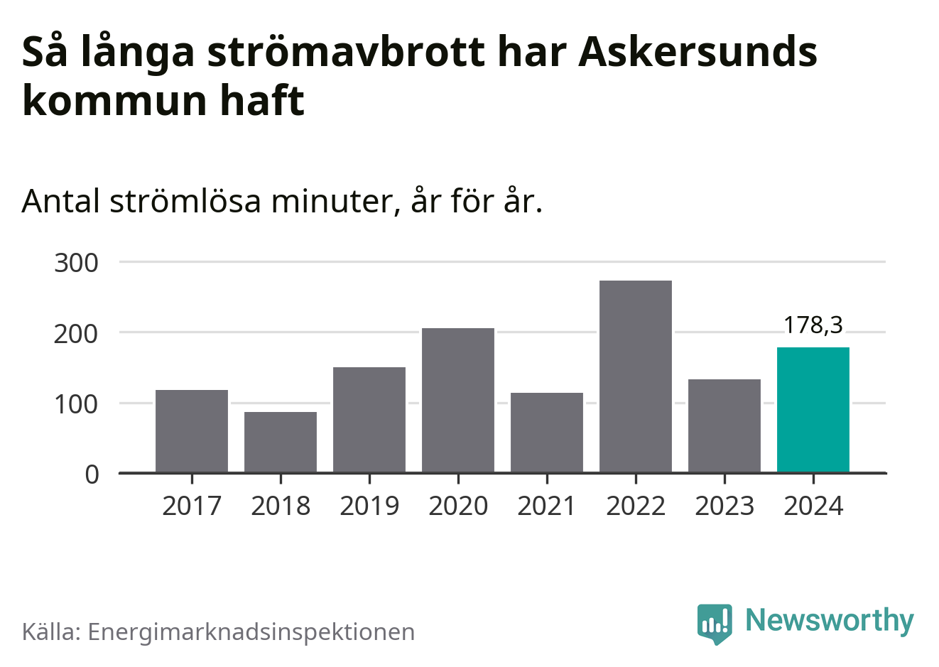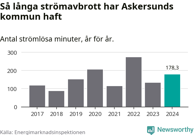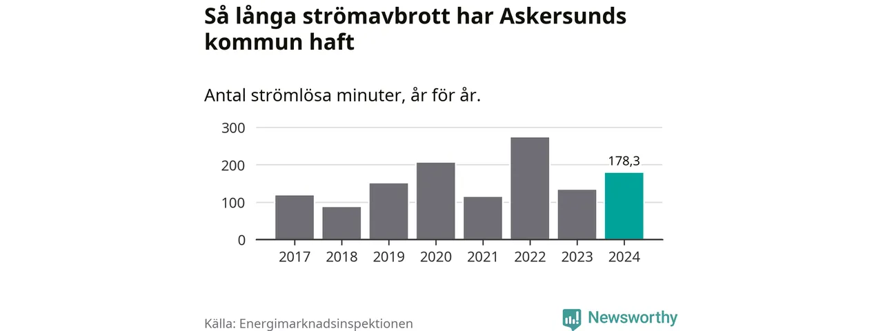 Antalet strömavbrott och total strömlös tid varierar något från år till år i Askersunds kommun. Mest tid utan ström (i alla fall under perioden 2017–2024) fick Askersundsborna genomleva under 2022 – fyra timmar och 33 minuter. Det är två timmar och elva minuter längre än under ett normalår.