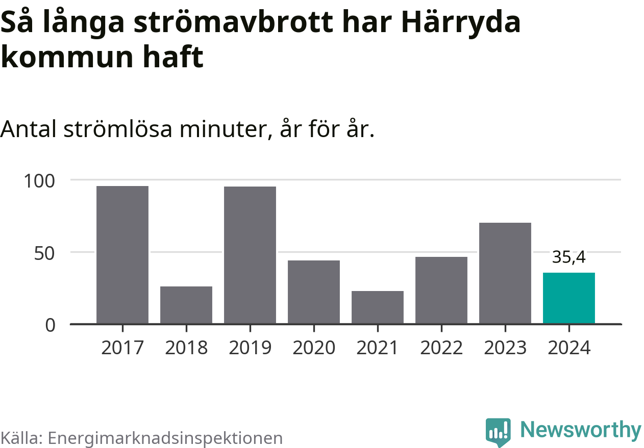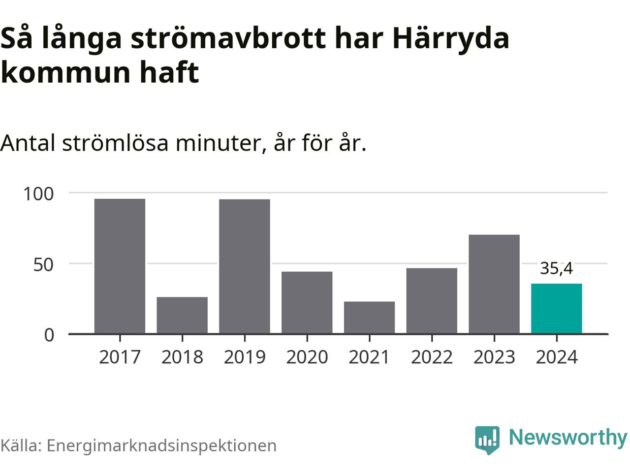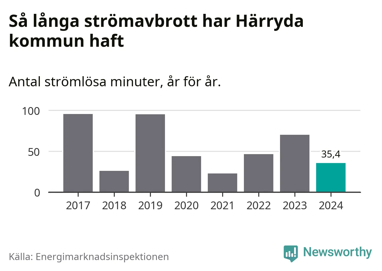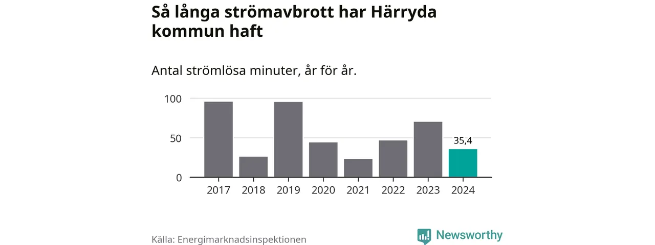 Antalet strömavbrott och total strömlös tid varierar något från år till år i Härryda kommun. Mest tid utan ström (i alla fall under perioden 2017–2024) fick Härrydaborna genomleva under 2017 – en timme och 36 minuter. Det är 50 minuter längre än under ett normalår.