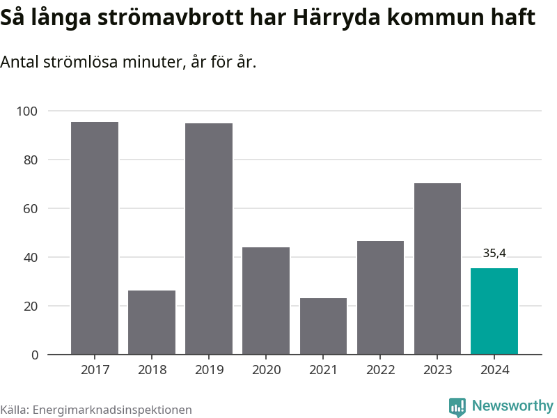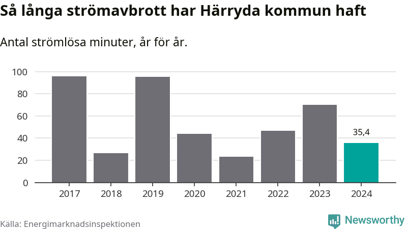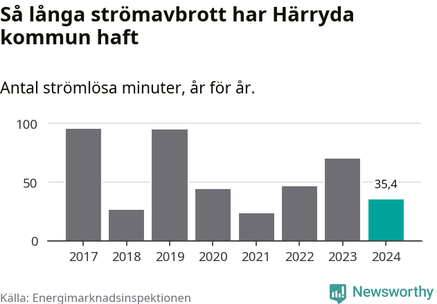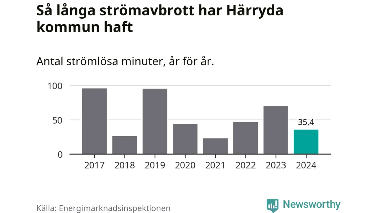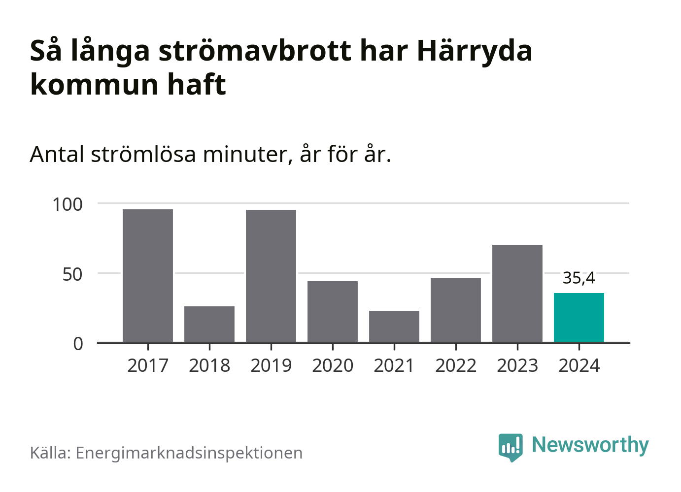 Antalet strömavbrott och total strömlös tid varierar något från år till år i Härryda kommun. Mest tid utan ström (i alla fall under perioden 2017–2024) fick Härrydaborna genomleva under 2017 – en timme och 36 minuter. Det är 50 minuter längre än under ett normalår.