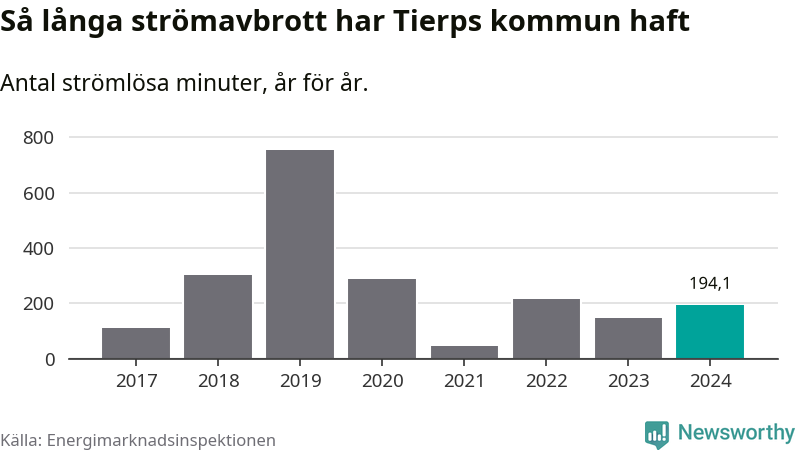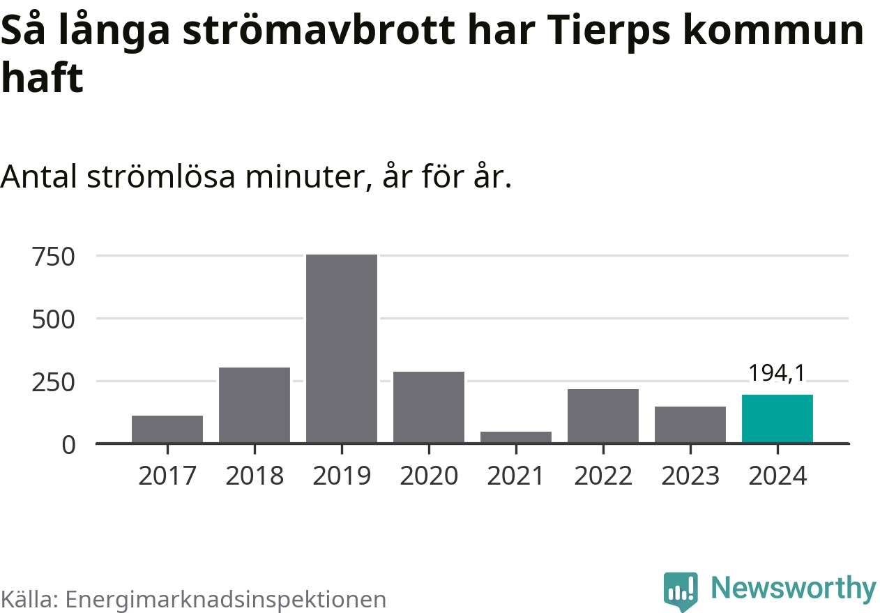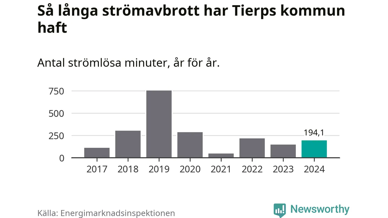 Tierps kommuns hushåll drabbas ett typiskt år av drygt två strömavbrott och tre timmar och 25 minuter strömlöst.