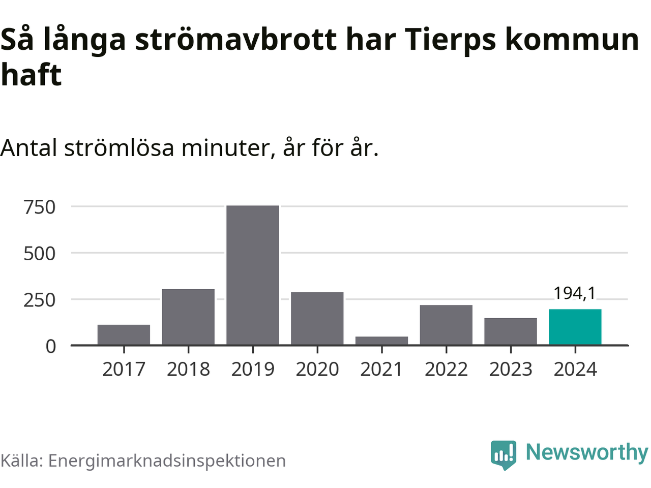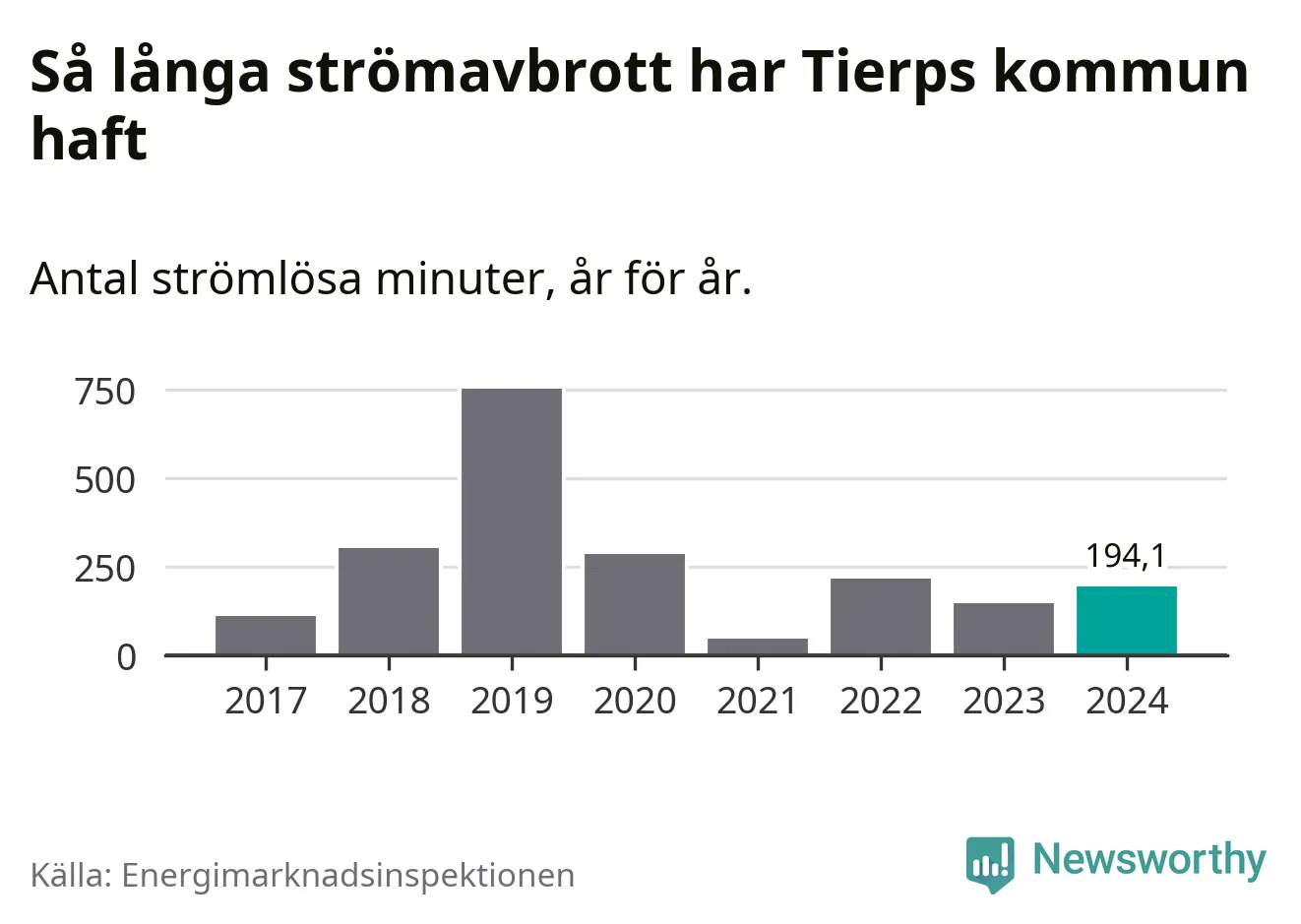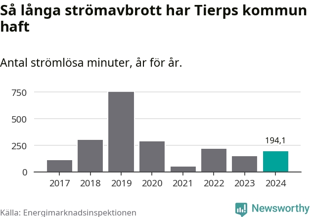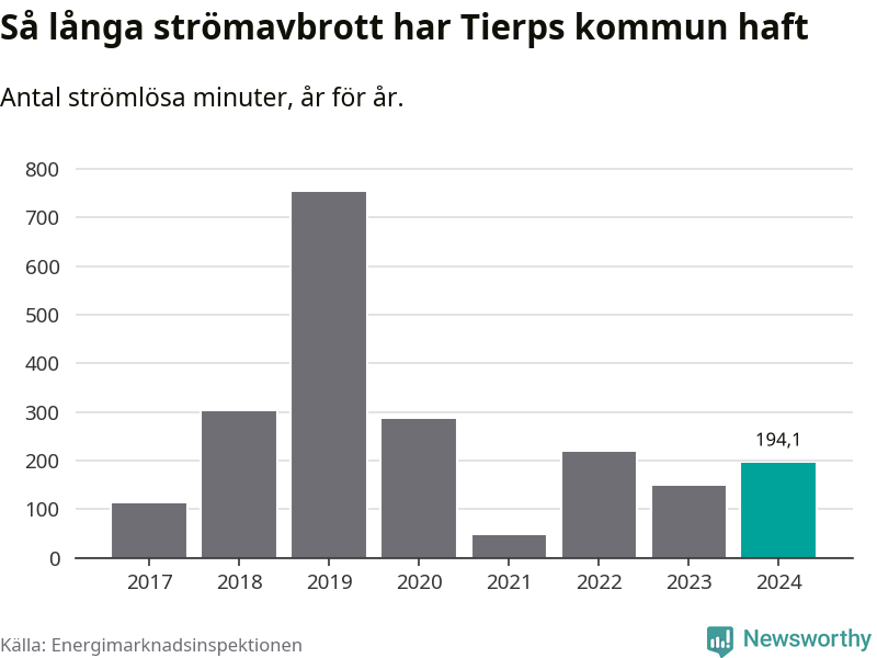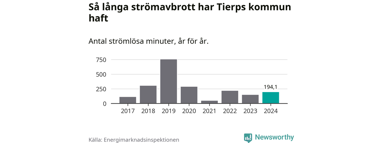 Antalet strömavbrott och total strömlös tid varierar från år till år i Tierps kommun. Mest tid utan ström (i alla fall under perioden 2017–2024) fick Tierpsborna genomleva under 2019 – tolv timmar och 33 minuter. Det är ungefär lika lång tid som det tar att se hela säsong 4 av serien ”Stranger things”.