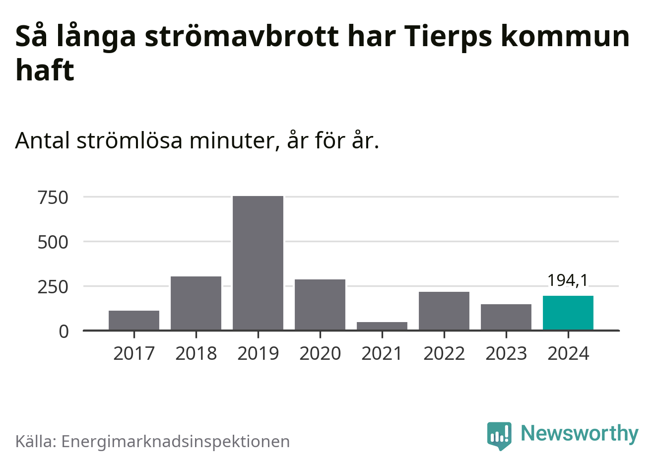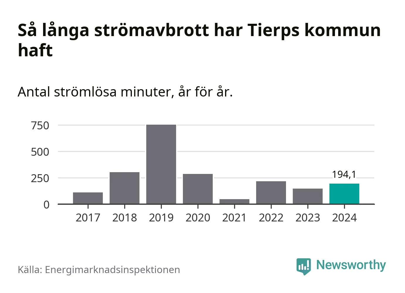 ”Stormåren 2011 (Dagmar), 2019 (Alfrida) samt 2008, 2013 och 2015, då ett flertal mindre stormar härjade i landet, sticker ut med betydligt fler avbrott som översteg 24 timmar än övriga år. Under dessa år drabbades upp till ca 70 000 kunder av avbrott längre än 24 timmar. Så det kan variera kraftigt mellan åren”, skriver Energimarknadsinspektionen i ett mejl till Newsworthy.
