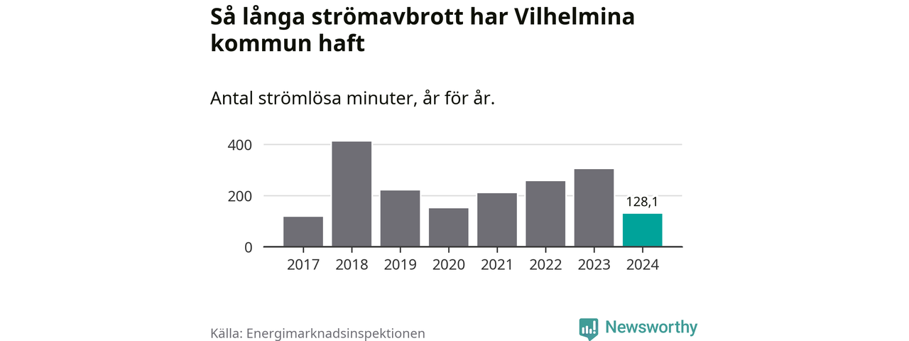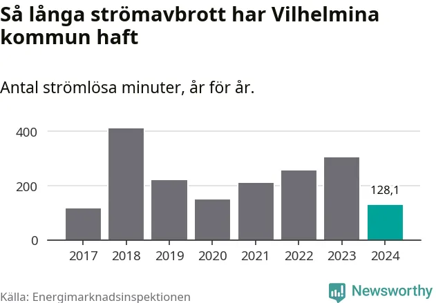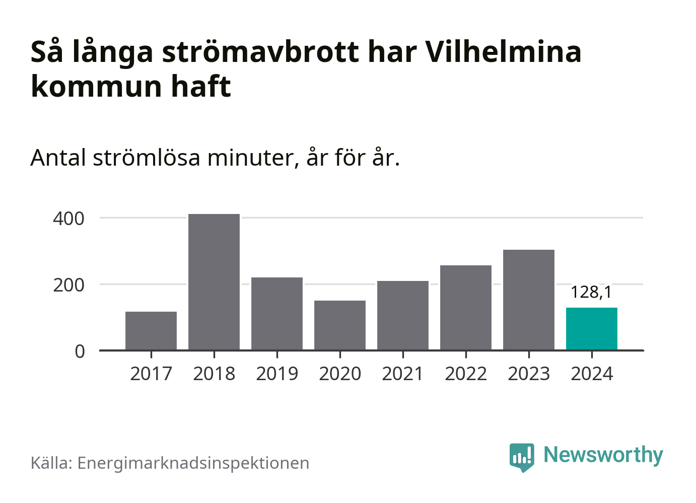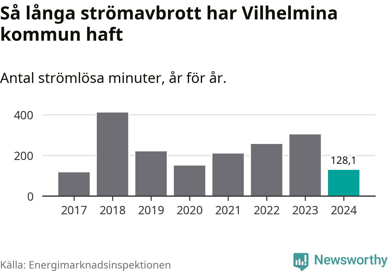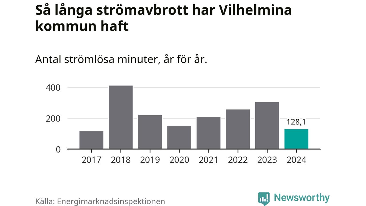 Antalet strömavbrott och total strömlös tid varierar något från år till år i Vilhelmina kommun. Mest tid utan ström (i alla fall under perioden 2017–2024) fick Vilhelminaborna genomleva under 2018 – sex timmar och 50 minuter. Det är tre timmar och 16 minuter längre än under ett normalår.