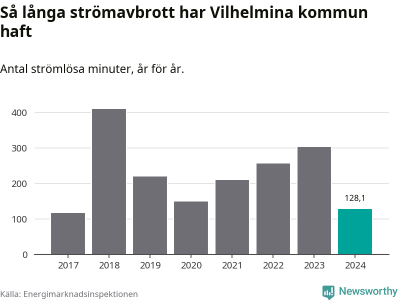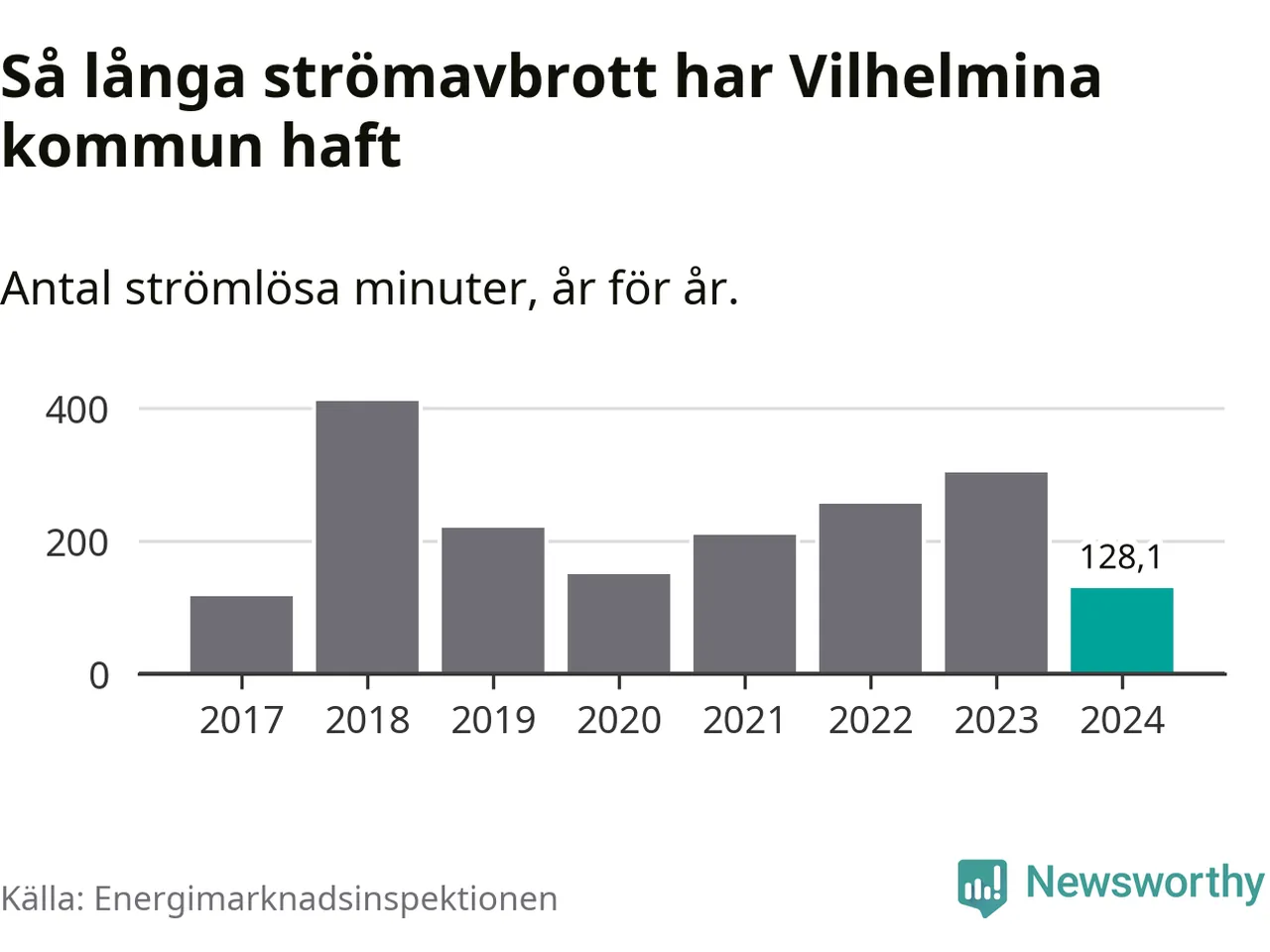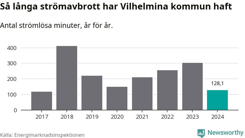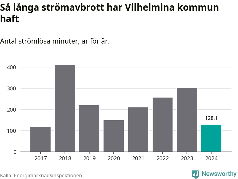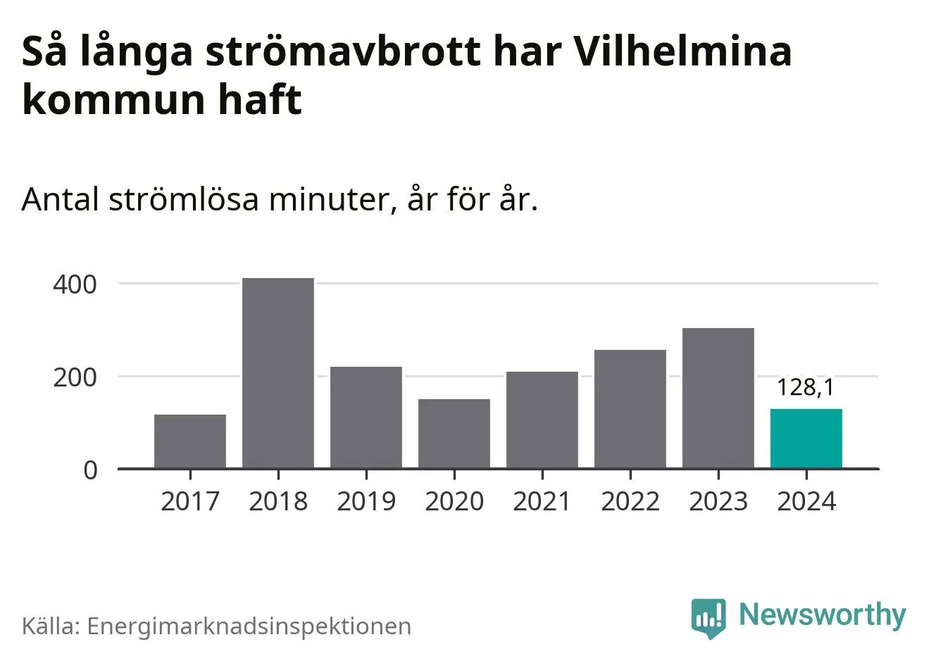Antalet strömavbrott och total strömlös tid varierar något från år till år i Vilhelmina kommun. Mest tid utan ström (i alla fall under perioden 2017–2024) fick Vilhelminaborna genomleva under 2018 – sex timmar och 50 minuter. Det är tre timmar och 16 minuter längre än under ett normalår.