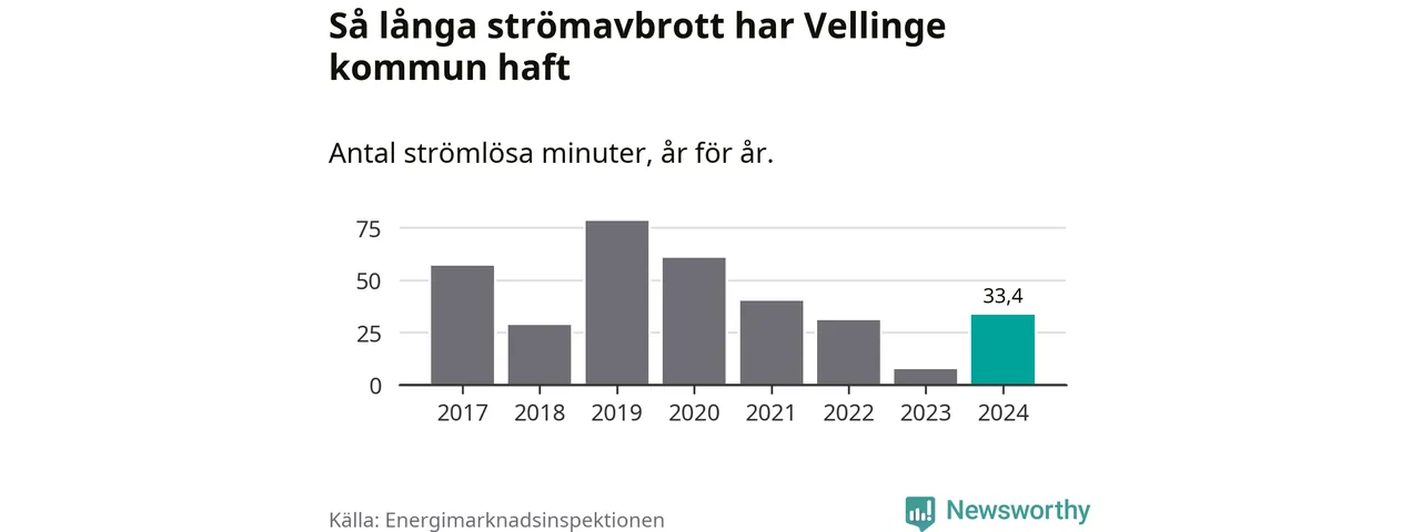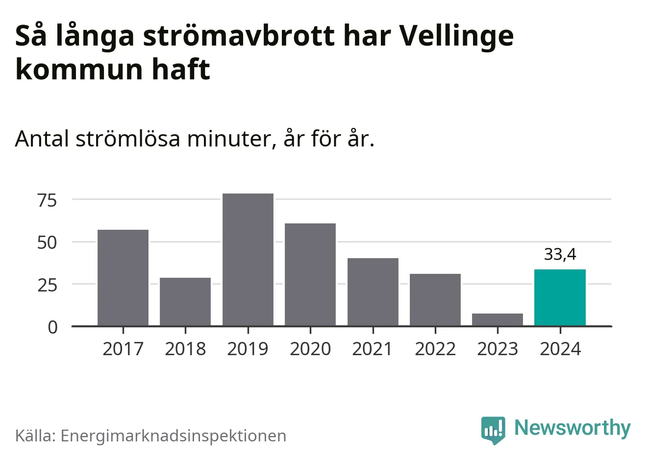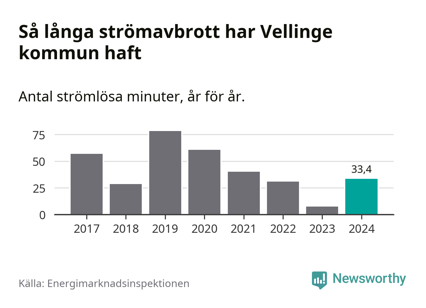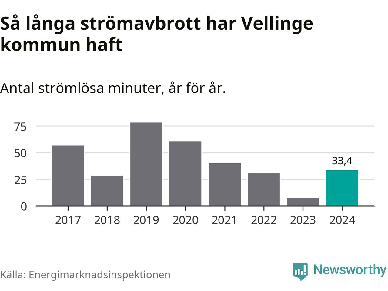 Antalet strömavbrott och total strömlös tid varierar något från år till år i Vellinge kommun. Mest tid utan ström (i alla fall under perioden 2017–2024) fick Vellingeborna genomleva under 2019 – en timme och 18 minuter. Det är 41 minuter längre än under ett normalår.