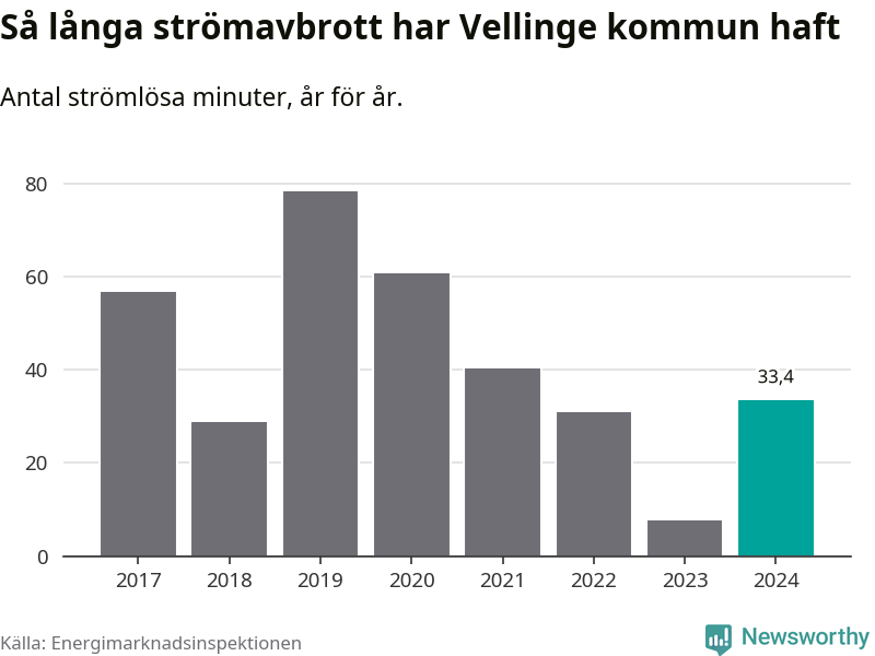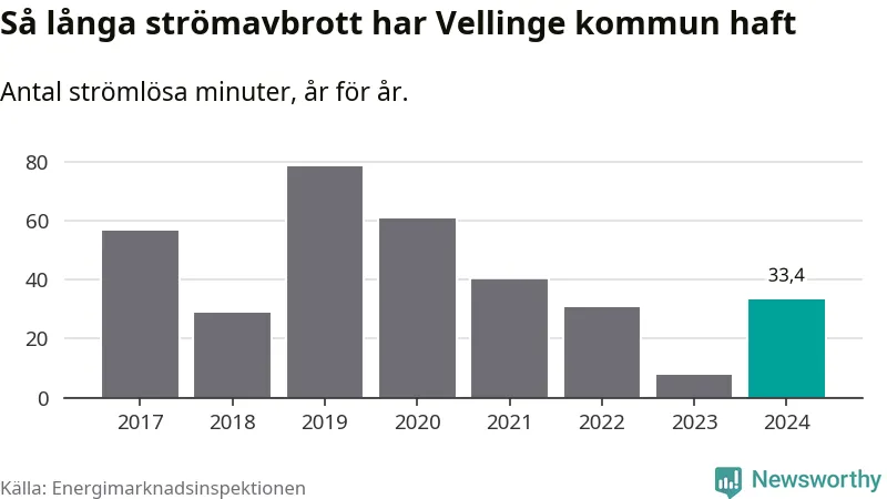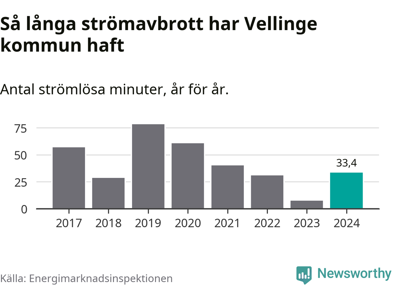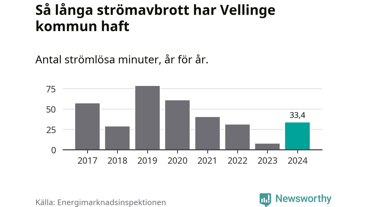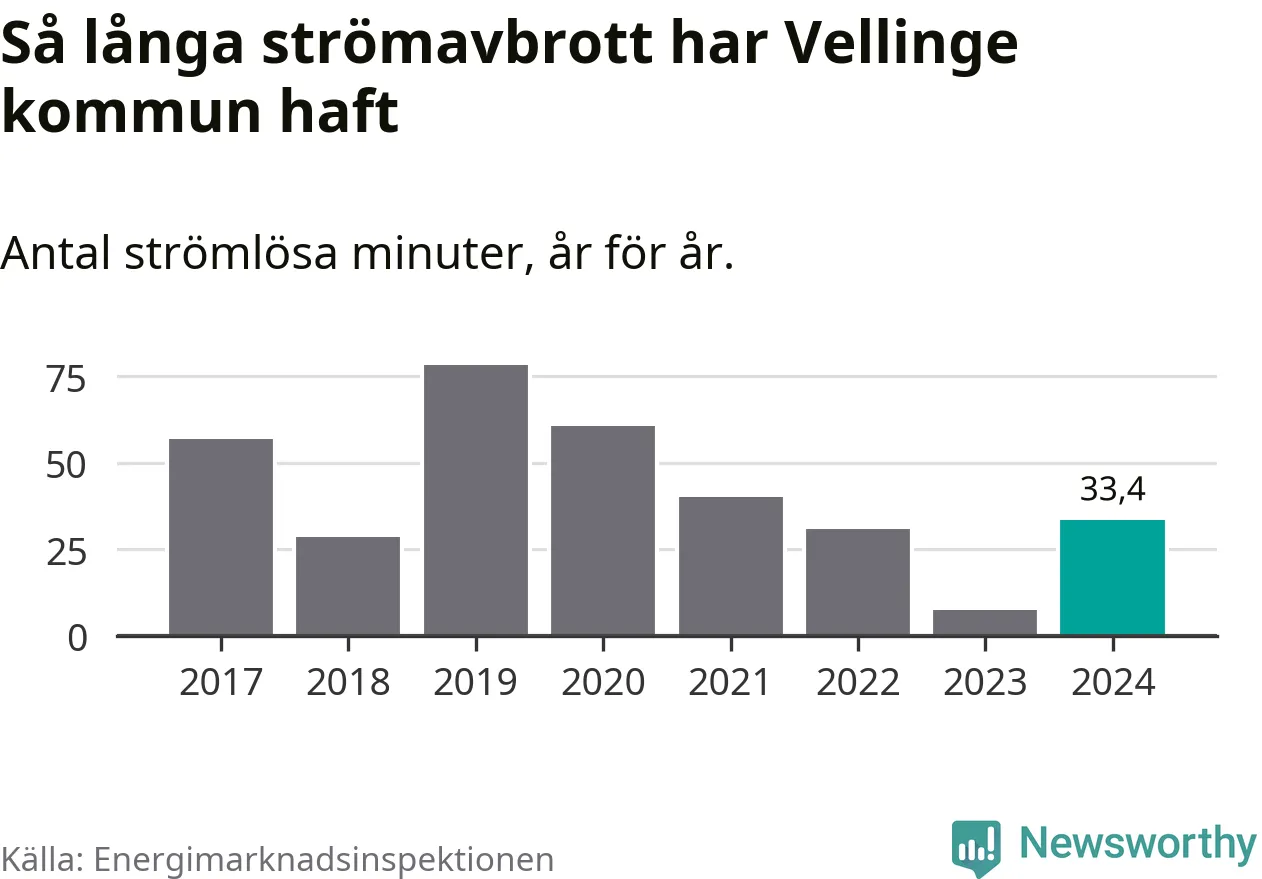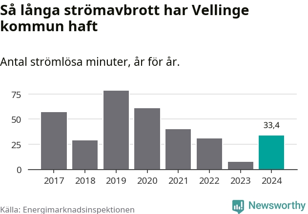 Antalet strömavbrott och total strömlös tid varierar något från år till år i Vellinge kommun. Mest tid utan ström (i alla fall under perioden 2017–2024) fick Vellingeborna genomleva under 2019 – en timme och 18 minuter. Det är 41 minuter längre än under ett normalår.