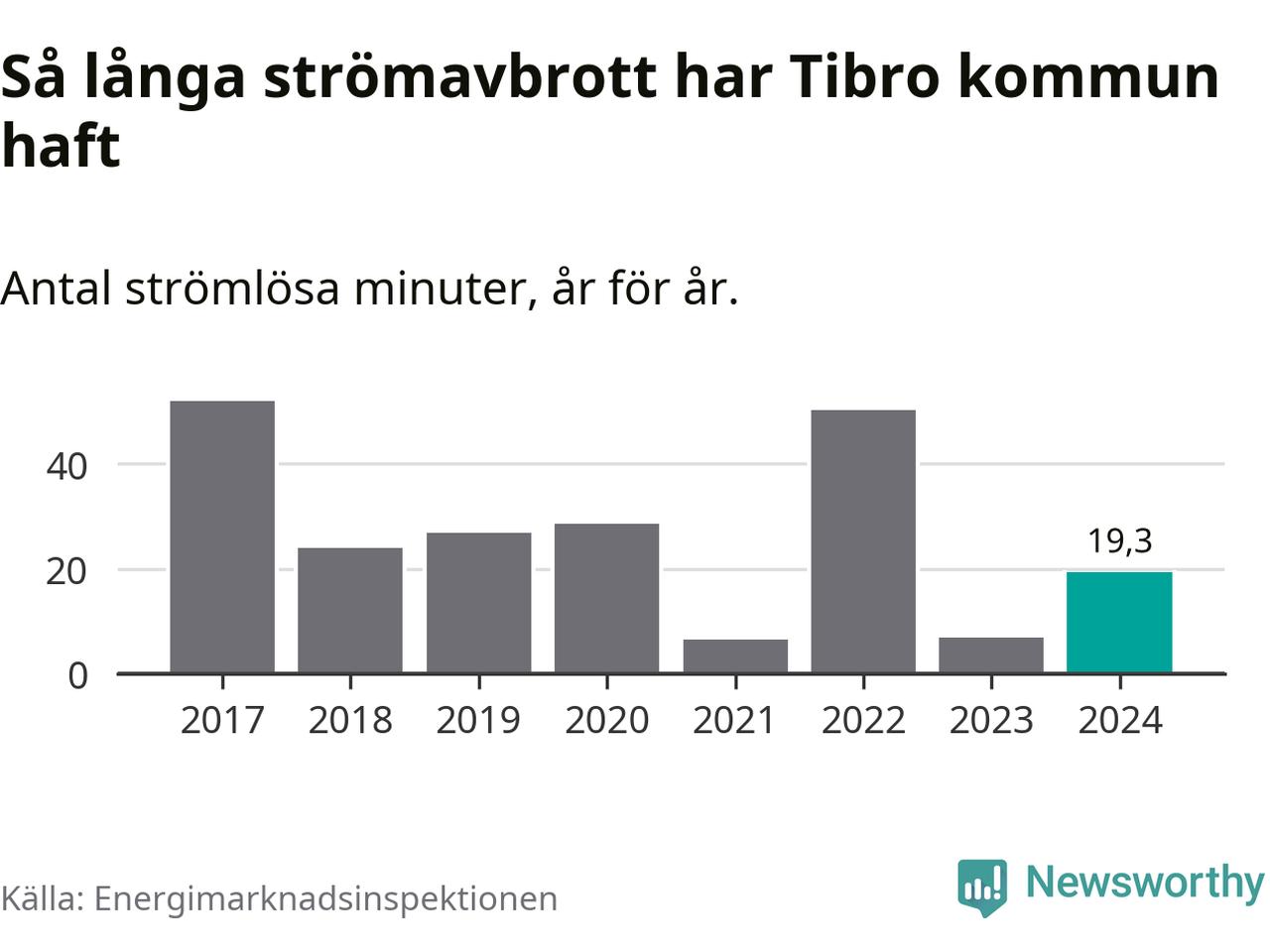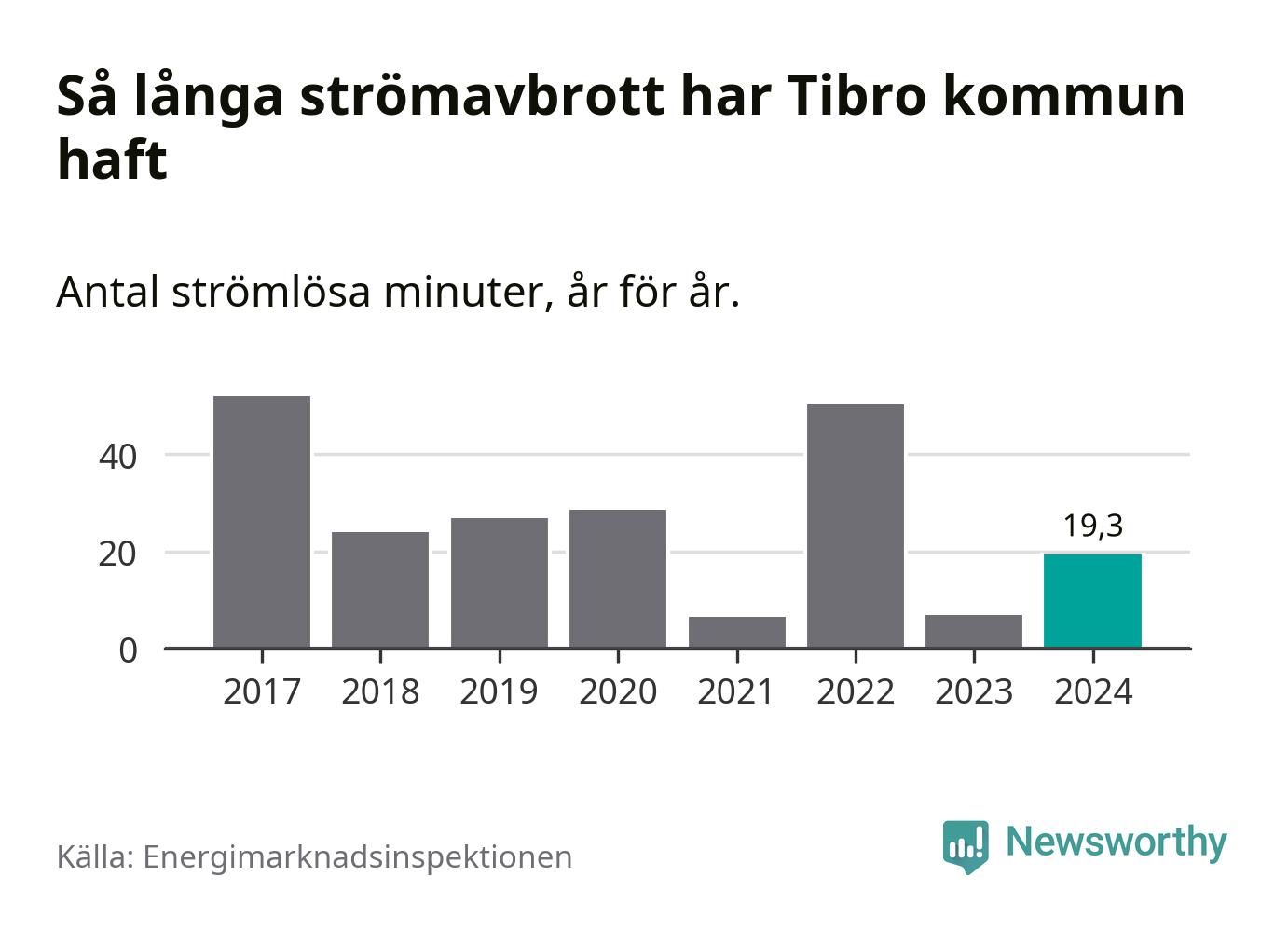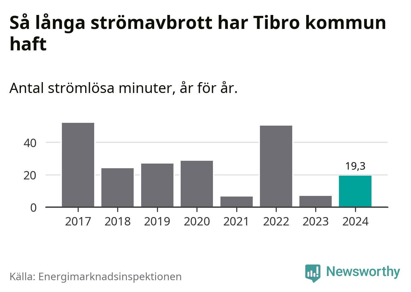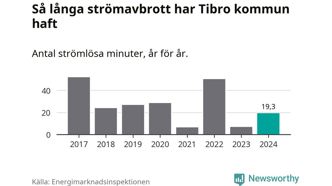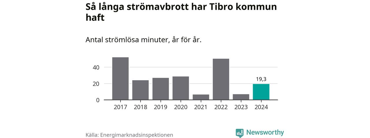 Antalet strömavbrott och total strömlös tid varierar något från år till år i Tibro kommun. Mest tid utan ström (i alla fall under perioden 2017–2024) fick Tibroborna genomleva under 2017 – 52 minuter. Det är 27 minuter längre än under ett normalår.