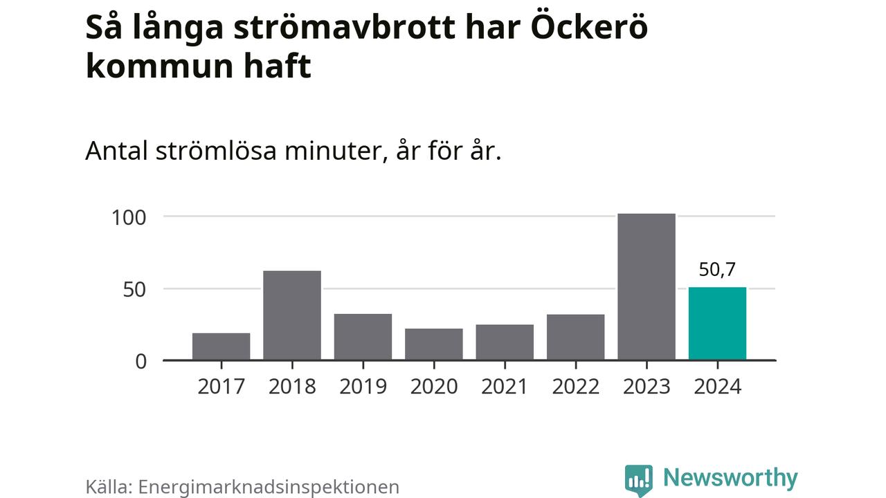 Antalet strömavbrott och total strömlös tid varierar något från år till år i Öckerö kommun. Mest tid utan ström (i alla fall under perioden 2017–2024) fick Öckeröborna genomleva under 2023 – en timme och 42 minuter. Det är en timme och tio minuter längre än under ett normalår.