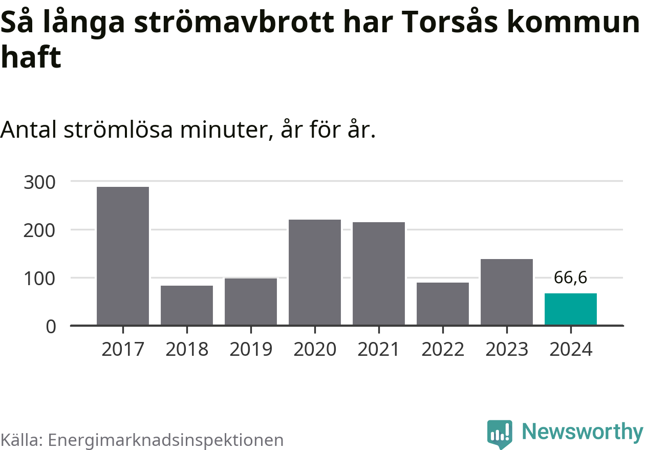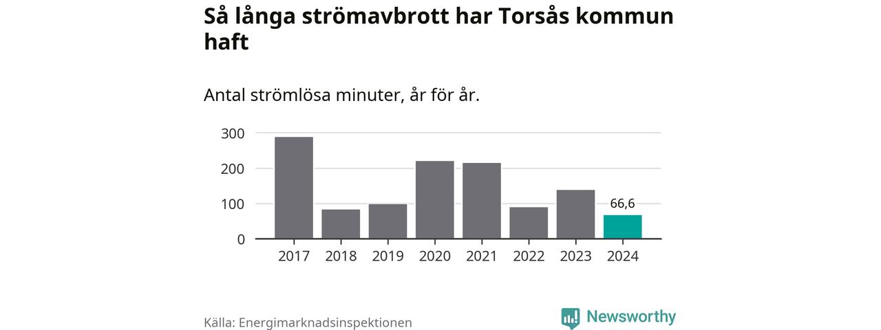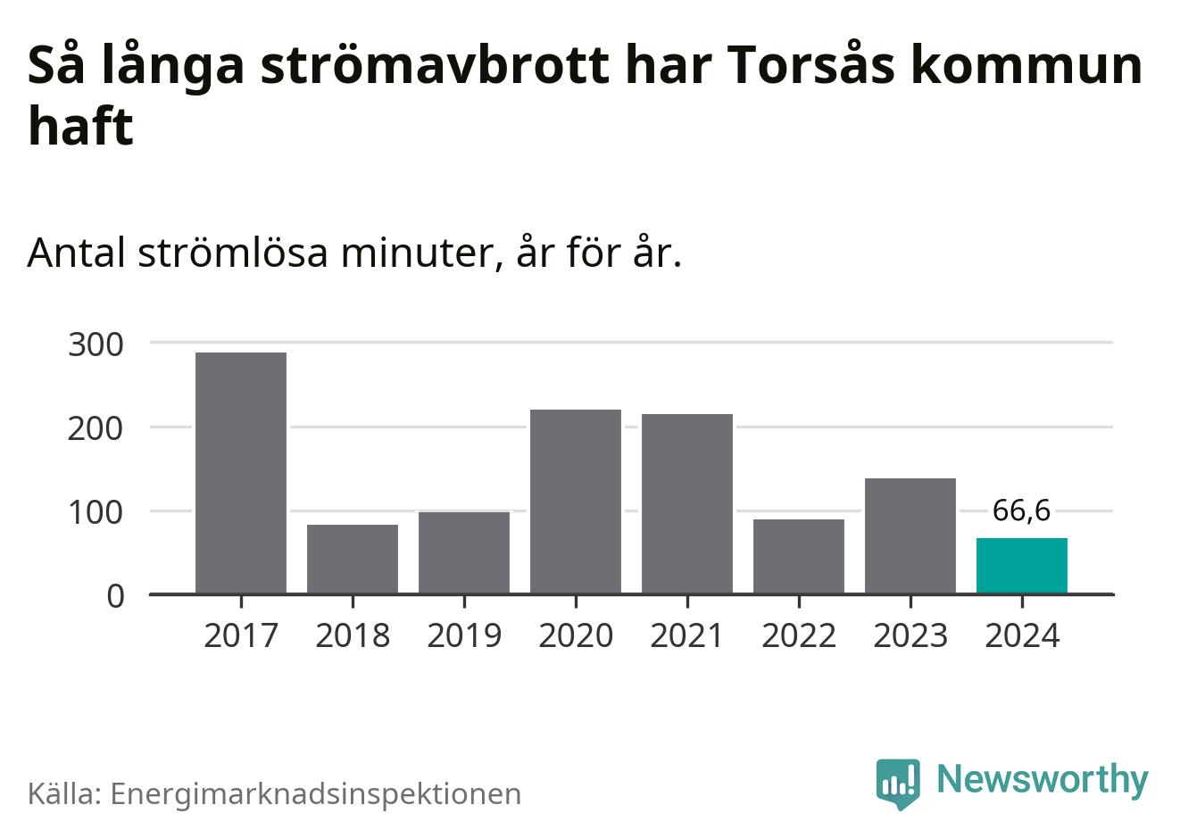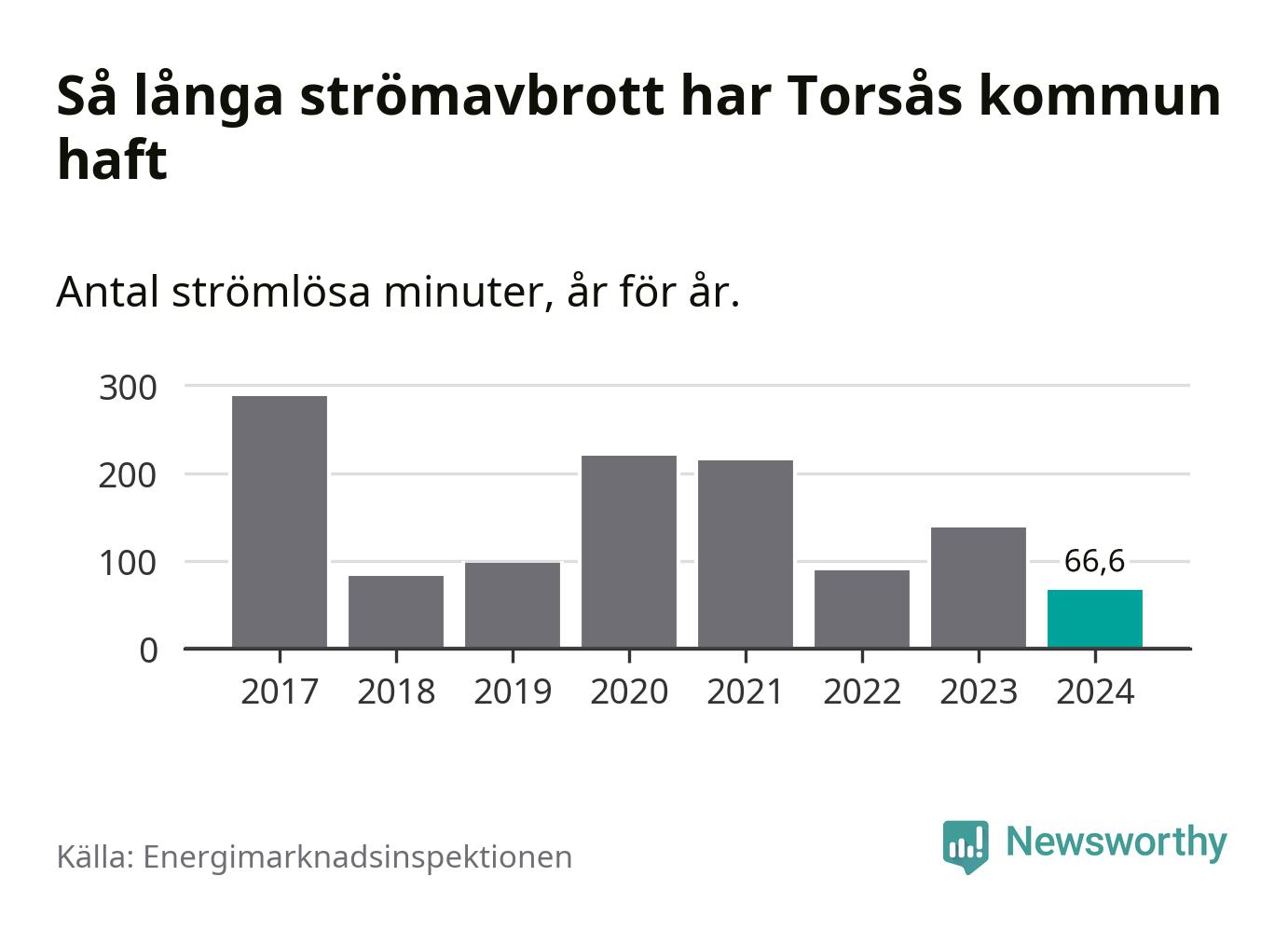 Antalet strömavbrott och total strömlös tid varierar från år till år i Torsås kommun. Mest tid utan ström (i alla fall under perioden 2017–2024) fick Torsåsborna genomleva under 2017 – fyra timmar och 48 minuter. Det är två timmar och 50 minuter längre än under ett normalår.