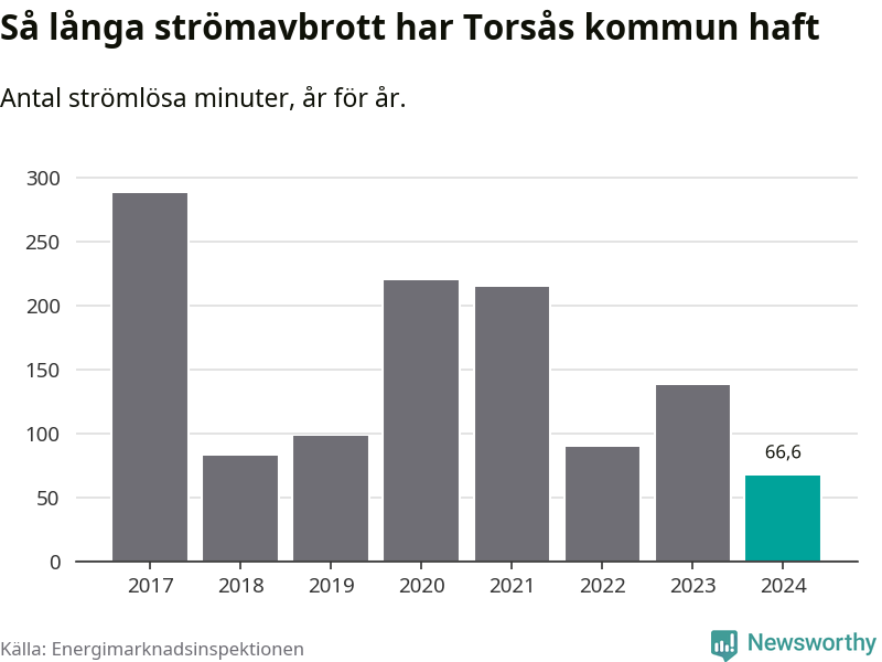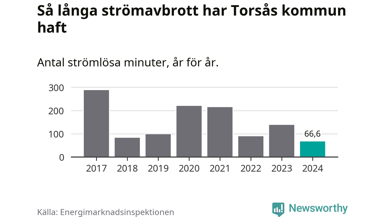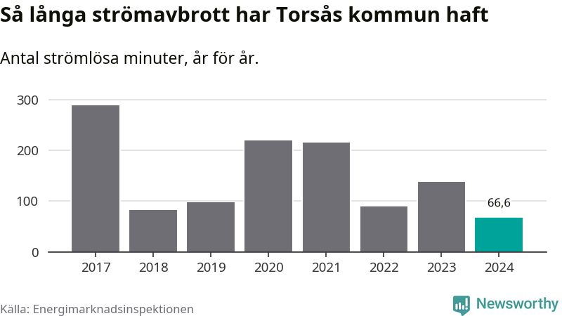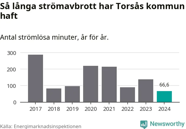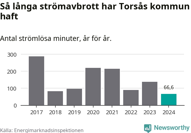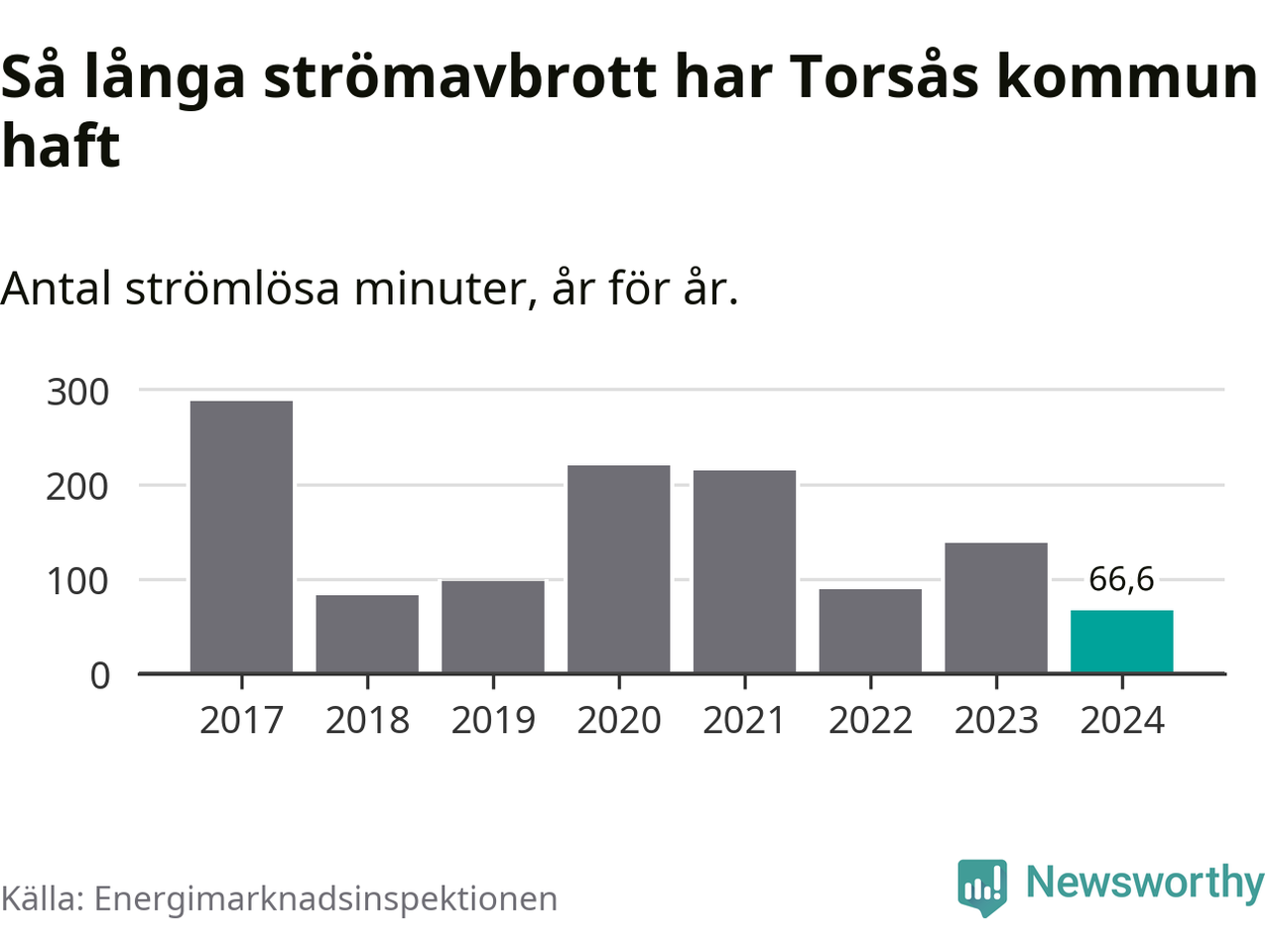 Antalet strömavbrott och total strömlös tid varierar från år till år i Torsås kommun. Mest tid utan ström (i alla fall under perioden 2017–2024) fick Torsåsborna genomleva under 2017 – fyra timmar och 48 minuter. Det är två timmar och 50 minuter längre än under ett normalår.