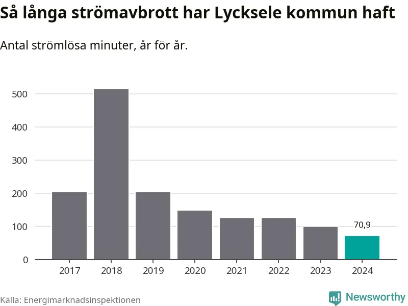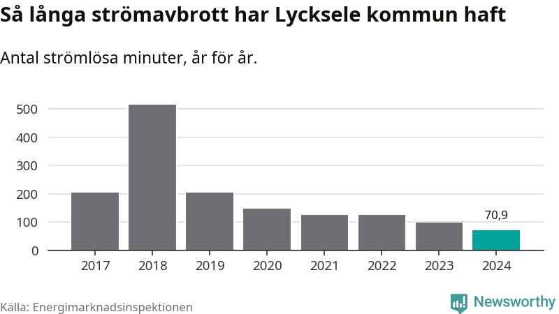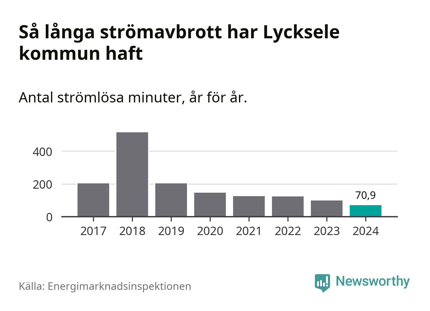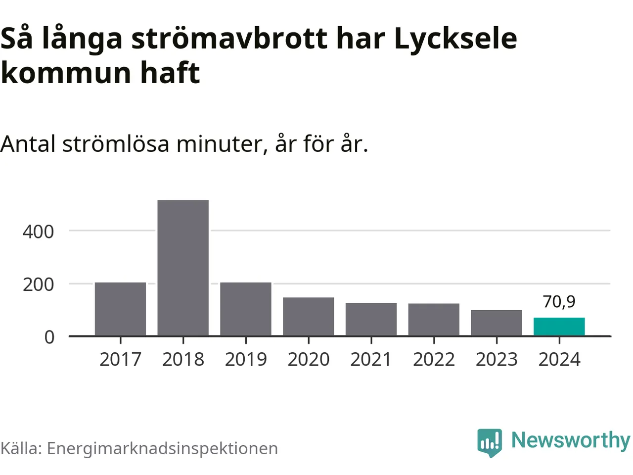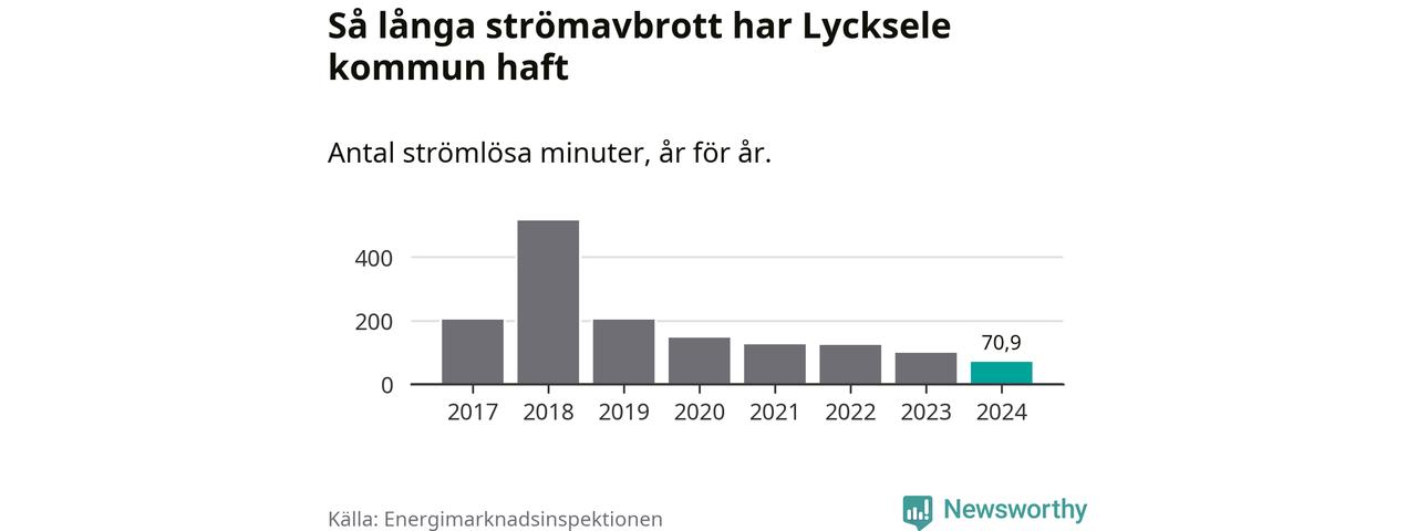 Antalet strömavbrott och total strömlös tid varierar från år till år i Lycksele kommun. Mest tid utan ström (i alla fall under perioden 2017–2024) fick Lyckseleborna genomleva under 2018 – åtta timmar och 34 minuter. Det är sex timmar och 19 minuter längre än under ett normalår.