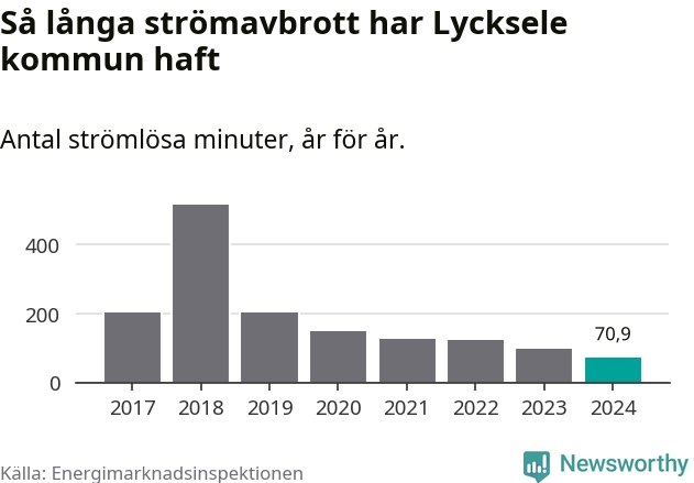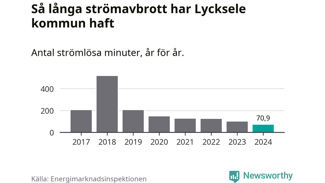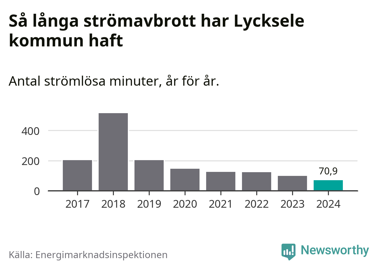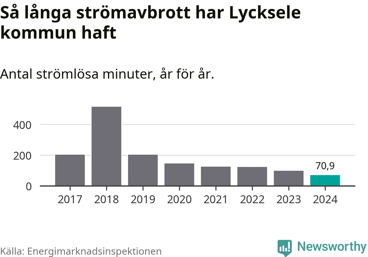 Antalet strömavbrott och total strömlös tid varierar från år till år i Lycksele kommun. Mest tid utan ström (i alla fall under perioden 2017–2024) fick Lyckseleborna genomleva under 2018 – åtta timmar och 34 minuter. Det är sex timmar och 19 minuter längre än under ett normalår.