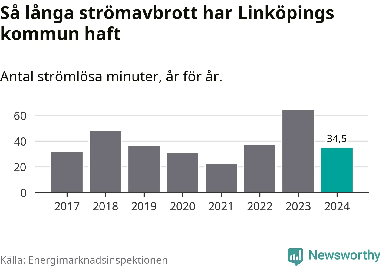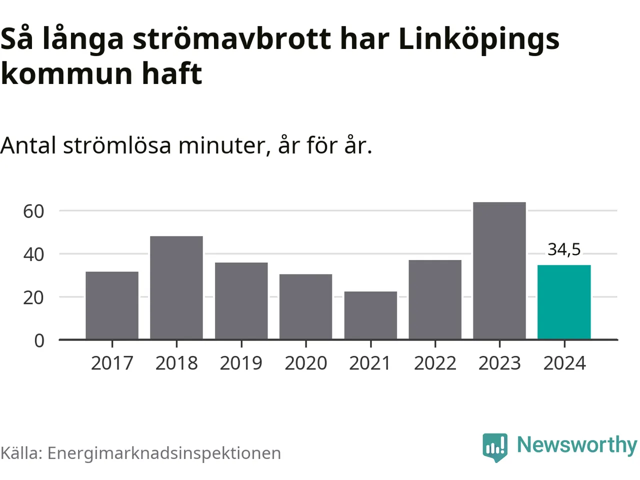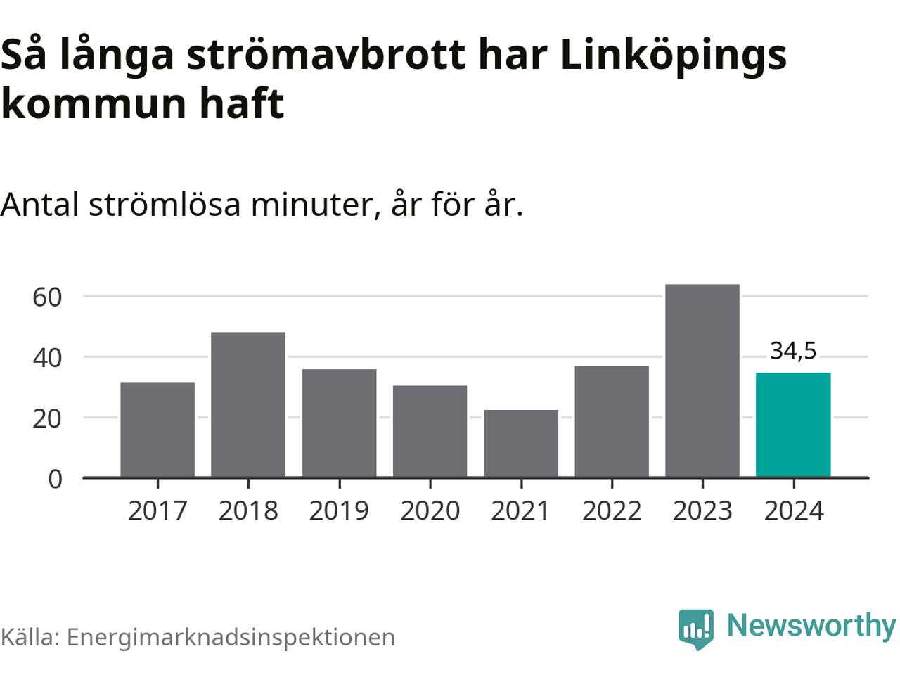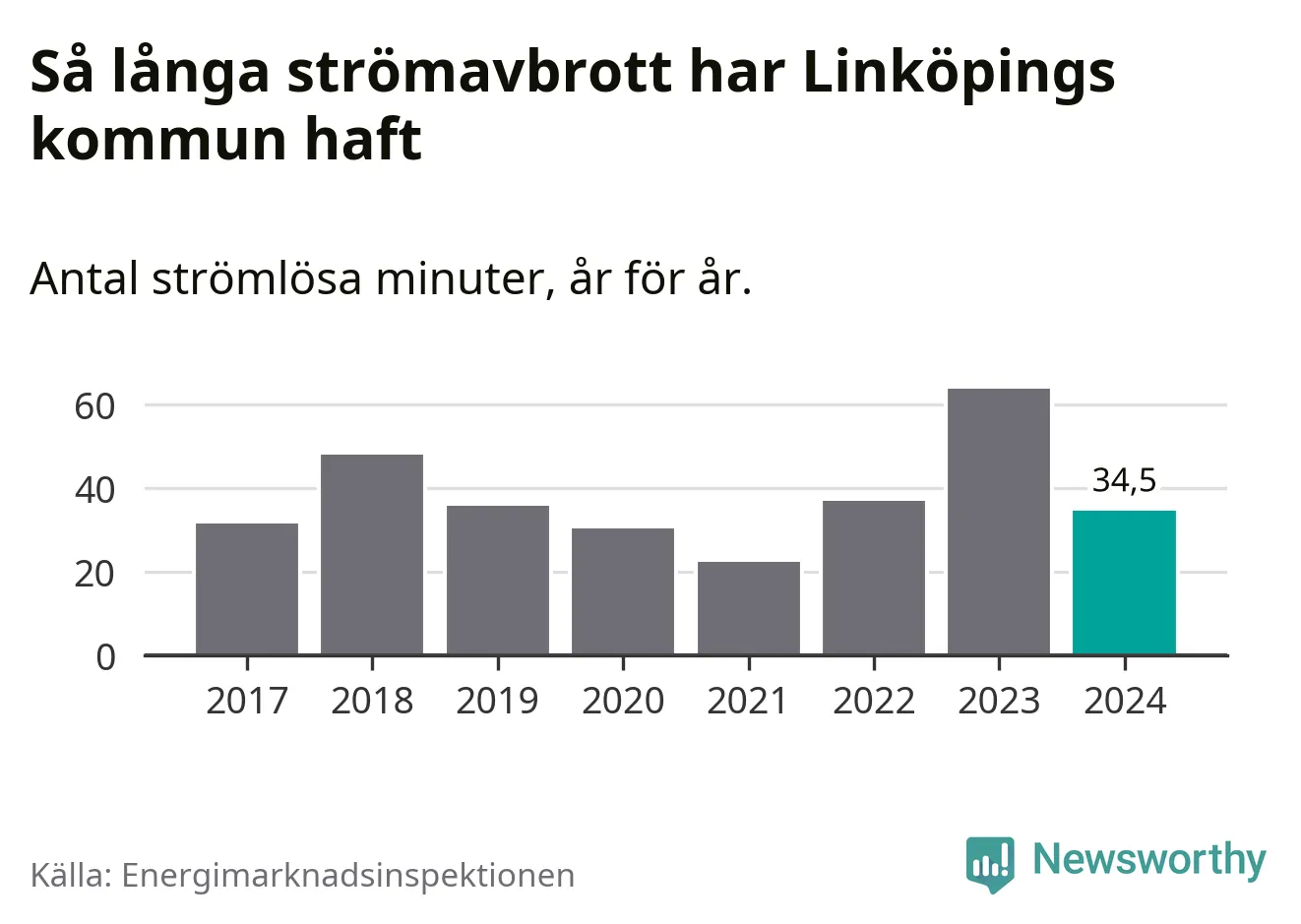 Antalet strömavbrott och total strömlös tid varierar något från år till år i Linköpings kommun. Mest tid utan ström (i alla fall under perioden 2017–2024) fick Linköpingsborna genomleva under 2023 – en timme och fyra minuter. Det är 29 minuter längre än under ett normalår.