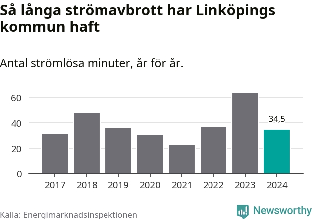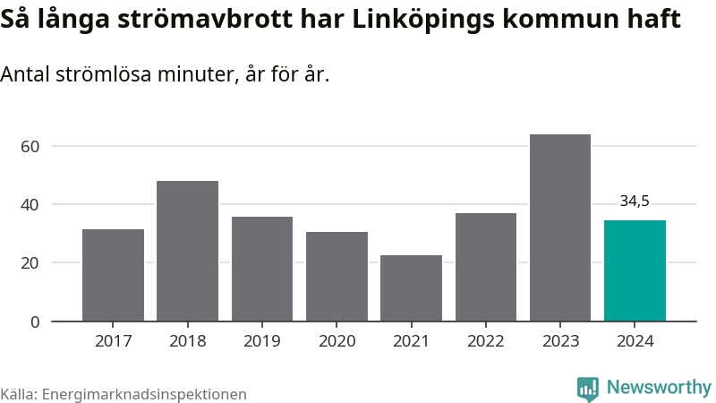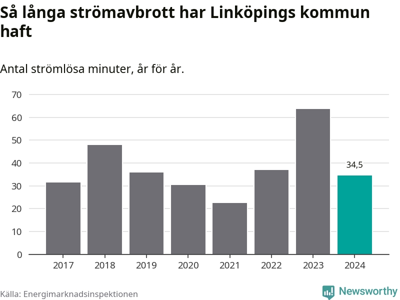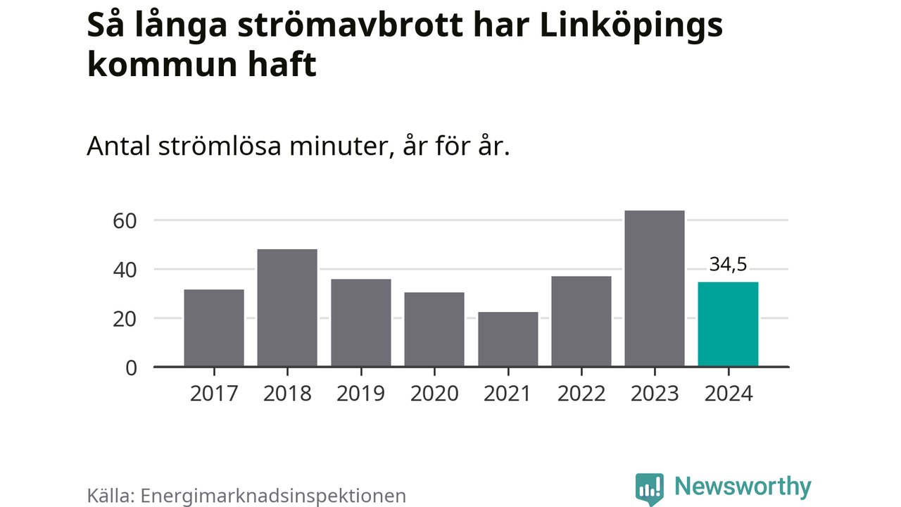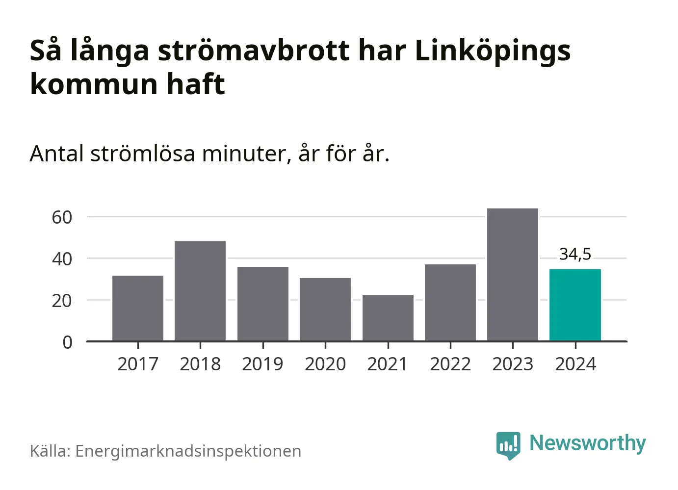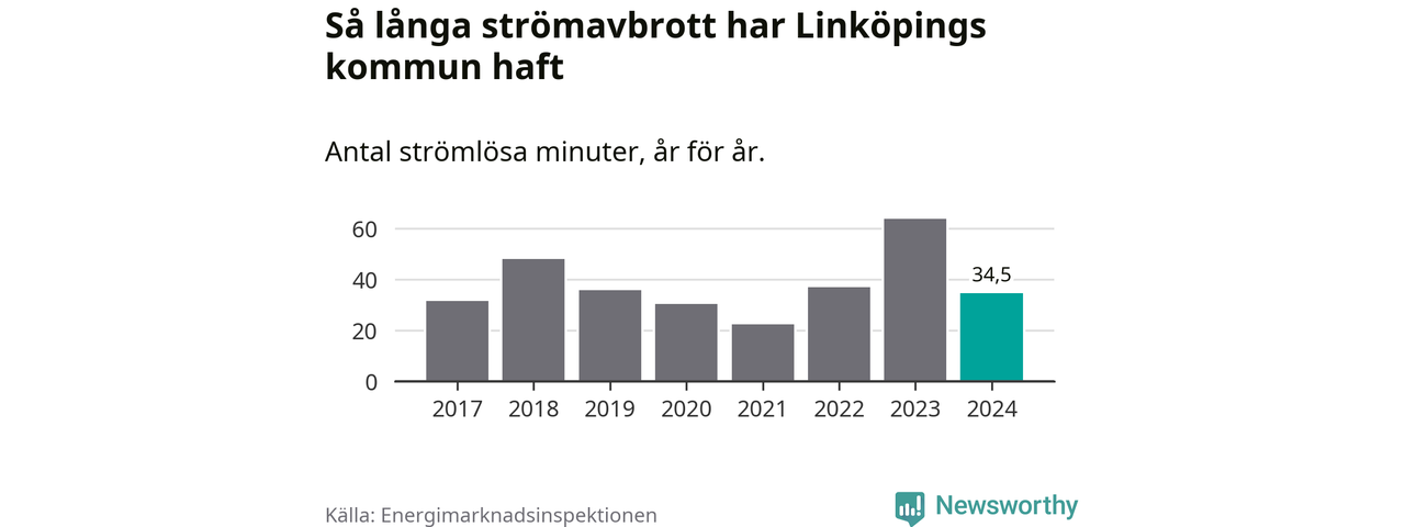 Antalet strömavbrott och total strömlös tid varierar något från år till år i Linköpings kommun. Mest tid utan ström (i alla fall under perioden 2017–2024) fick Linköpingsborna genomleva under 2023 – en timme och fyra minuter. Det är 29 minuter längre än under ett normalår.