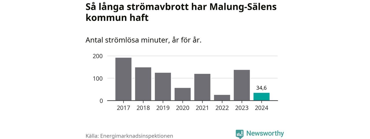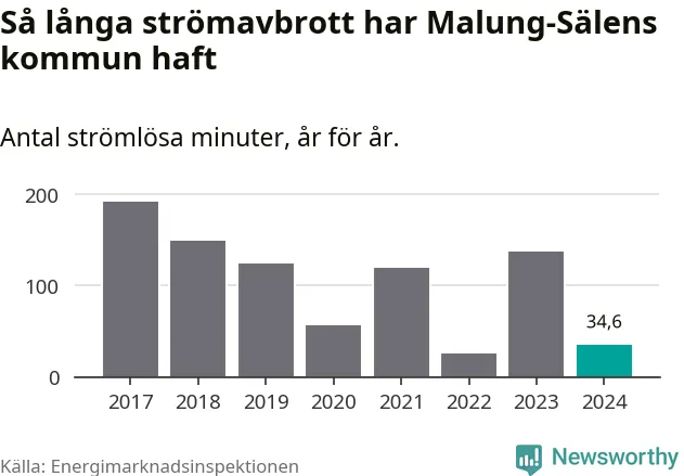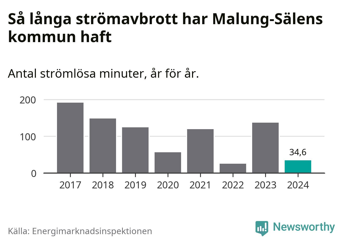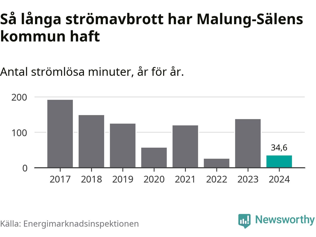 Antalet strömavbrott och total strömlös tid varierar något från år till år i Malung-Sälens kommun. Mest tid utan ström (i alla fall under perioden 2017–2024) fick Malung-Sälenborna genomleva under 2017 – tre timmar och tolv minuter. Det är en timme och tio minuter längre än under ett normalår.