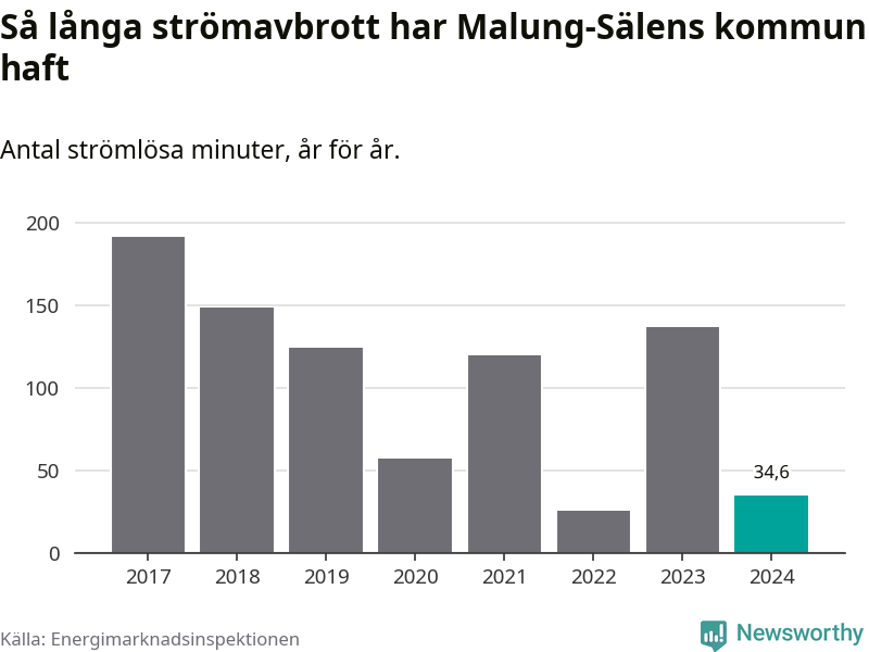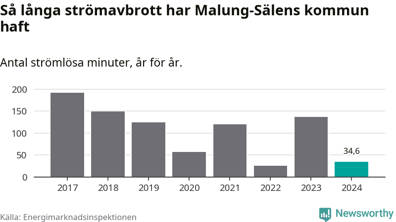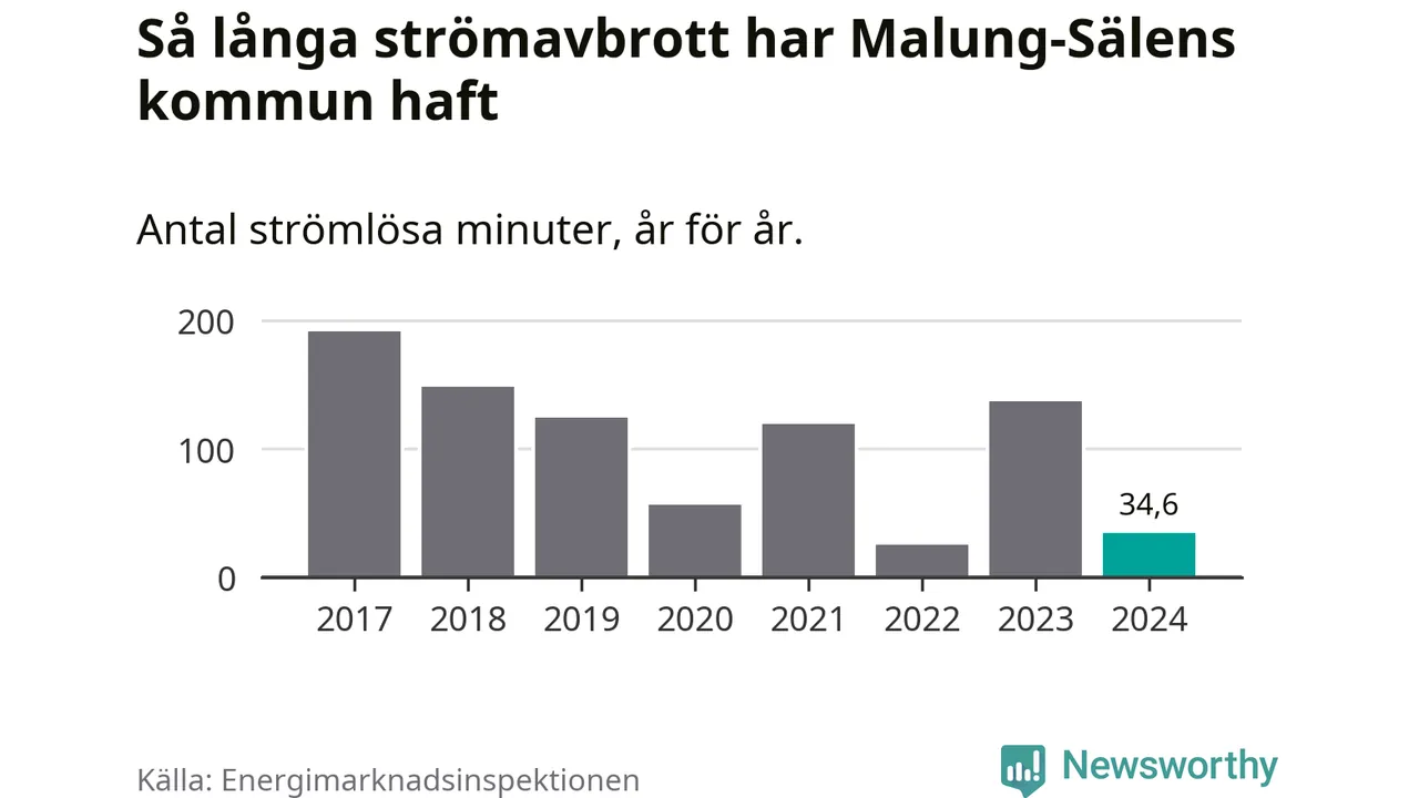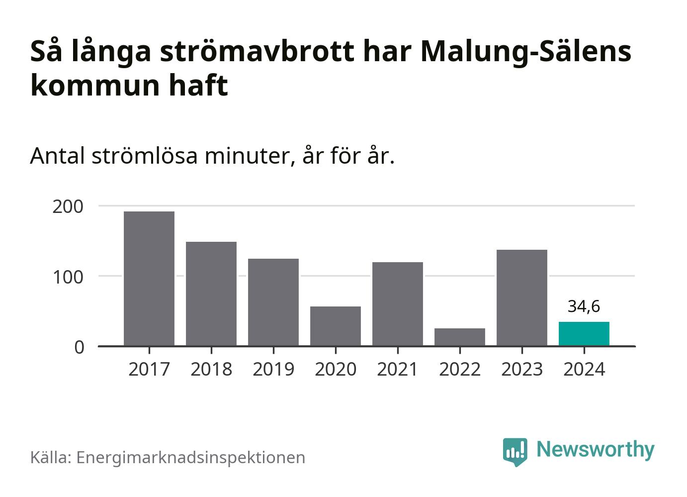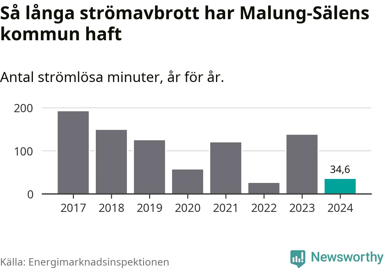Antalet strömavbrott och total strömlös tid varierar något från år till år i Malung-Sälens kommun. Mest tid utan ström (i alla fall under perioden 2017–2024) fick Malung-Sälenborna genomleva under 2017 – tre timmar och tolv minuter. Det är en timme och tio minuter längre än under ett normalår.