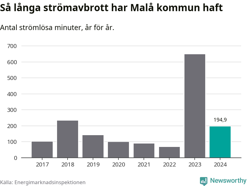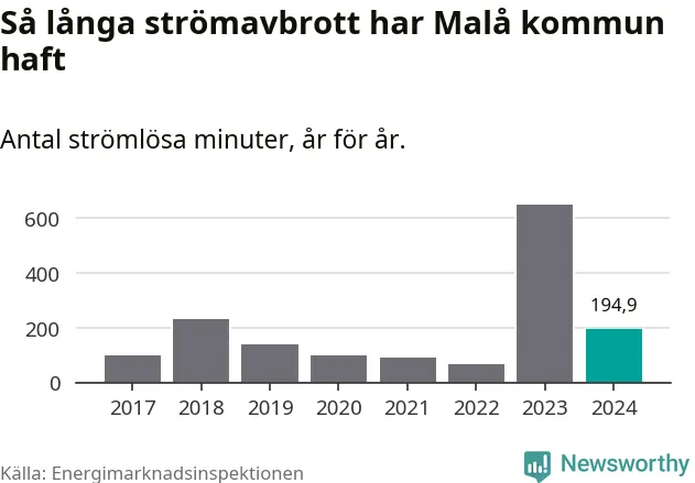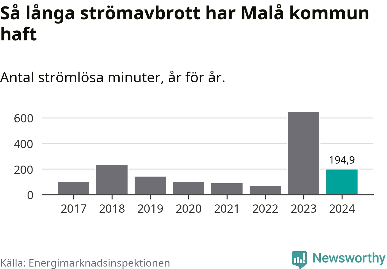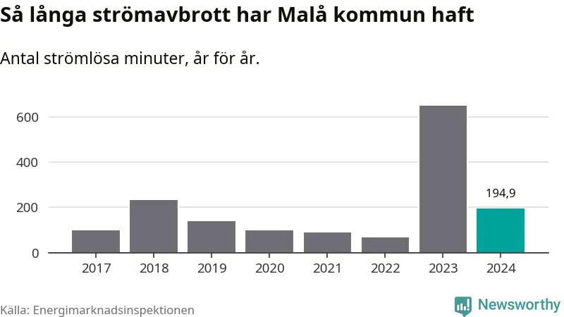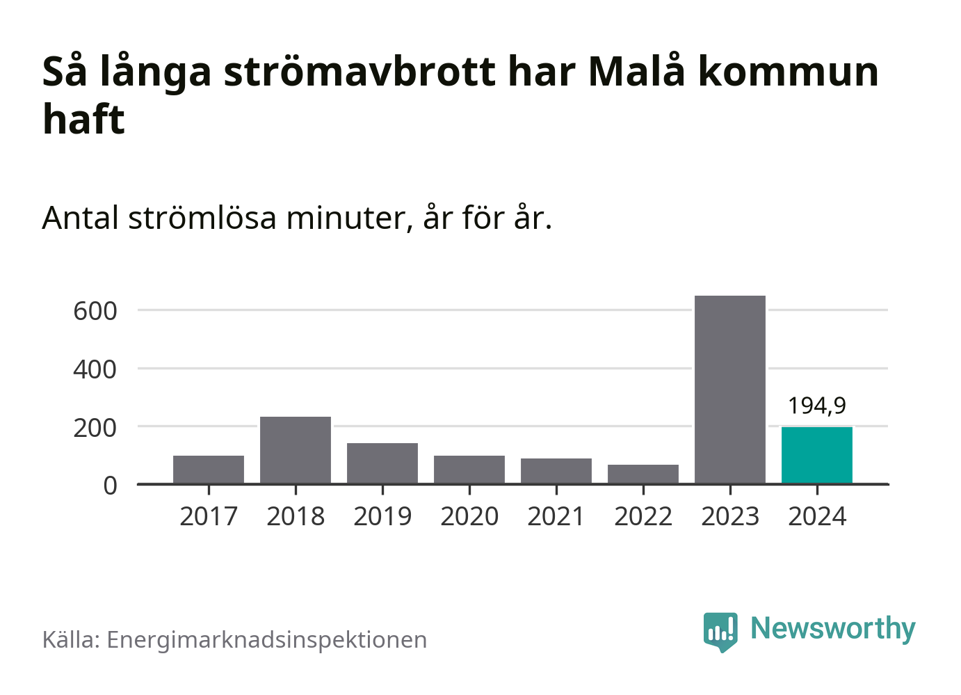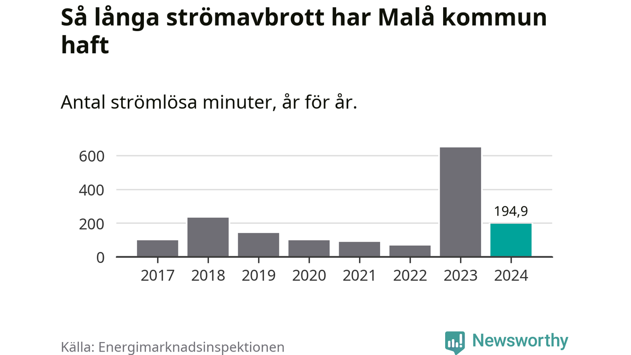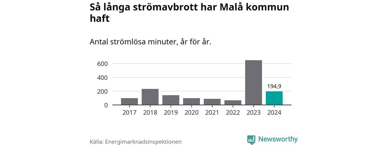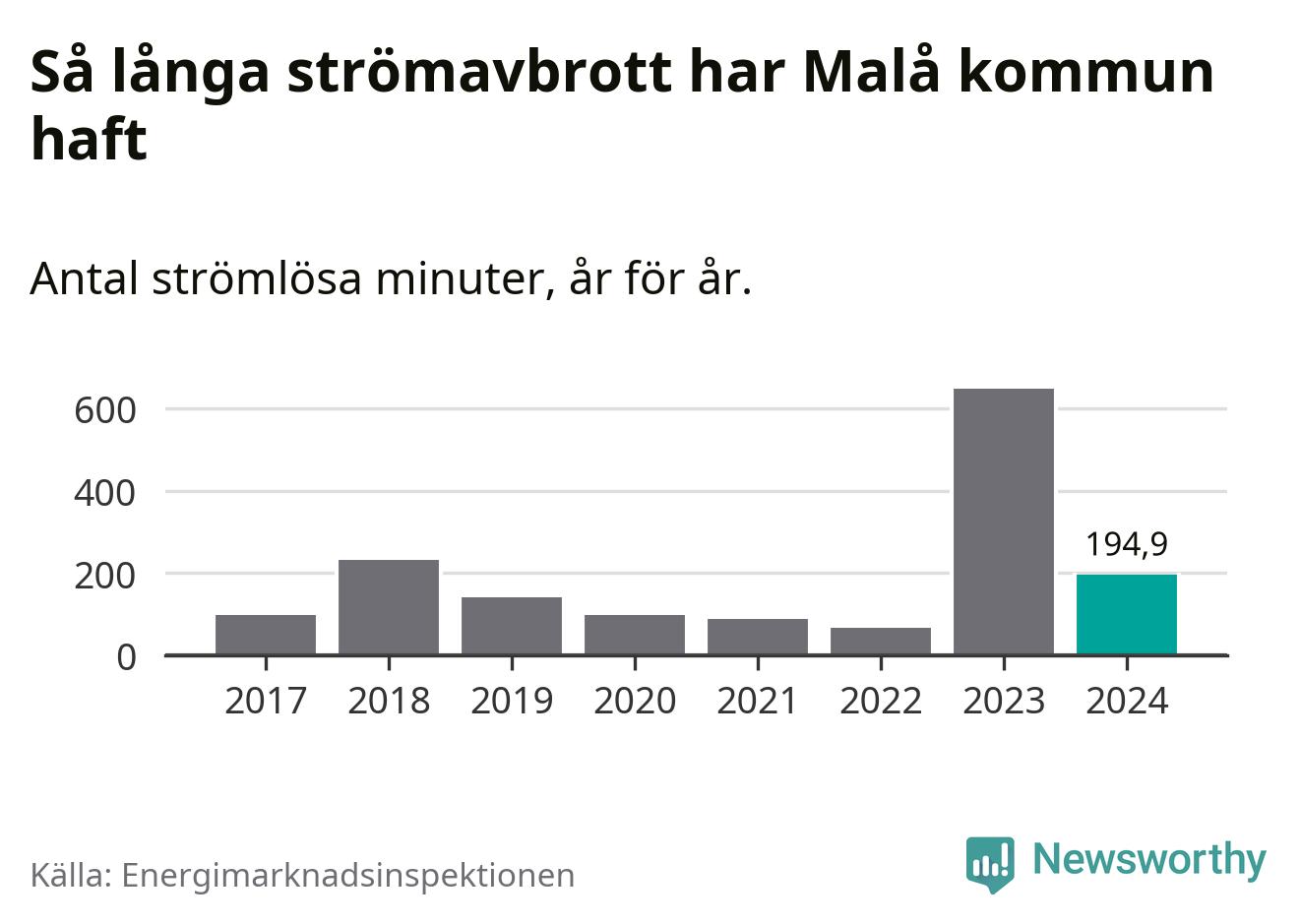 Antalet strömavbrott och total strömlös tid varierar från år till år i Malå kommun. Mest tid utan ström (i alla fall under perioden 2017–2024) fick Malåborna genomleva under 2023 – tio timmar och 48 minuter. Det är åtta timmar och 48 minuter längre än under ett normalår.