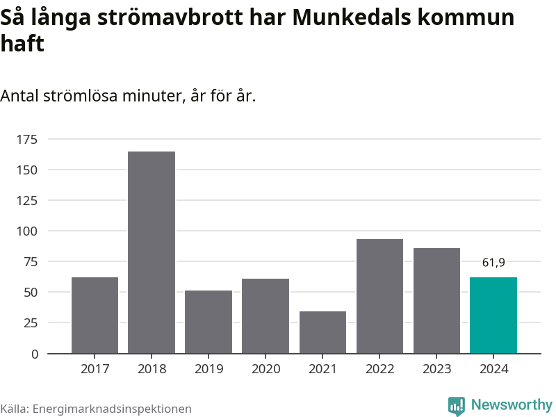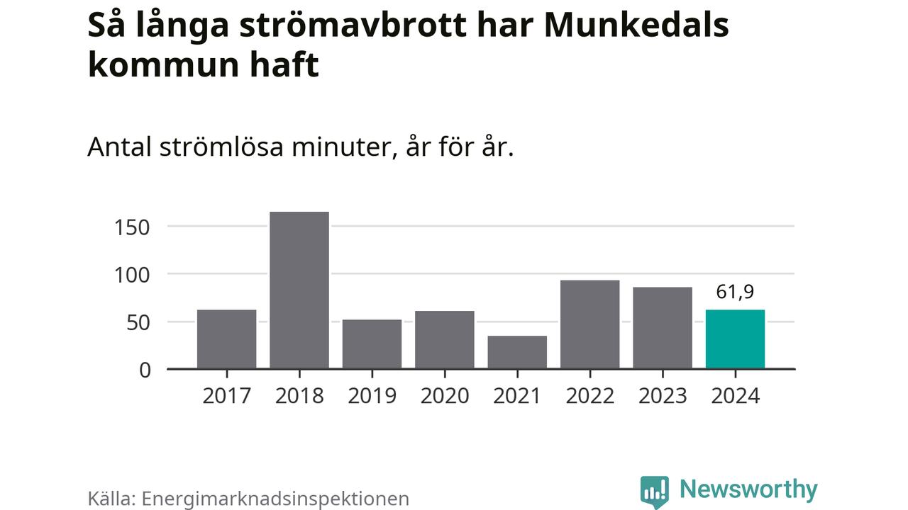 Antalet strömavbrott och total strömlös tid varierar från år till år i Munkedals kommun. Mest tid utan ström (i alla fall under perioden 2017–2024) fick Munkedalsborna genomleva under 2018 – två timmar och 45 minuter. Det är en timme och 43 minuter längre än under ett normalår.