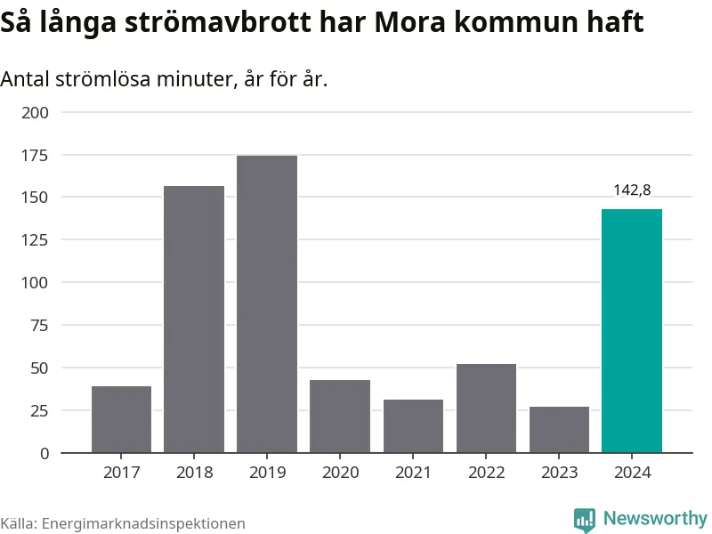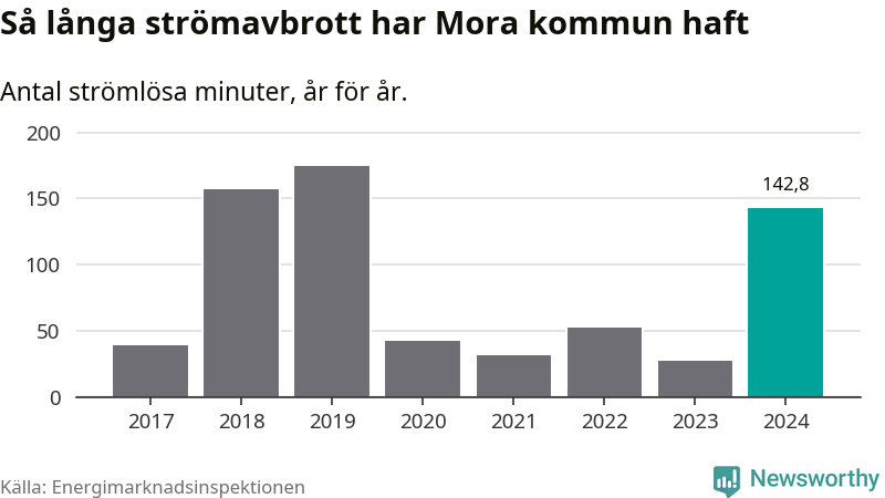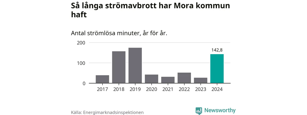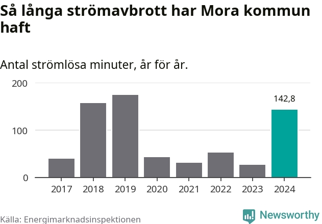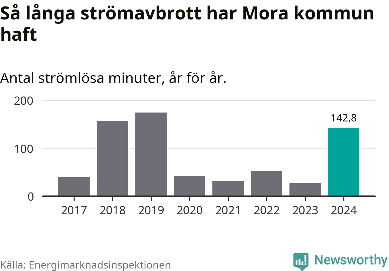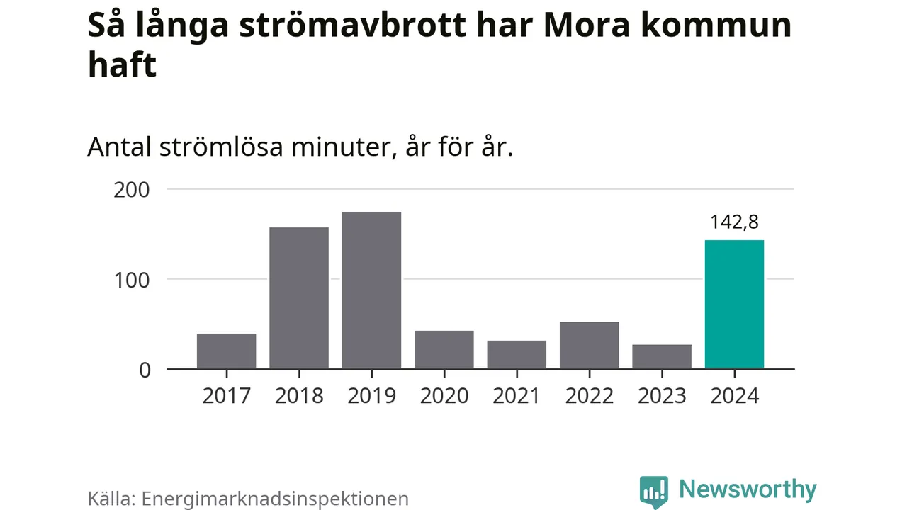 Antalet strömavbrott och total strömlös tid varierar från år till år i Mora kommun. Mest tid utan ström (i alla fall under perioden 2017–2024) fick Mora­borna genomleva under 2019 – två timmar och 54 minuter. Det är två timmar och sju minuter längre än under ett normalår.