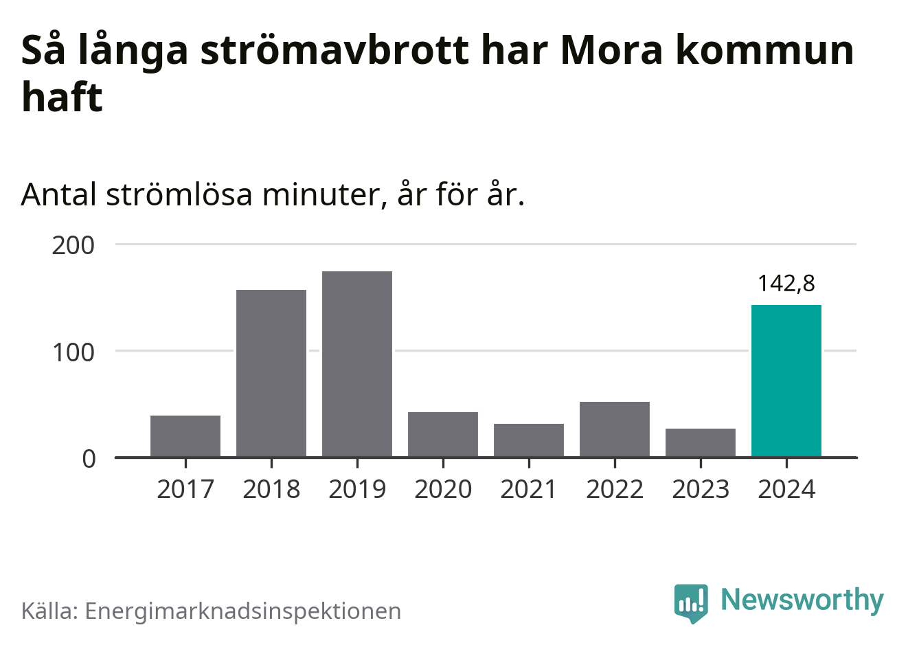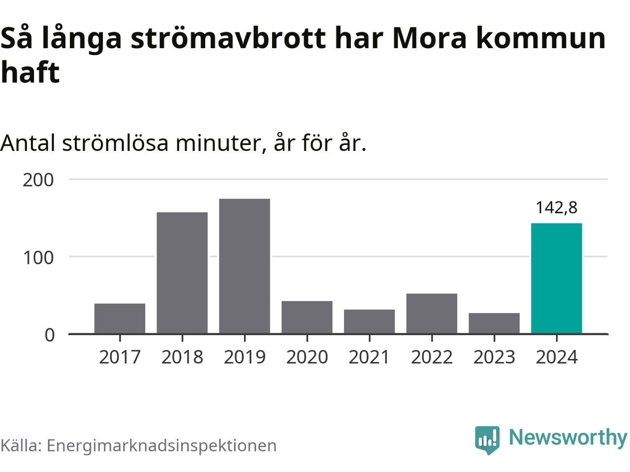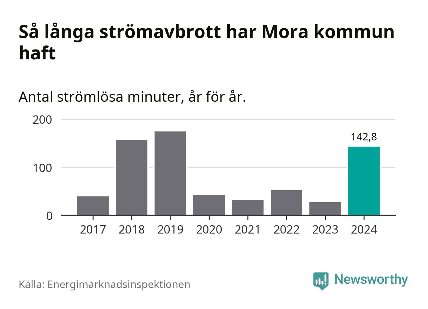 Antalet strömavbrott och total strömlös tid varierar från år till år i Mora kommun. Mest tid utan ström (i alla fall under perioden 2017–2024) fick Mora­borna genomleva under 2019 – två timmar och 54 minuter. Det är två timmar och sju minuter längre än under ett normalår.
