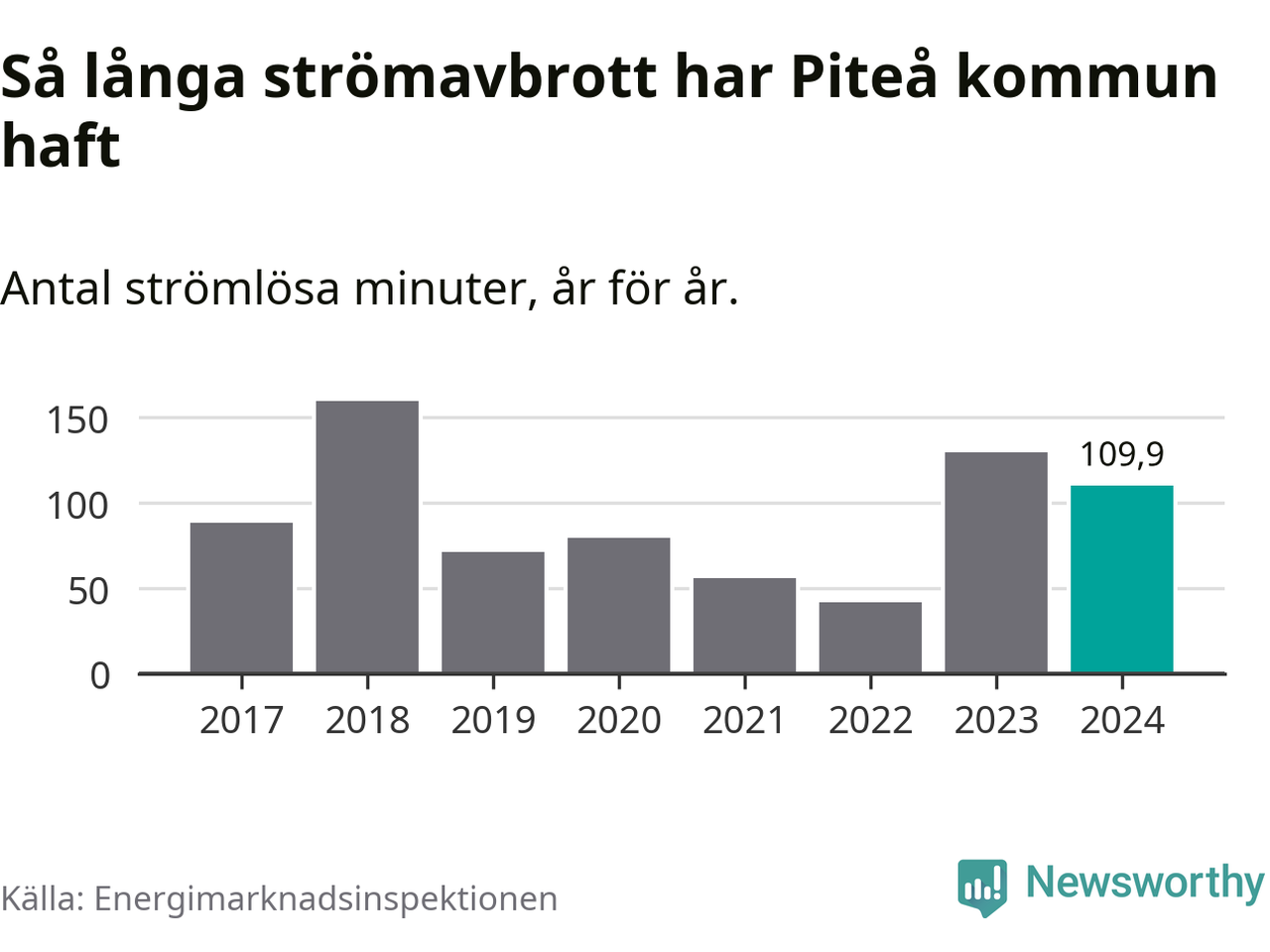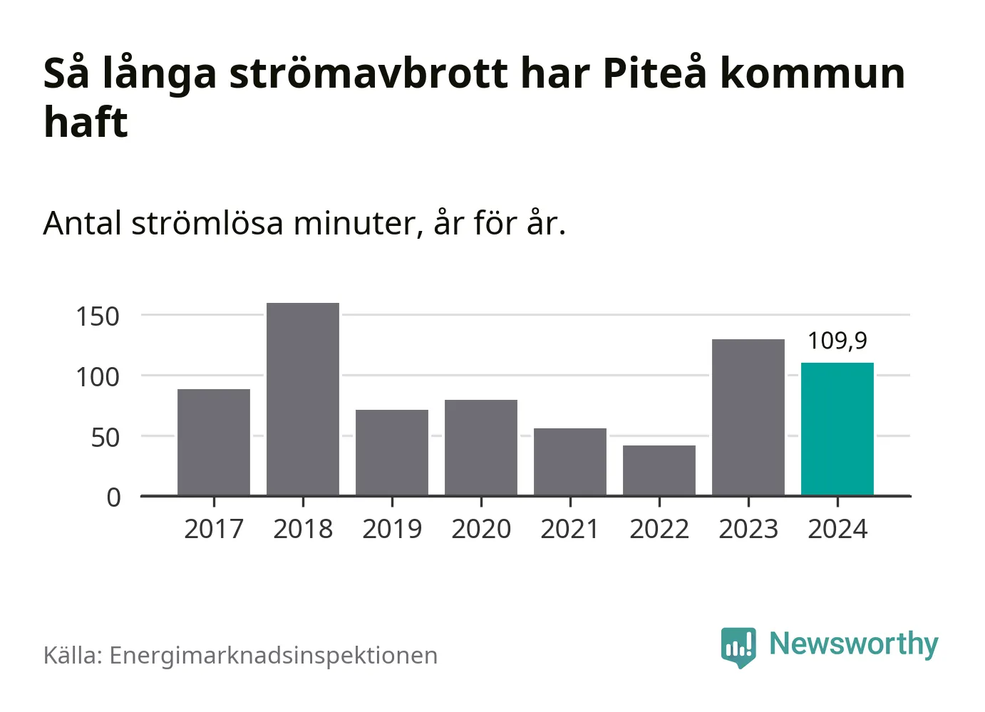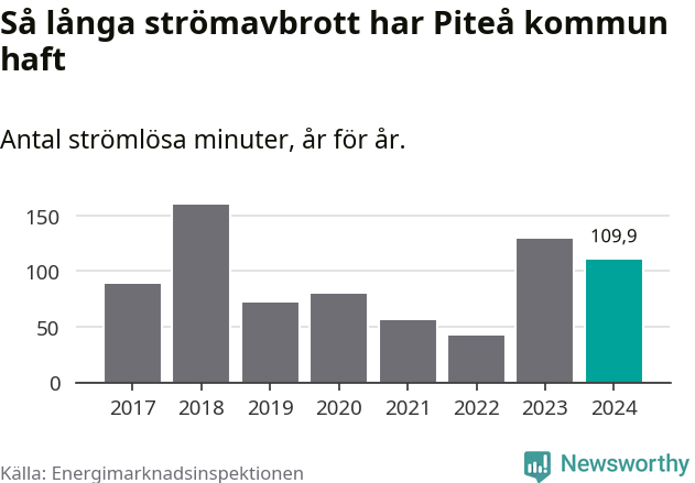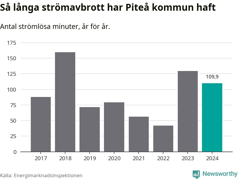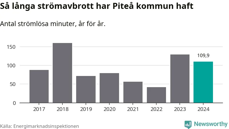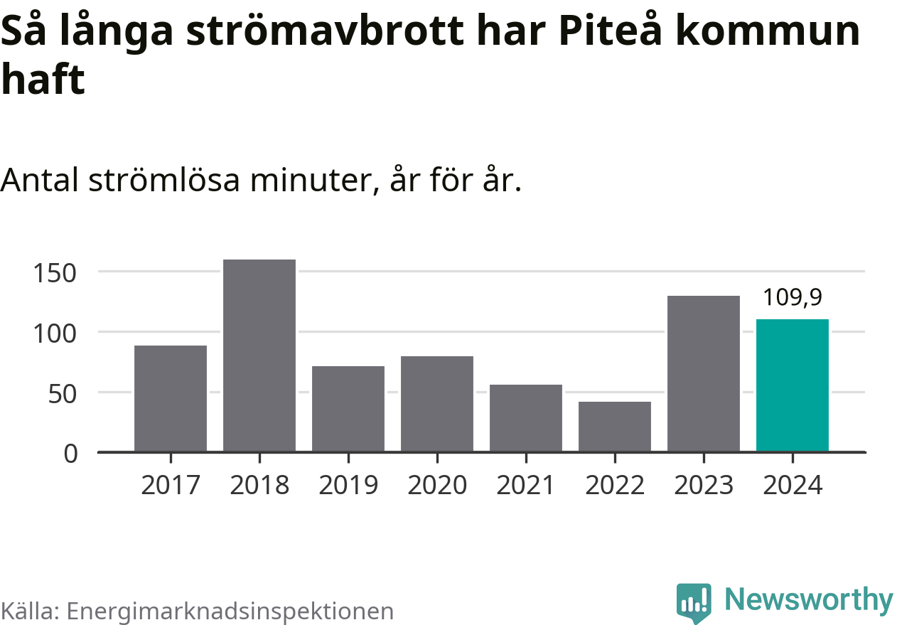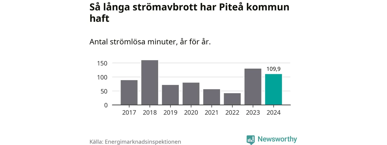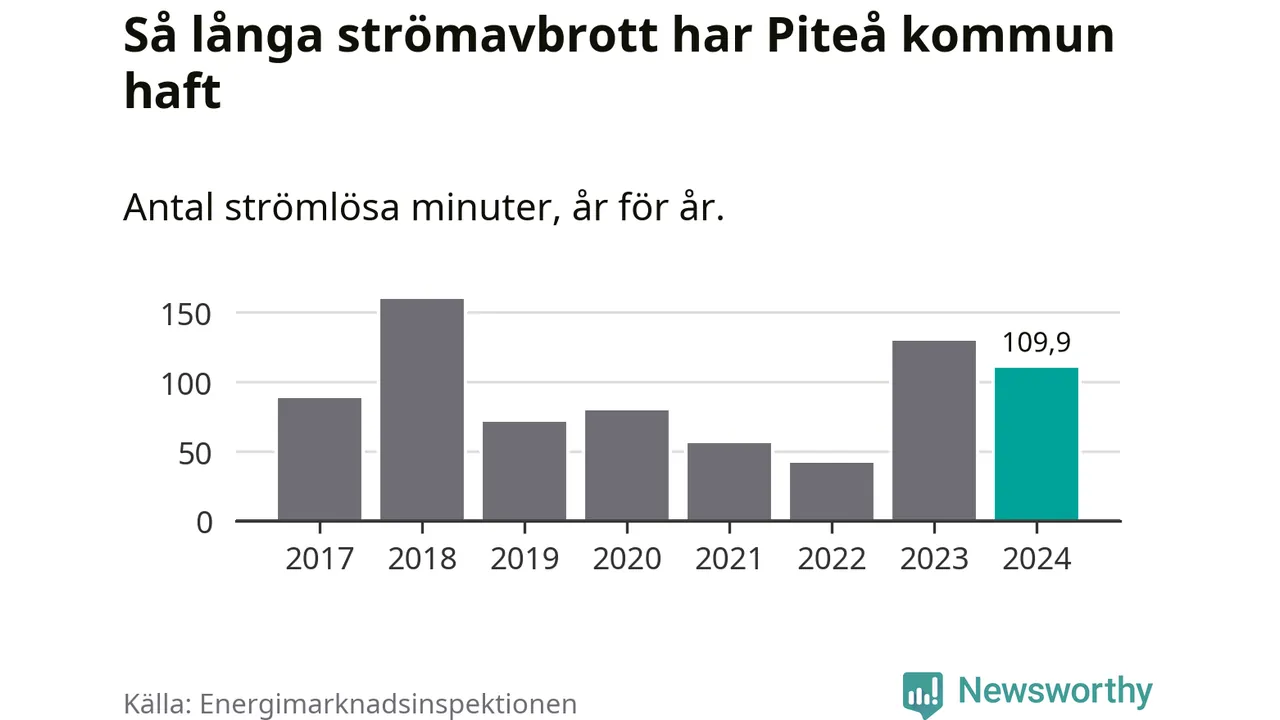 Antalet strömavbrott och total strömlös tid varierar något från år till år i Piteå kommun. Mest tid utan ström (i alla fall under perioden 2017–2024) fick Piteåborna genomleva under 2018 – två timmar och 40 minuter. Det är en timme och 16 minuter längre än under ett normalår.