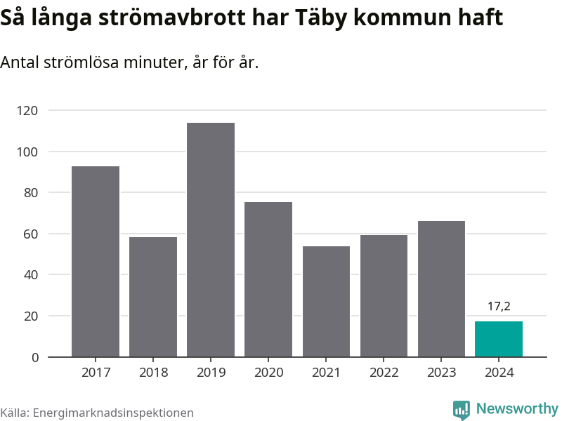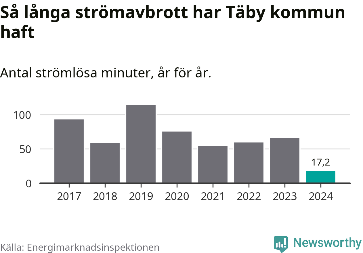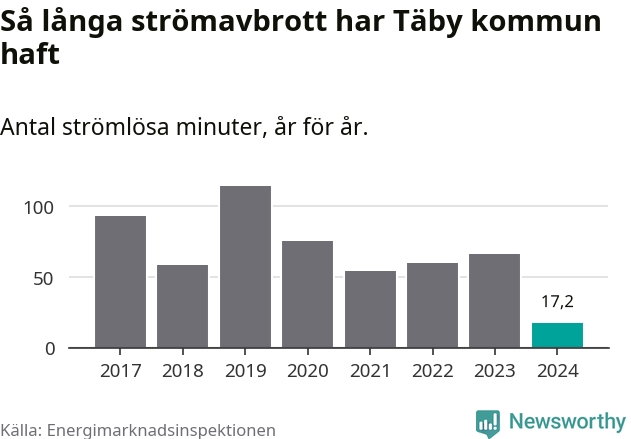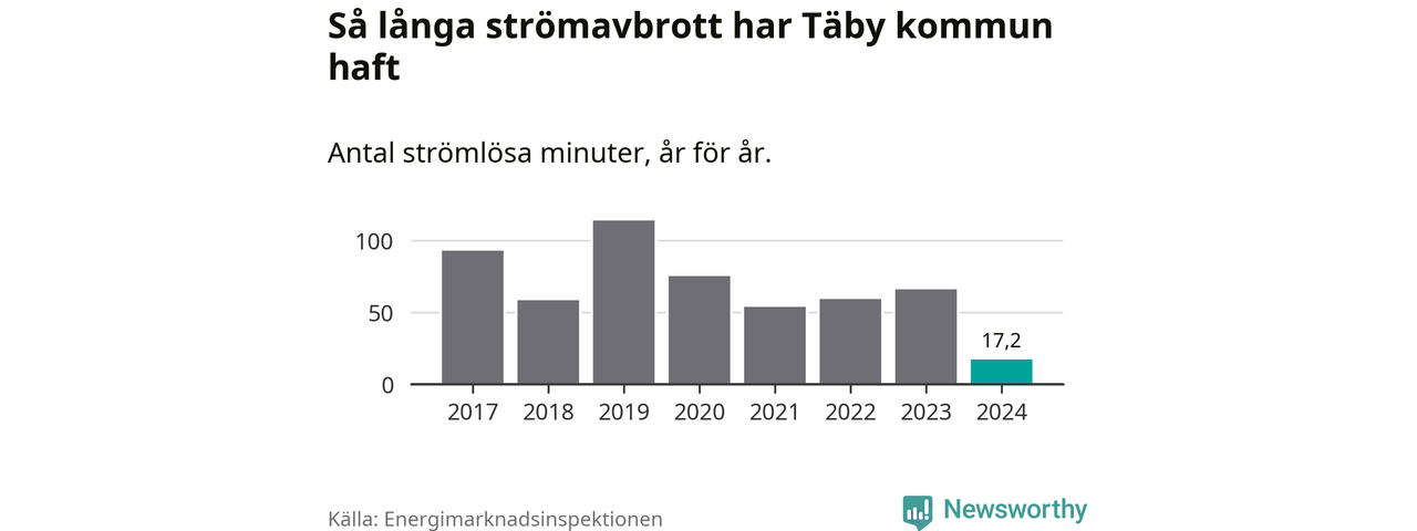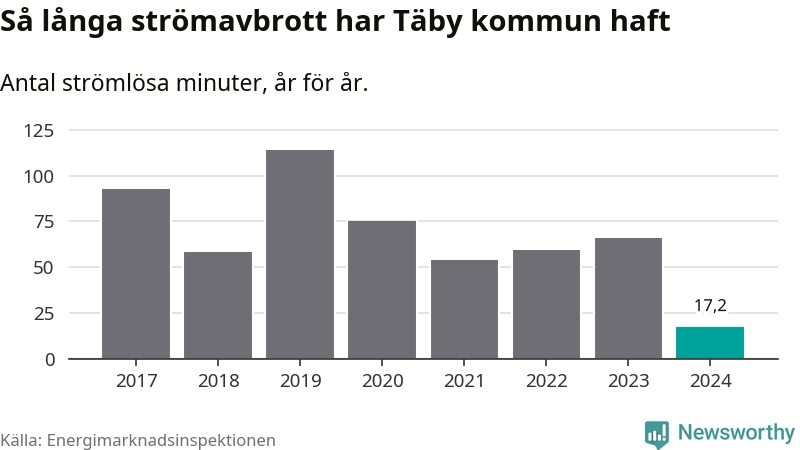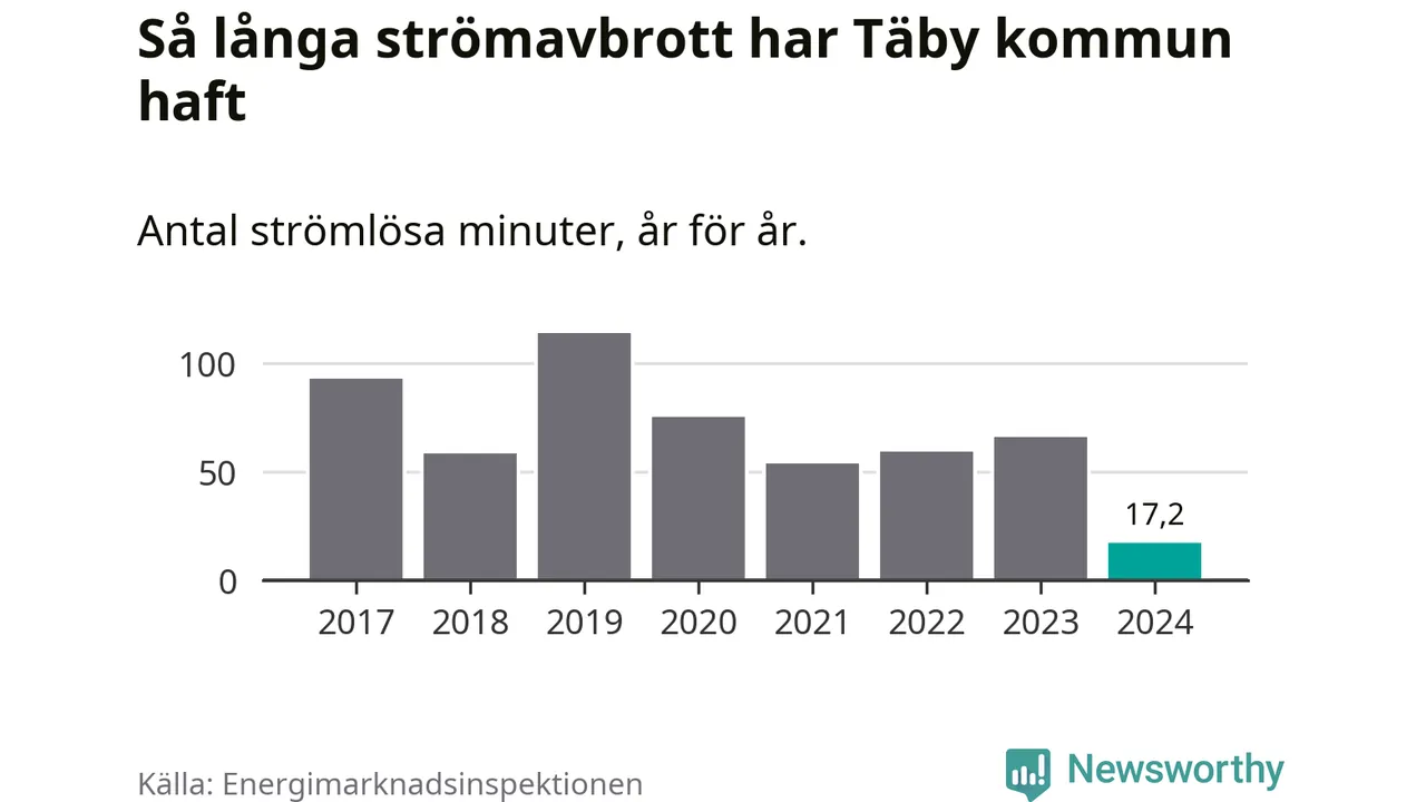 Antalet strömavbrott och total strömlös tid varierar något från år till år i Täby kommun. Mest tid utan ström (i alla fall under perioden 2017–2024) fick Täbyborna genomleva under 2019 – en timme och 54 minuter. Det är 51 minuter längre än under ett normalår.