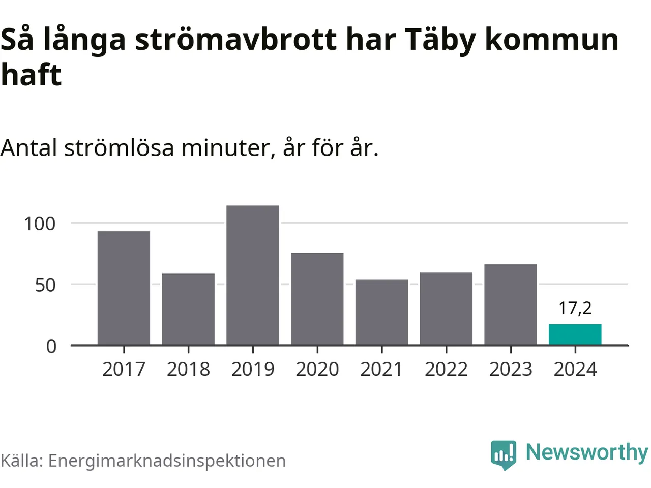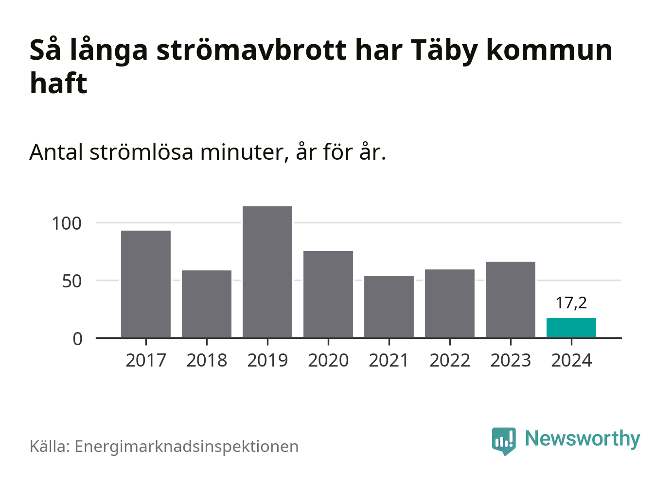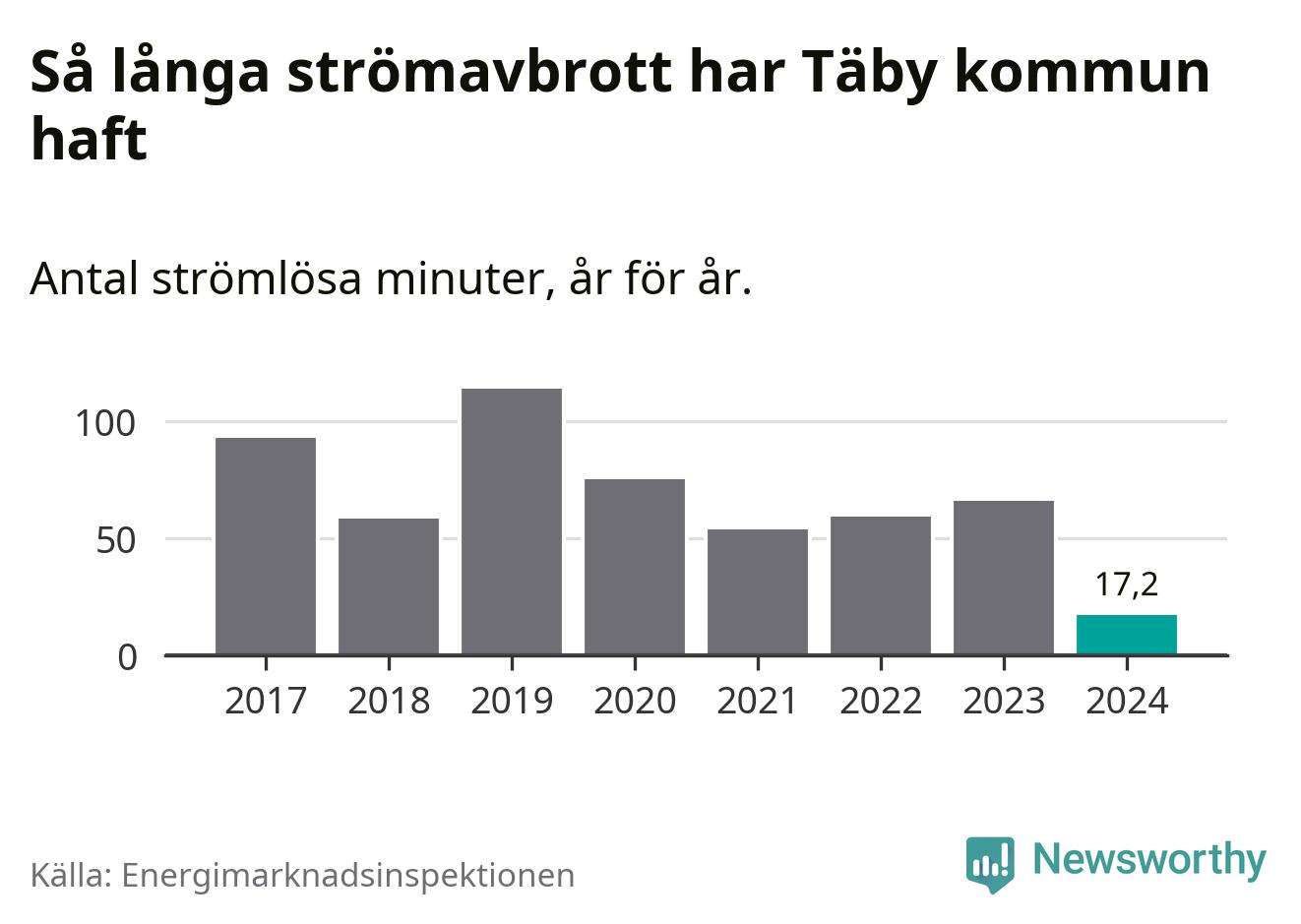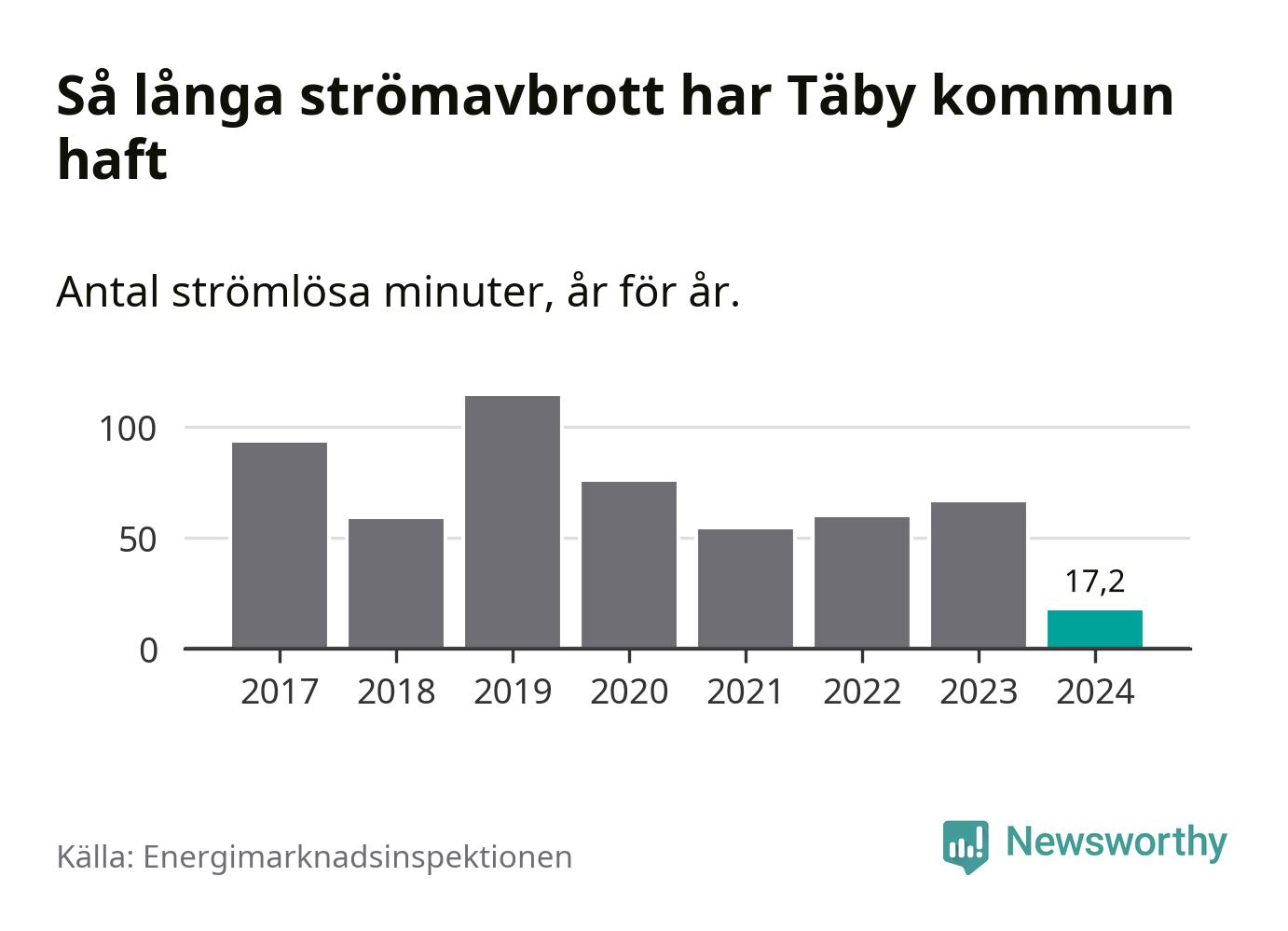 Antalet strömavbrott och total strömlös tid varierar något från år till år i Täby kommun. Mest tid utan ström (i alla fall under perioden 2017–2024) fick Täbyborna genomleva under 2019 – en timme och 54 minuter. Det är 51 minuter längre än under ett normalår.