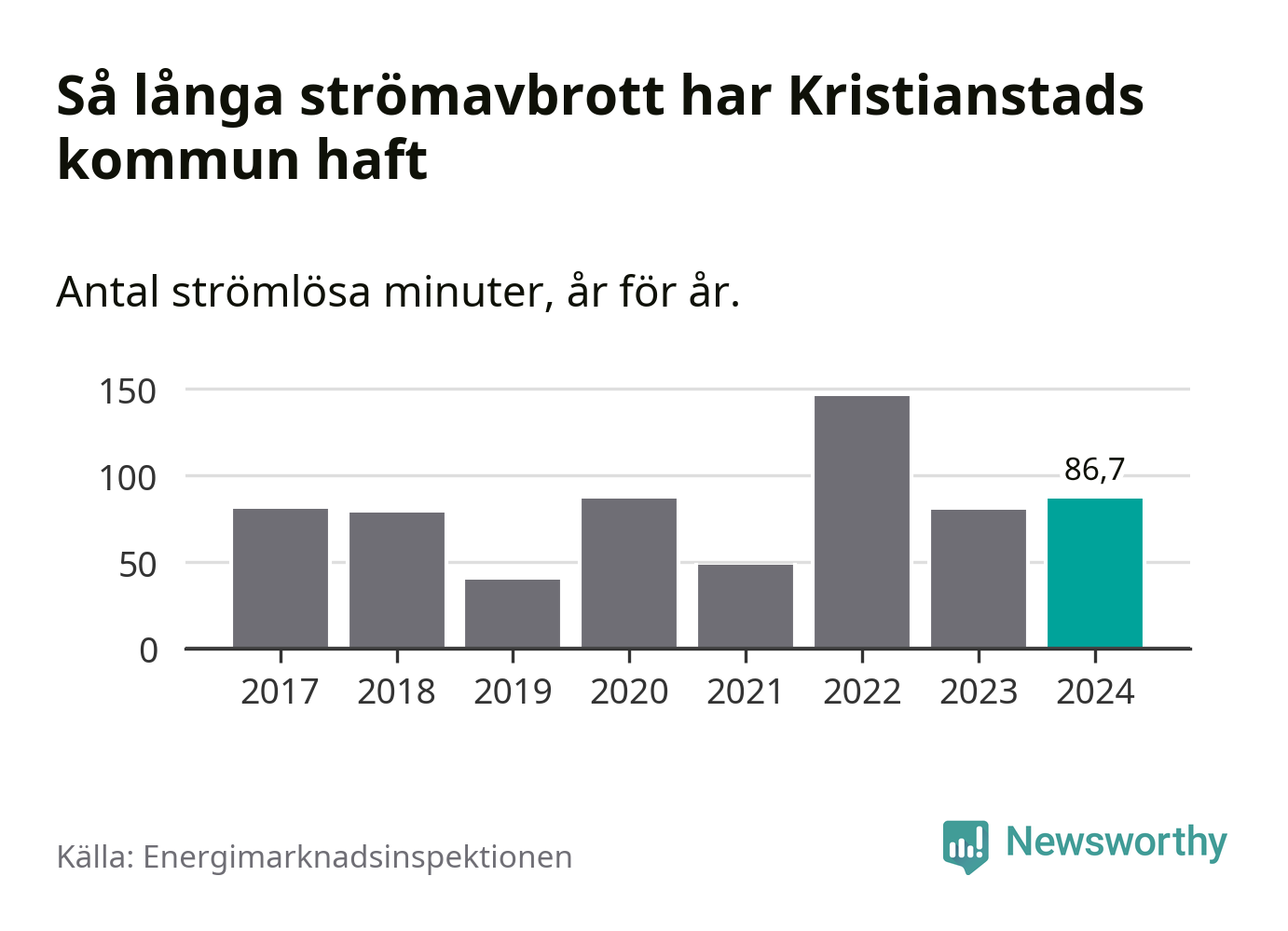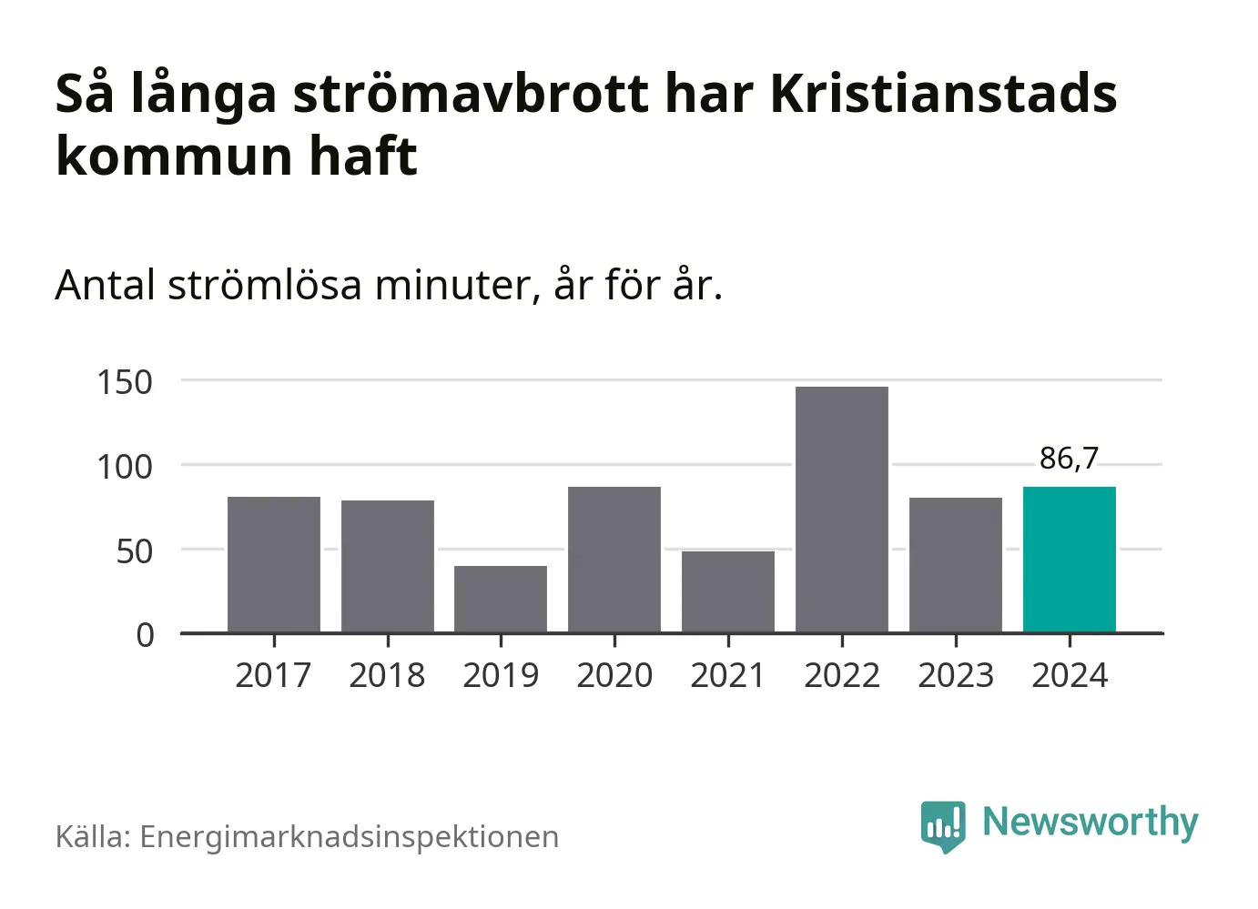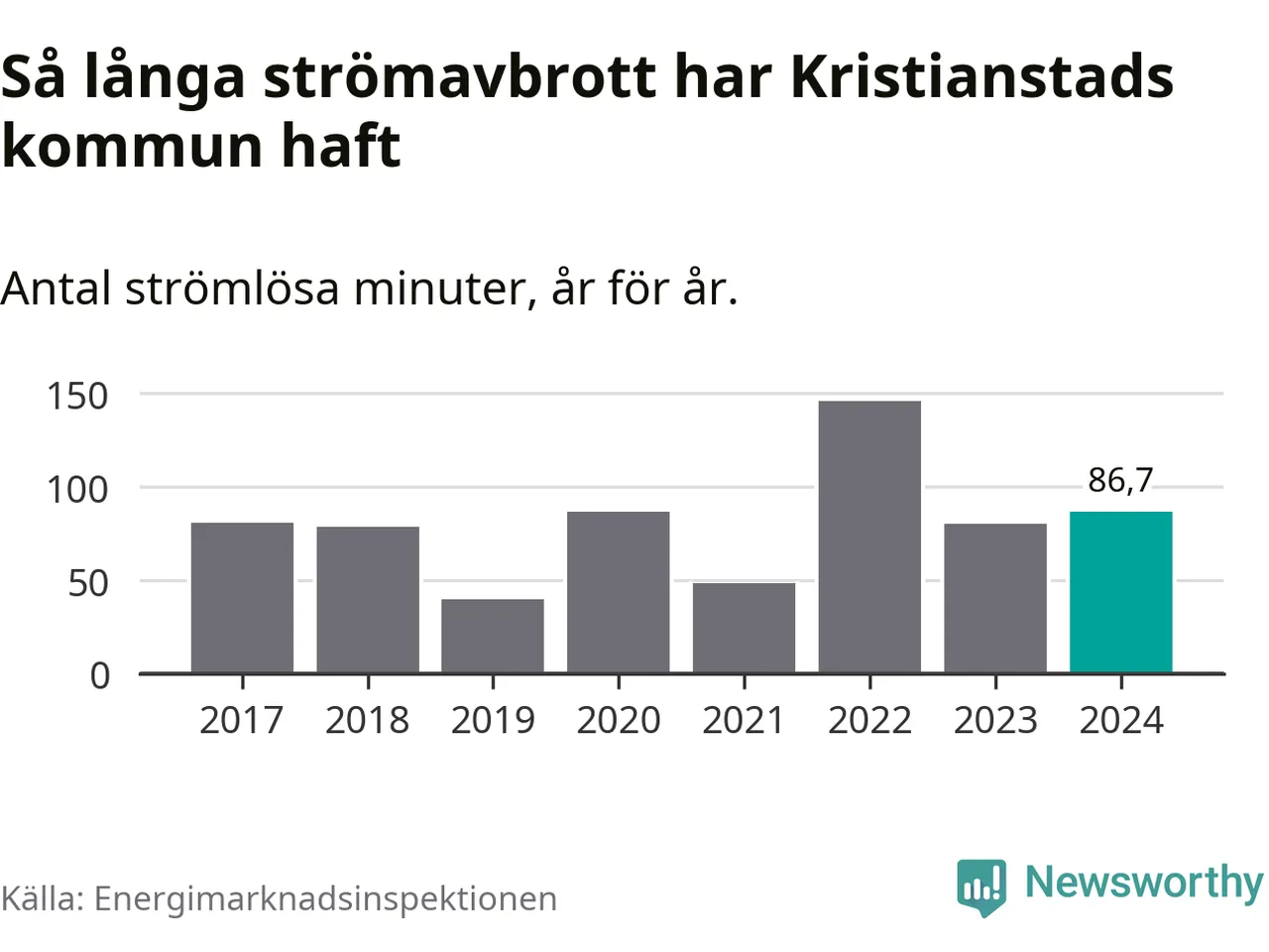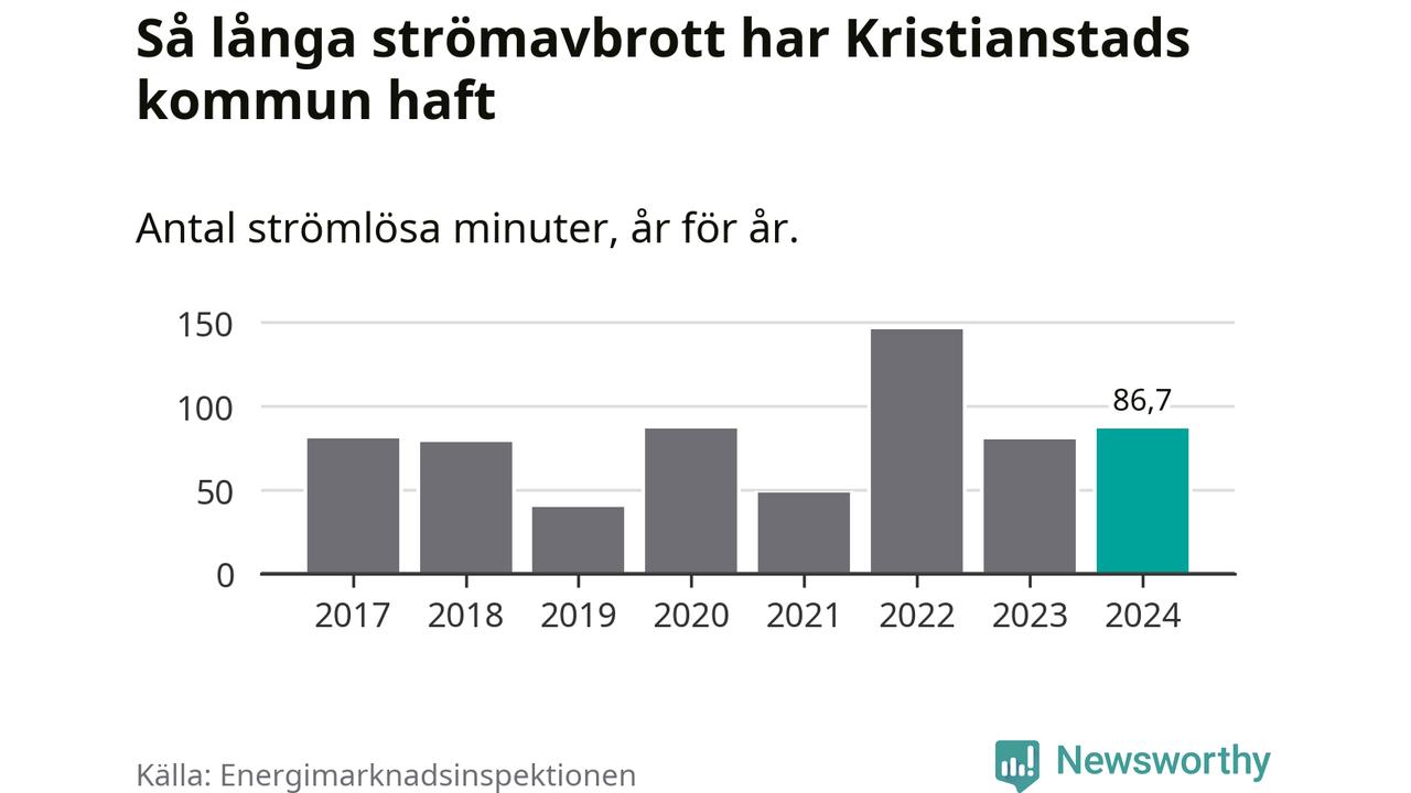 Antalet strömavbrott och total strömlös tid varierar något från år till år i Kristianstads kommun. Mest tid utan ström (i alla fall under perioden 2017–2024) fick Kristianstadsborna genomleva under 2022 – två timmar och 26 minuter. Det är en timme och sex minuter längre än under ett normalår.