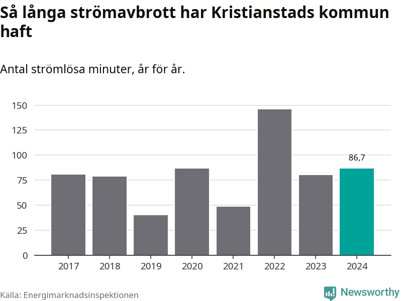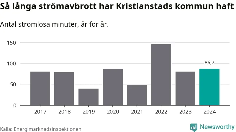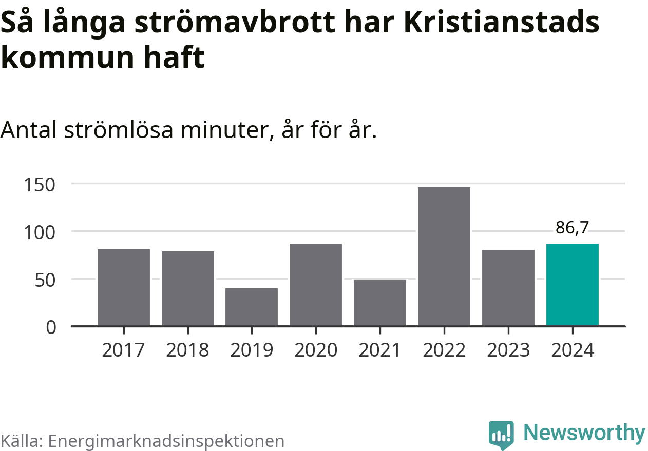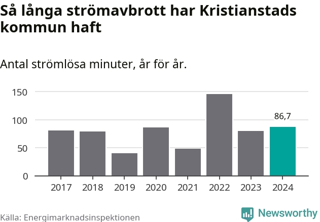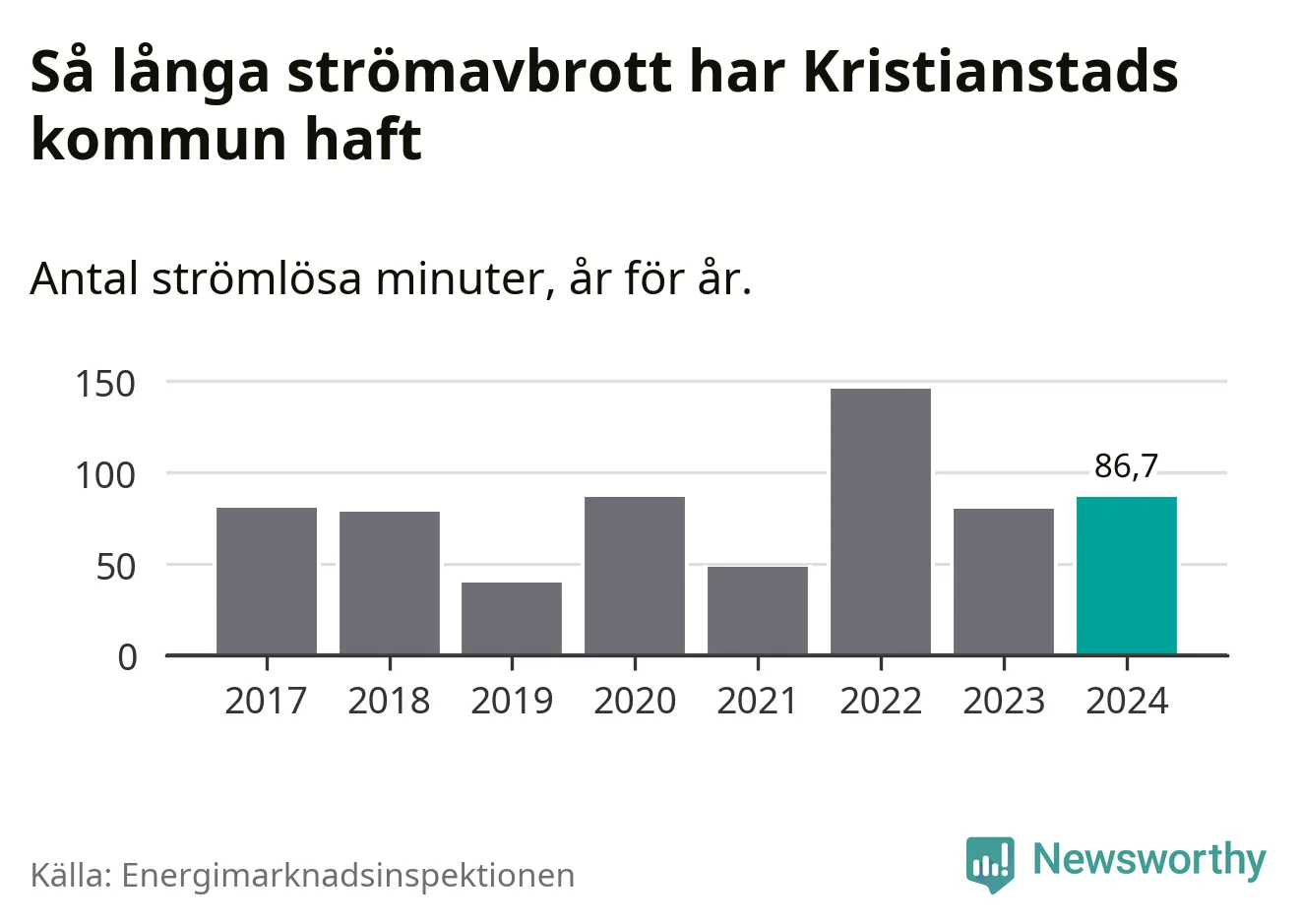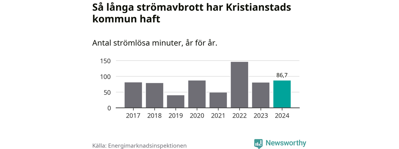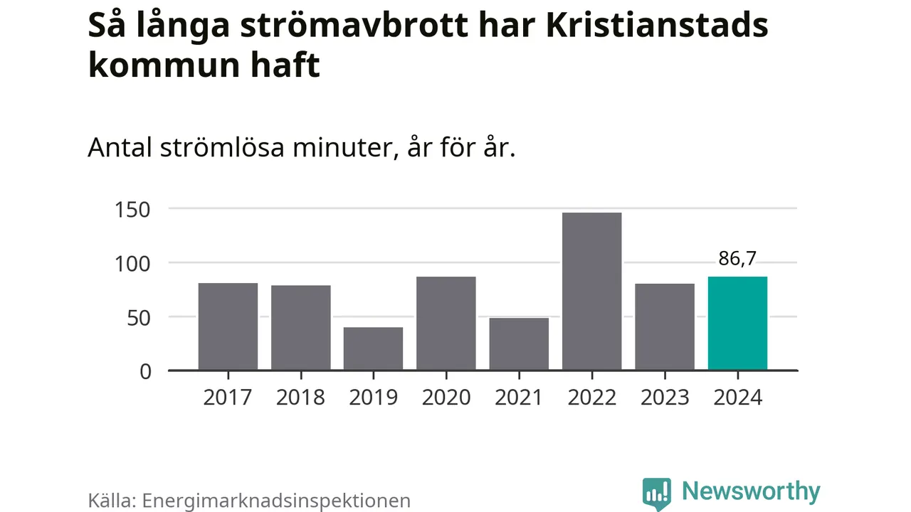 Antalet strömavbrott och total strömlös tid varierar något från år till år i Kristianstads kommun. Mest tid utan ström (i alla fall under perioden 2017–2024) fick Kristianstadsborna genomleva under 2022 – två timmar och 26 minuter. Det är en timme och sex minuter längre än under ett normalår.