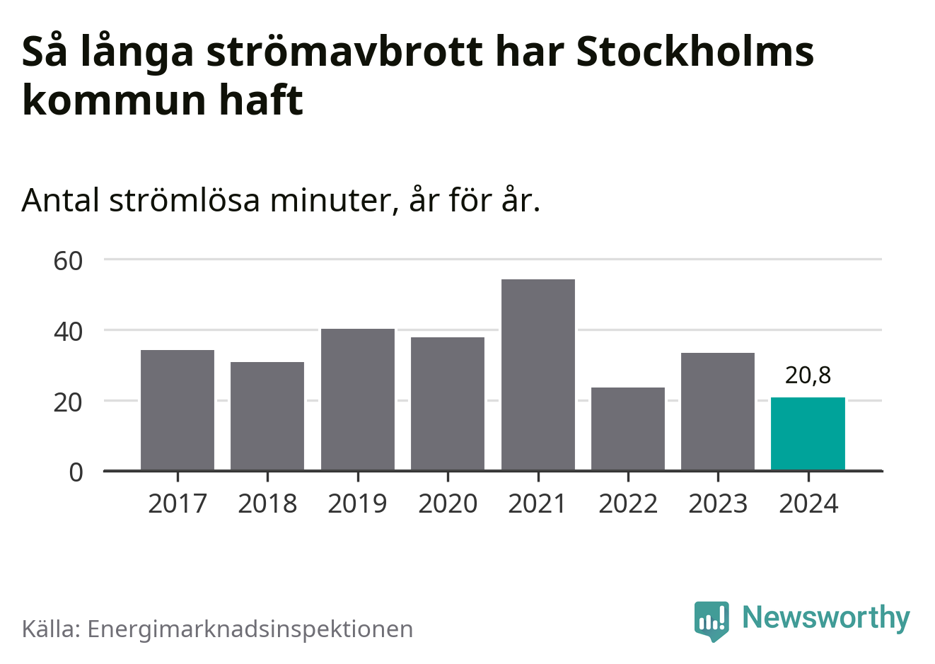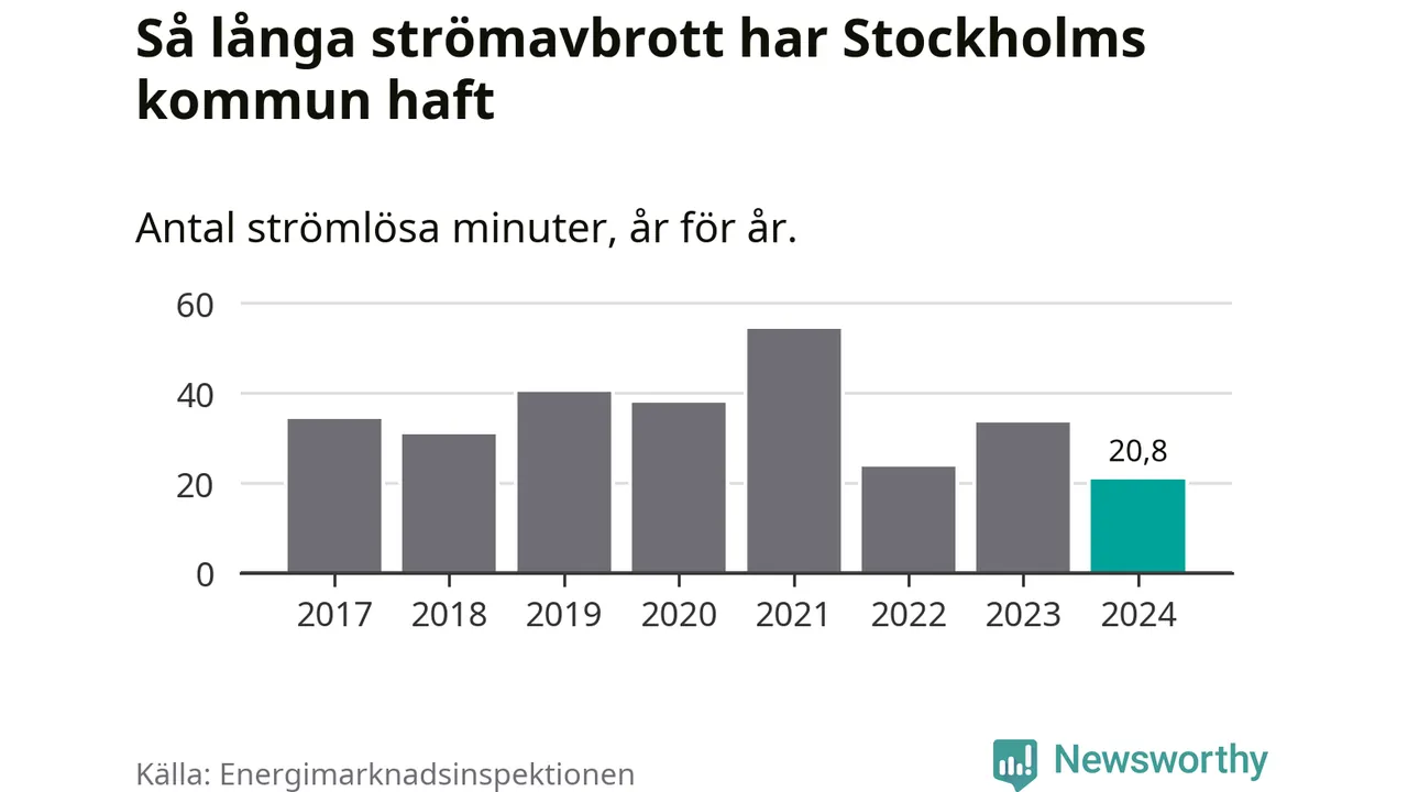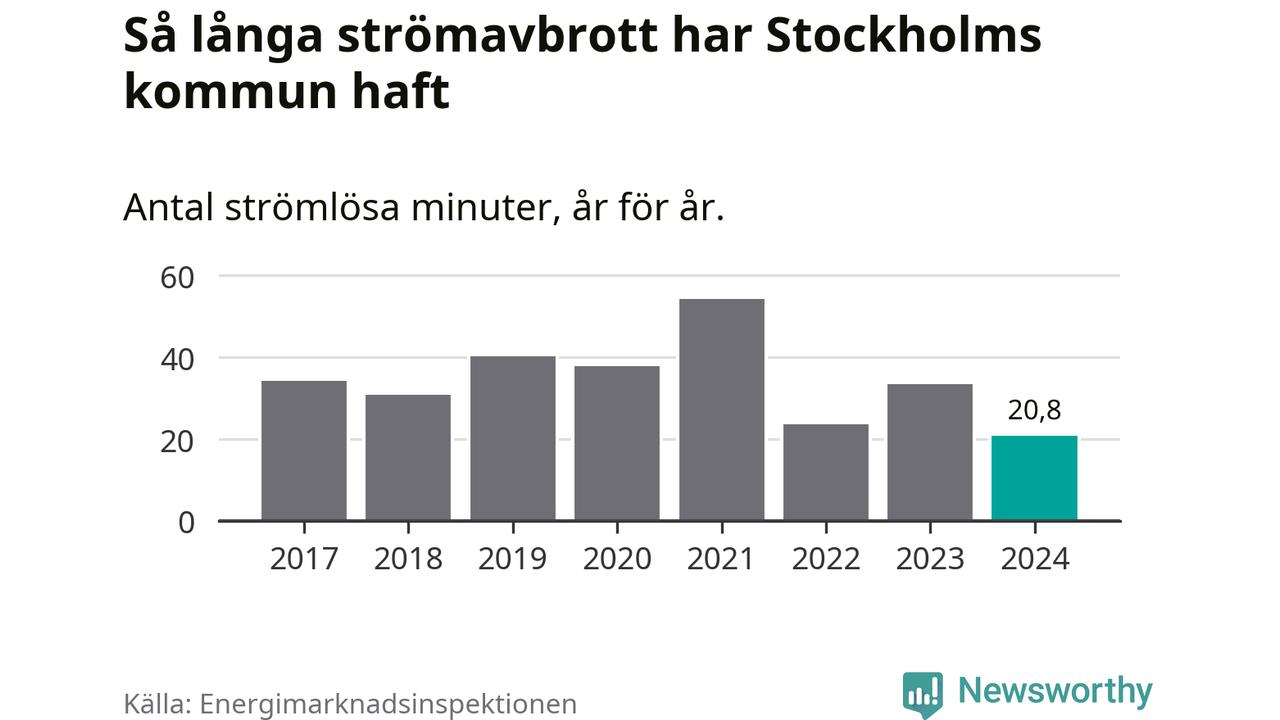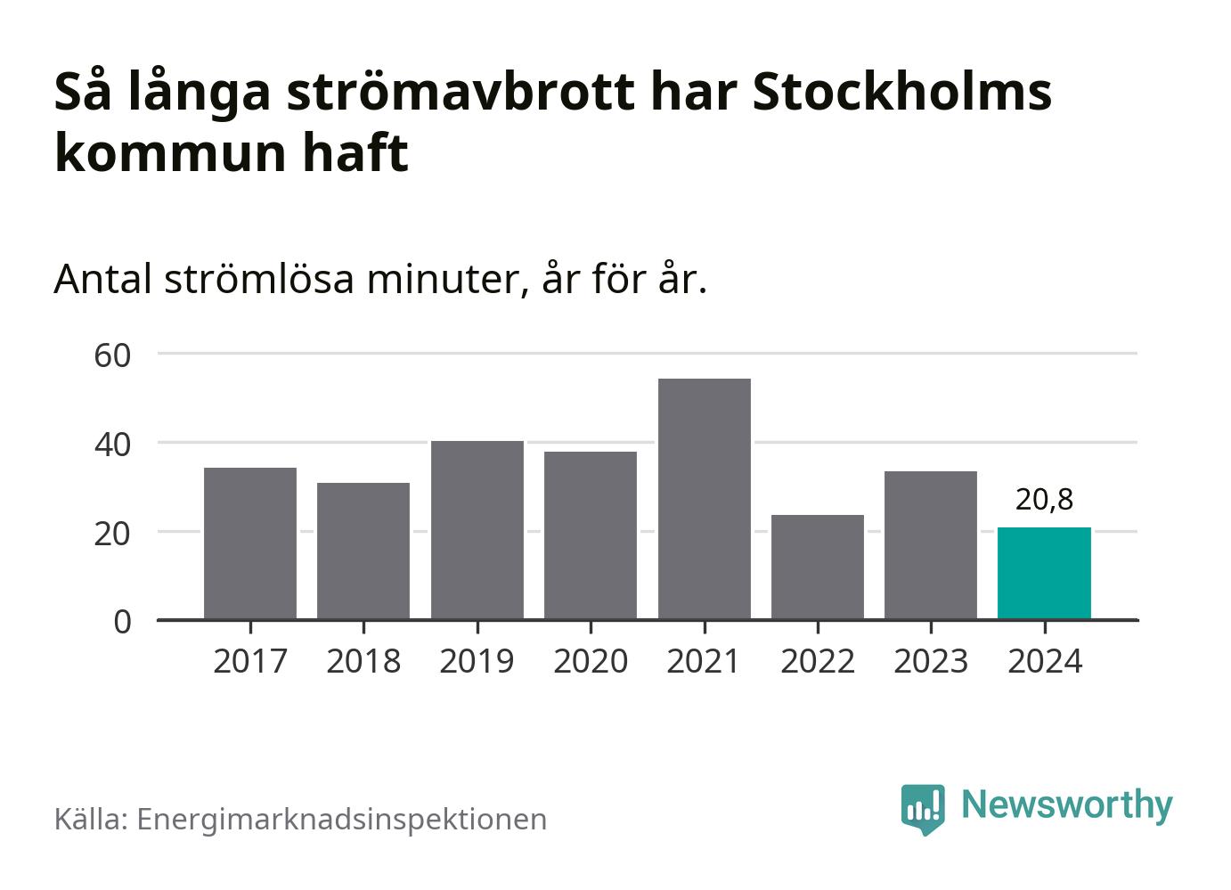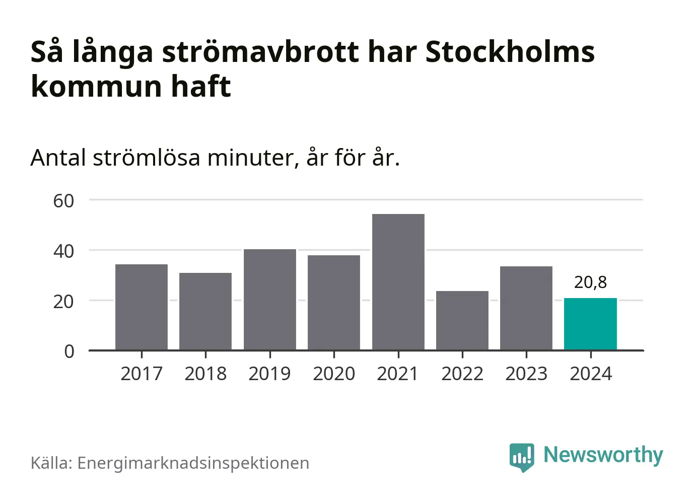 Antalet strömavbrott och total strömlös tid varierar något från år till år i Stockholms kommun. Mest tid utan ström (i alla fall under perioden 2017–2024) fick stockholmarna genomleva under 2021 – 54 minuter. Det är 21 minuter längre än under ett normalår.
